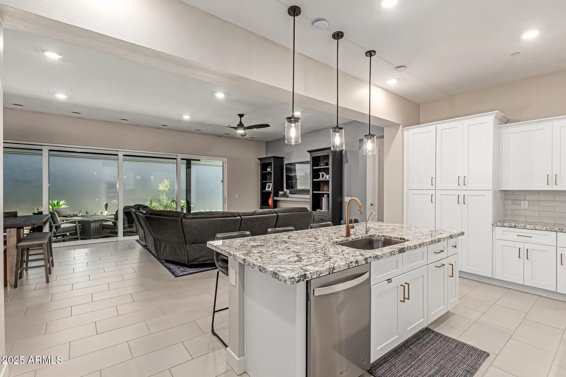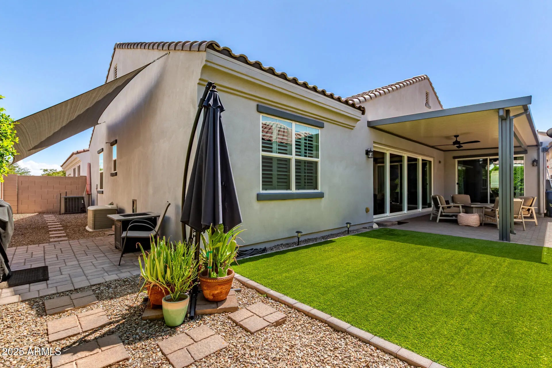 Must see single-level home in La Valencia, S. Chandler located on a private interior lot away from street noise! This 3bd/2.5ba/2cg features an open, modern floor plan with 10' ceilings, plantation shutters, stylish gold hardware, designer lighting, custom paint, tile throughout main areas. A 20' multi-slide door fills the space with natural light. Gourmet kitchen boasts SS appliances including professional grade built-in fridge/freezer, granite counters, subway backsplash, white shaker cabinets w/gold hardware, walk-in pantry, island w/breakfast bar. Main suite has patio access, dual sinks & walk-in closet. Private yard with artificial turf, extended pavers/patio-ideal for relaxing & BBQs! Very efficient with high end HVAC system and Spray Foam in walls/attic. Epoxy garage w/220 for car Welcome to this must-see, beautifully maintained single-level home located on a private interior lot in the highly desirable La Valencia community in South Chandler. This spacious 3-bedroom, 2.5-bathroom, 2-car garage residence perfectly blends modern style with functional comfort while offering peaceful living away from street noise. The open floor plan features soaring 10-foot ceilings, plantation shutters, stylish gold hardware, designer lighting, custom paint, and tile throughout the main areas. A 20-foot multi-slide door floods the living space with natural light and opens seamlessly to a private backyard with low-maintenance artificial turf and extended paversideal for relaxing and entertaining. The gourmet kitchen is equipped with stainless steel appliances including a professional-grade built-in fridge/freezer, granite countertops, subway tile backsplash, white shaker cabinets accented with gold hardware, a walk-in pantry, and a spacious island with breakfast bar. The luxurious main suite boasts private patio access, dual sinks, and a generous walk-in closet. Additional features include a high-end HVAC system with spray foam insulation for energy efficiency, an epoxy-coated garage with a 220-volt outlet perfect for electric vehicle charging or power tools, a custom iron security screen door, and ample storage throughout. This low-maintenance, lock-and-leave home offers peace of mind with the HOA taking care of your front yard, plus access to a community pool for relaxation and recreation. Situated conveniently to Queen Creek, downtown Chandler, and Gilbert, this home provides easy access to shopping, dining, and entertainment, as well as nearby hiking and biking trails at Veterans Oasis Park and San Tan Mountain Park. With spacious master and secondary bedrooms in a quiet, single-level home neighborhood, this exquisite La Valencia residence is not to be missed.