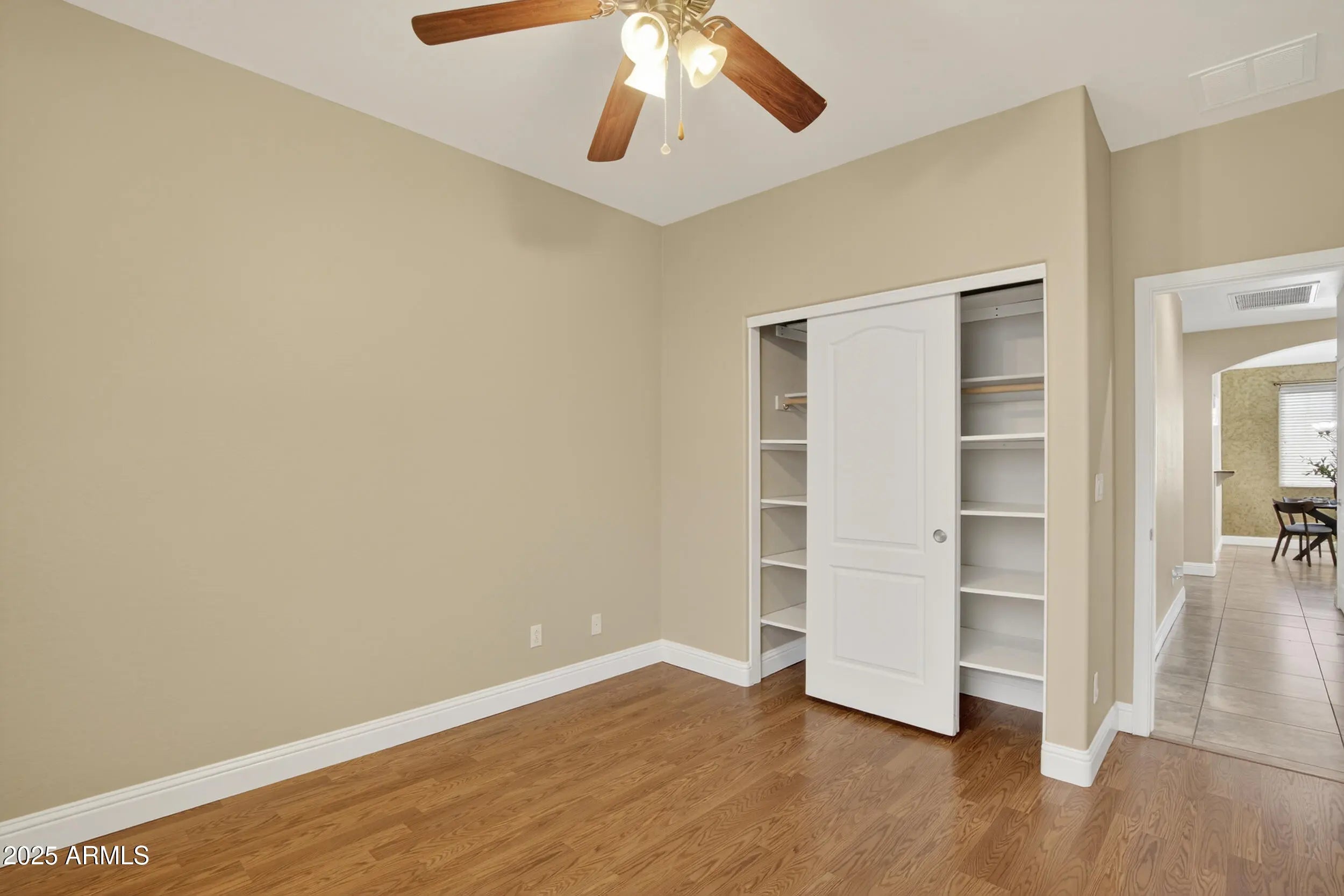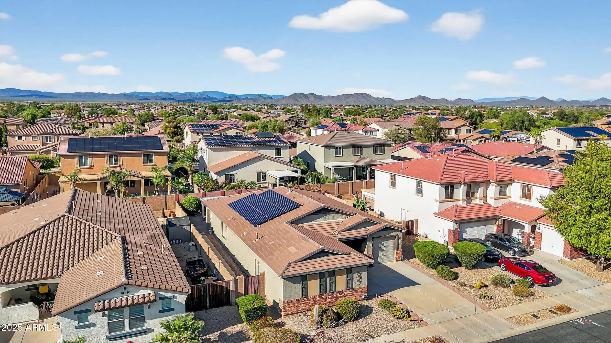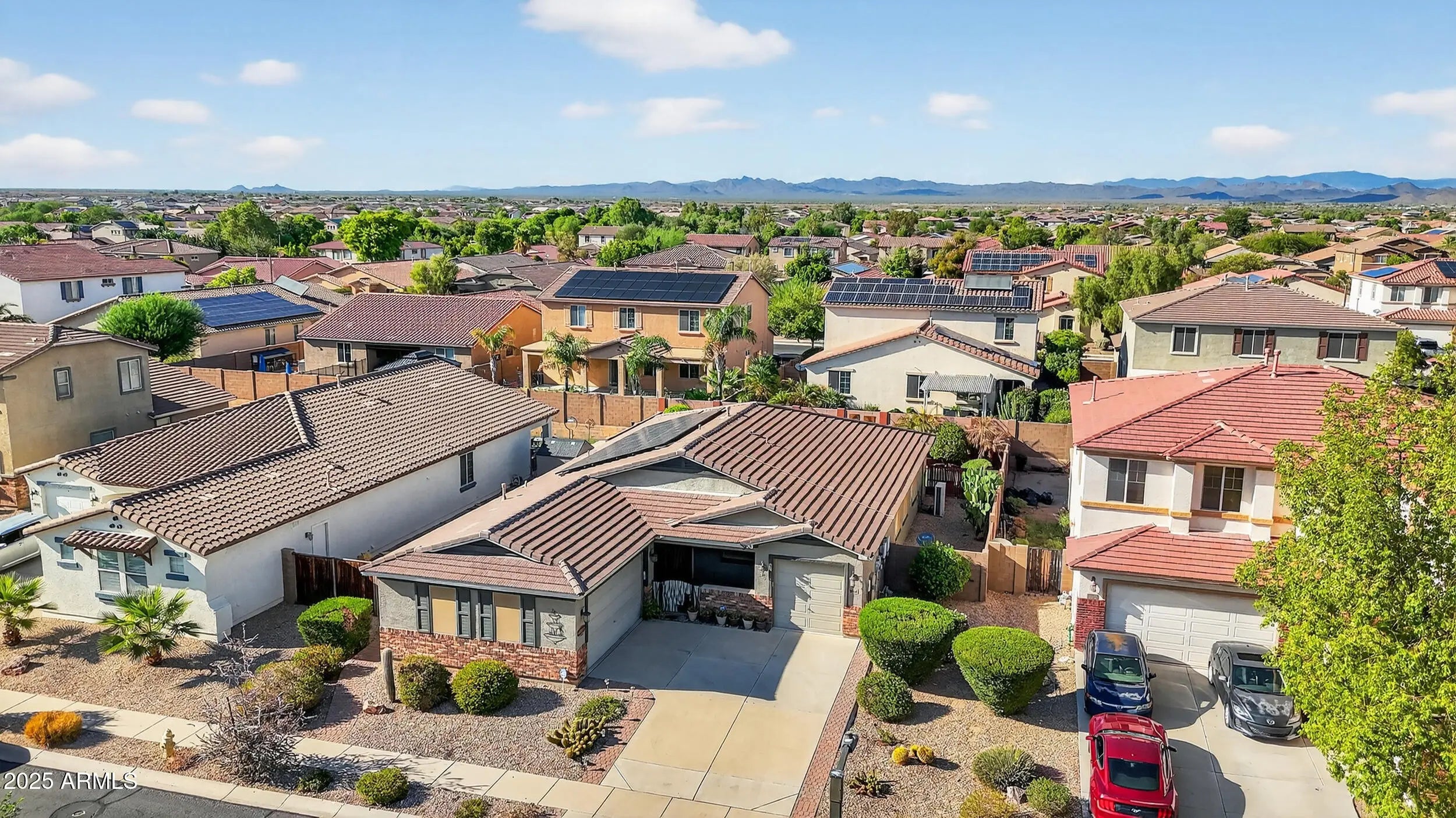 Why wait for new construction when you can have it all right now? Welcome to Desert Oasis a move in ready 4-bedroom, 2-bath home with 2,205 sq. ft. of well designed living space, a finished backyard, and upgrades you won't get with a builder. Step inside to tall ceilings, updated flooring, and an open floor plan that balances space to gather with areas to retreat. The kitchen delivers with granite counters, stainless appliances, and plenty of cabinets; while the updated baths bring a modern touch. The primary suite offers a true retreat with a dual sink vanity, walk-in shower, walk-in soaking tub, and a large walk-in closet. This home is built for comfort and efficiency with a recently replaced HVAC system and solar panels to keep utility costs in check. Both garages (a 2-car and a 1-car) have custom cabinetry already installed, perfect for storage, hobbies, or a workshop setup. Out back, the lifestyle upgrades shine: a putting green, covered patio, and low maintenance landscaping mean you can enjoy the Arizona outdoors from day one with no dust, no waiting on landscapers. All of this comes with community perks like a pool, parks, and schools within walking distance. Simply move in and start living.