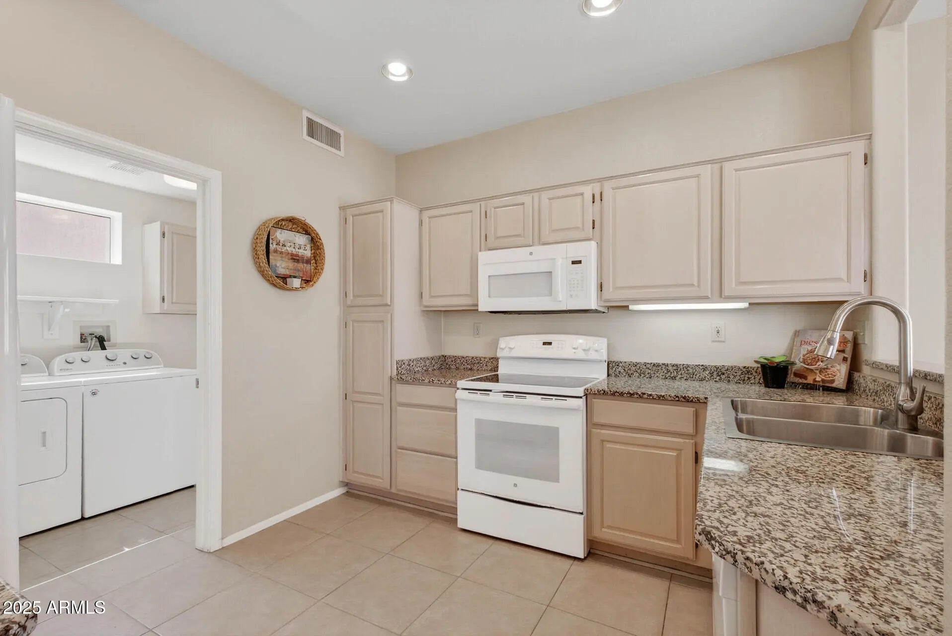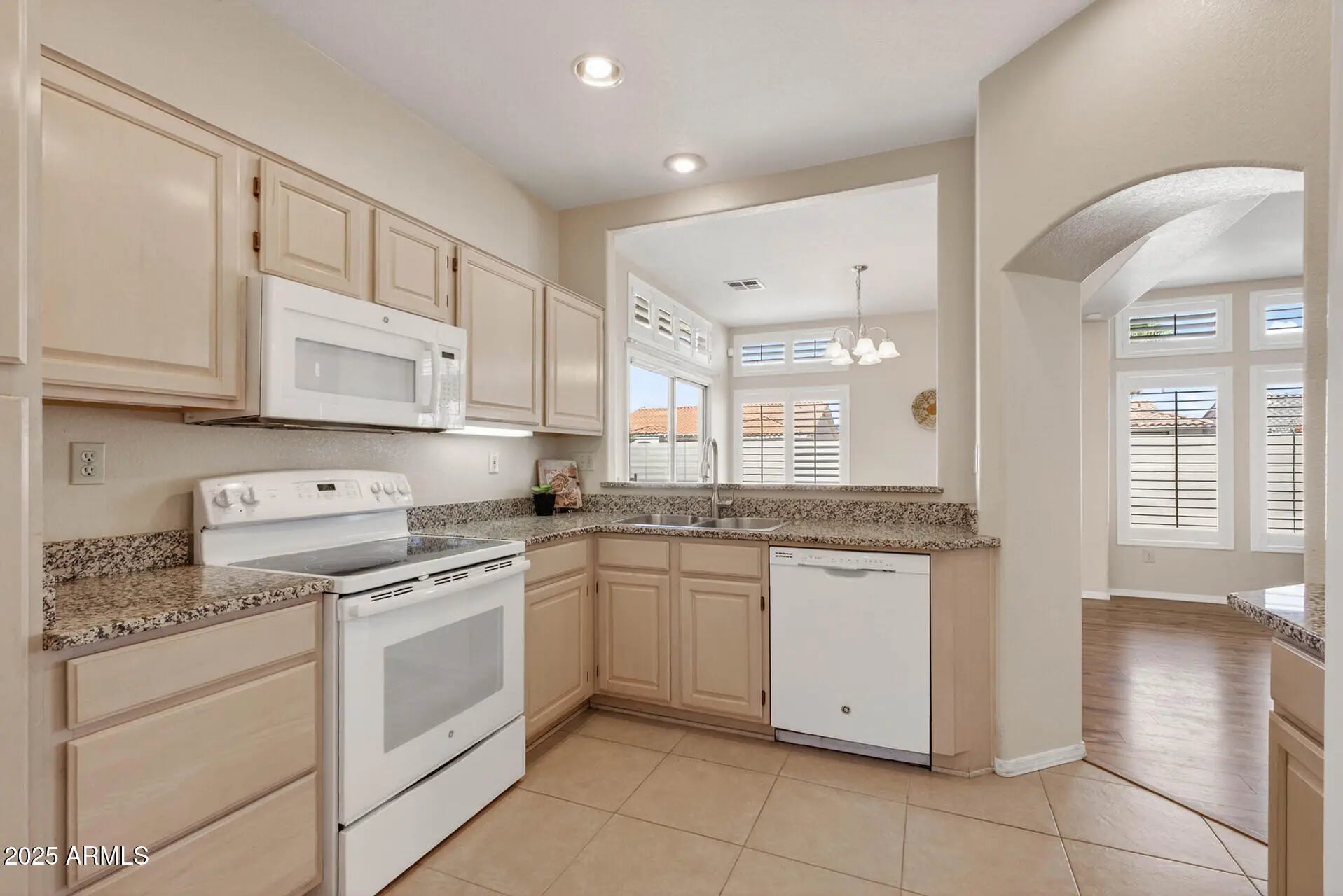 Light, bright and move-in ready! This 1161 SF 2BR/2BA End-Unit Mesa plan welcomes you through an HOA-maintained garden into updated style with hard flooring throughout—tile and warm wood-look in all the right places. The kitchen and baths feature newer granite counters, plus plantation shutters dress nearly every window. An expanded patio and easy-care yard make entertaining a delight. Inside, updates shine with newer doors, trim, hardware, fans/lighting, paint, and appliances. Roof and HVAC (2014) plus an owned security system add peace of mind. Perfect for full-time living or lock-and-leave-ease in this award-winning active adult community—your desert oasis awaits!