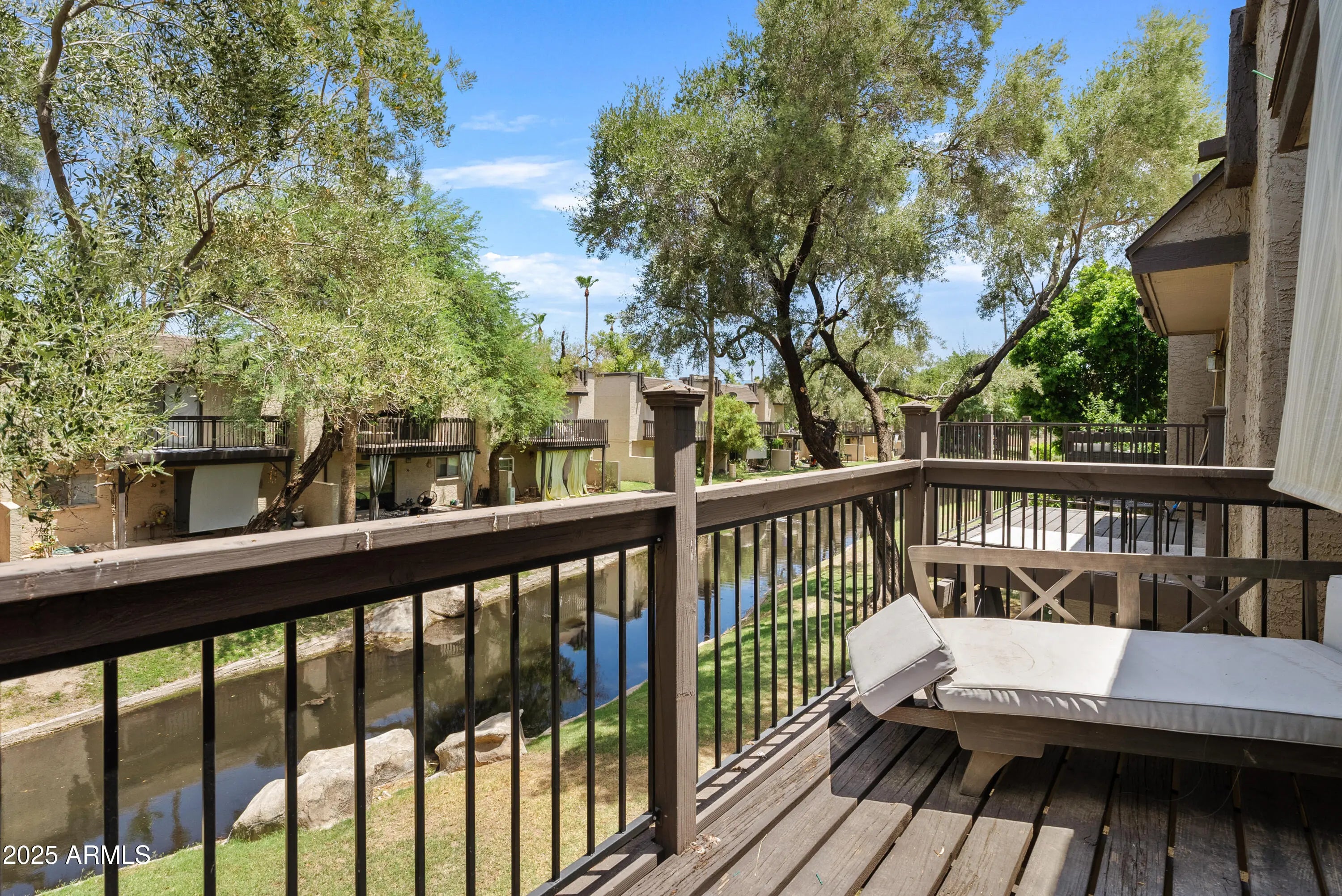 Opportunity for an investor. Tenant occupied, lease ends Oct 2026. Enter your private courtyard to this 2-bedroom, 2.5-bath waterfront home in Dobson Ranch. Both bedrooms are upstairs, including a primary suite with full bath and a balcony overlooking the water. A half bath is located downstairs, along with a covered patio for outdoor living. Features include granite countertops, tile bathrooms, tile floors downstairs, laminate floors upstairs, newer windows and patio doors, and all appliances included. One-car garage plus additional parking. Dobson Ranch amenities include access to lakes, walking and biking paths, community pools, tennis and racquetball courts, parks, playgrounds, and year-round events. Convenient to Hwy 60 and Loop 101. Water, trash and sewer included with HOA.