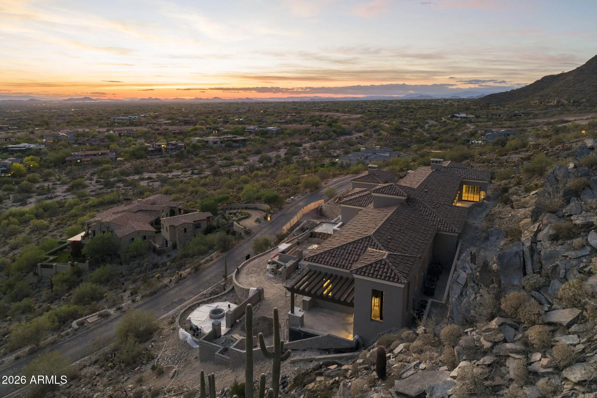 Now just six weeks from completion and ready to view, this remarkable Silverleaf estate is revealing its full beauty. The lights are on, and the warmth of the home is beginning to shine through. Set on a five-acre hillside lot within North Scottsdale's most prestigious community, the residence blends architectural excellence, refined interiors, and breathtaking natural surroundings. Created by the celebrated Silverleaf team of architect Scott Carson, builder Nicholas Development Group, and interior designer Kristin Hazen. The French Mediterranean-inspired estate spans 11,619 square feet. Its light, feminine design includes five en-suite bedrooms, three half baths, and two laundry rooms. Expansive balconies on main and upper levels frame sweeping mountain views and glowing Arizona sunsets. The upper patio and trellised garden offer shaded north facing tranquility, hugging the mountain, and ideal for a rose garden or secure outdoor space for pets. Thoughtfully designed for both business and leisure, the home includes offices on the main and upper levels, providing elegant spaces for productivity and privacy. The lower level features a wine-tasting room, movie theater, and game room--perfect for entertaining guests or enjoying quiet evenings at home. A private drive leads to an impressive garage accommodating eight to sixteen vehicles--or a mix of cars and an indoor pickleball court, the driveway continues to the front door with guest parking for three further vehicles. The main and upper-level guest wing offers four split en-suite bedrooms, as well as a private entrance, entertainment lounge, a reading room, and gym, private upper balcony, and a fire pit terrace with 180-degree valley views. Outdoors, the resort-style pool includes a hot tub, baja shelf, and expansive entertainment patio--perfect for alfresco dining and taking in the beauty of the Sonoran landscape. Arrive at sunset to truly appreciate its beauty and unique setting.