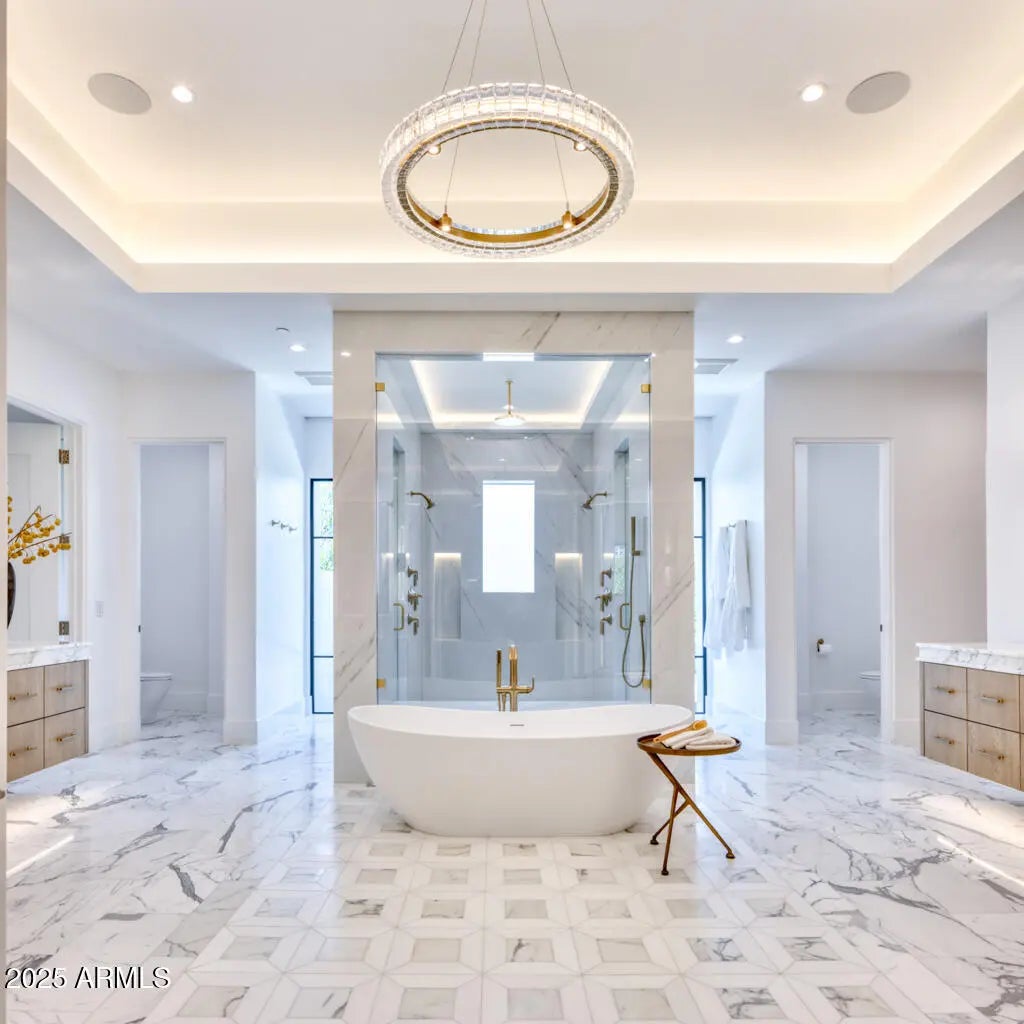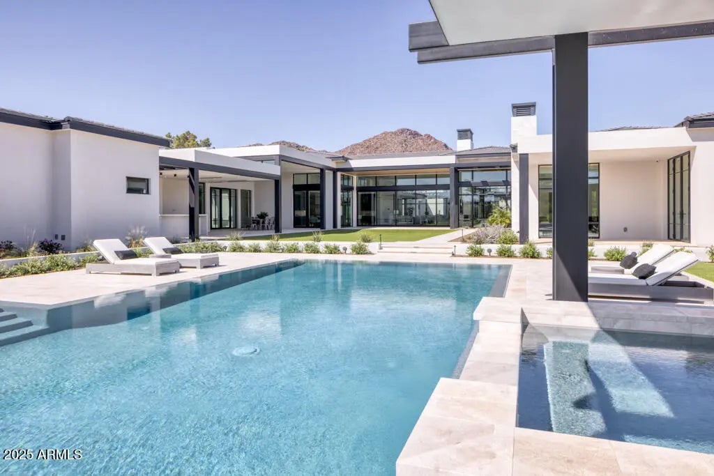 Completed in November 2024, this 11,626 sqft 7 bed, 9 bath, architectural estate w/ beautiful views of Camelback Mtn. is a study in serenity, scale + sculptural design. Set behind dual gates on 2.5 PRIVATE MANICURED ACRES, the home blends clean lines w/ warm materials-softened parallel steel beams, rich wood ceilings+stone accents-creating seamless indoor-outdoor harmony. Grand yet approachable, the layout flows around a central great room w/disappearing glass walls that lead the eye to the horizon, beyond patios to a centerpiece seamless infinity pool that reflects the mirrored sky, with enormous lawns + lighted tennis court beyond. The thoughtful open layout separates wings for the primary, family, and guests, + separate detached guest home + 1,415sf bar/theater/entertainment building. Elevated office floats above it all, capturing full-frame views of Camelback Mountain, the Praying Monk, and Mummy Mountain. Luis Bonilla, the renowned architect ,designed this elegant home. A private well services the lush specimen landscaping, leading to very little water bill for plant upkeep.