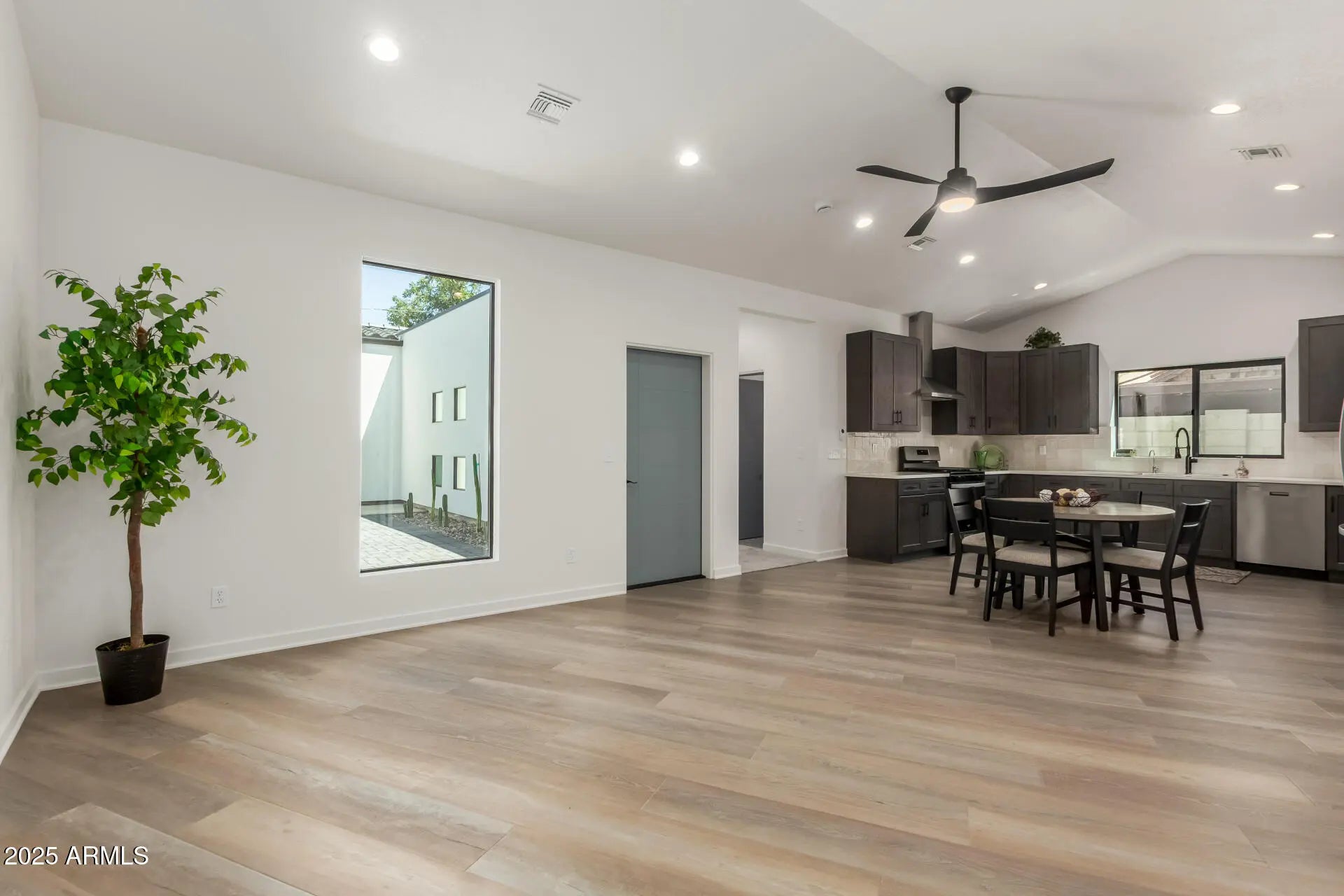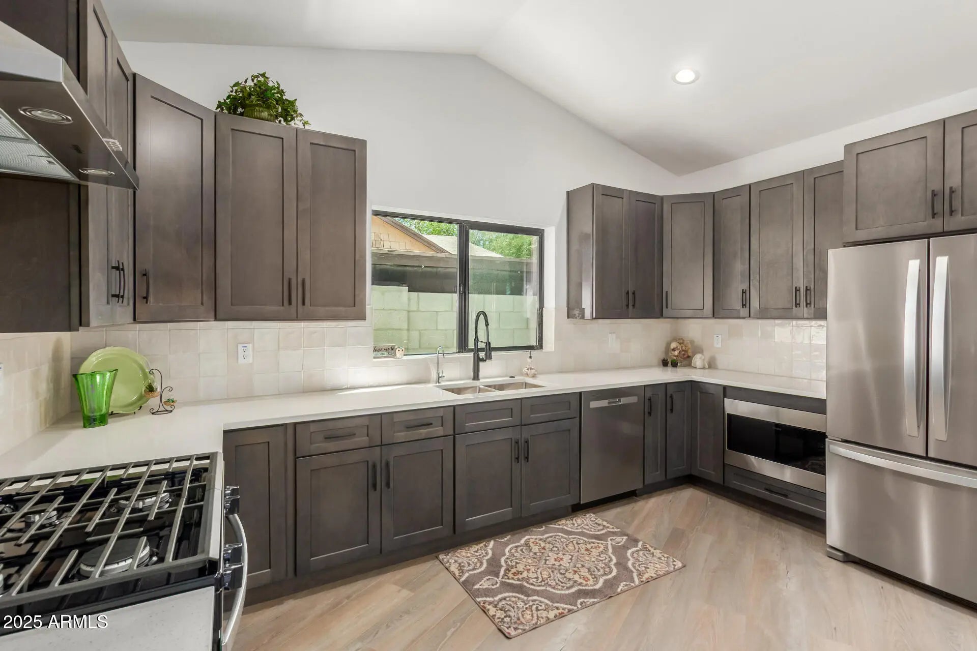 ''HONEY, STOP THE CAR!'' Welcome to this stunning 1,507 sq. ft. new construction contemporary home, where modern design, quality finishes, and a prime location come together beautifully. From the smooth stucco exterior and upgraded garage doors to the low-maintenance desert landscaping with decorative rock, drip irrigation, and a new block privacy fence, every detail has been thoughtfully crafted. The backyard features a spacious paver patio, perfect for entertaining or relaxing outdoors. INSIDE, you'll love the open-concept layout with vaulted ceilings and durable waterproof laminate flooring in the living, dining, and kitchen areas. A spacious front entry provides the ideal spot for a desk or entry table, and 9-foot ceilings throughout the bedrooms, bathrooms, and hallway create a modern, airy feel. Abundant natural light flows through well-placed windows, enhancing the bright and welcoming atmosphere. THE DESIGNER KITCHEN IS A SHOWSTOPPER, featuring: Medium-tone soft-close cabinetry, light & bright quartz countertops, stylish white tile backsplash, stainless steel appliances, including a gas range, side-by-side refrigerator, and under-counter RO water filtration system for fresh clean drinking water. THE LAUNDRY ROOM COMES FULLY EQUIPPED with a new washer and dryer, tile floor, ample cabinetry, and a quartz folding counter for added convenience. BOTH BATHROOMS OFFER A TOUCH OF LUXURY with dual sinks, quartz counters, custom LED mirrors, tile floors, and tile surround in both the shower and tub areas. ADDITIONAL UPGRADES INCLUDE a spacious walk-in closet in main bedroom, a tankless water heater, natural gas stub for BBQ on back porch, and sleek black hardware throughout, giving the home a cohesive and modern finish. LOCATION IS KEY, AND THIS HOME DELIVERS - just half a block from the local elementary school and within walking distance (or a quick 3-4 minute drive) to Grand Canyon University, making it an ideal spot for families, students, faculty, or investors alike. CALL TODAY TO SCHEDULE YOUR PRIVATE SHOWING - HOMES LIKE THIS DON'T LAST LONG!