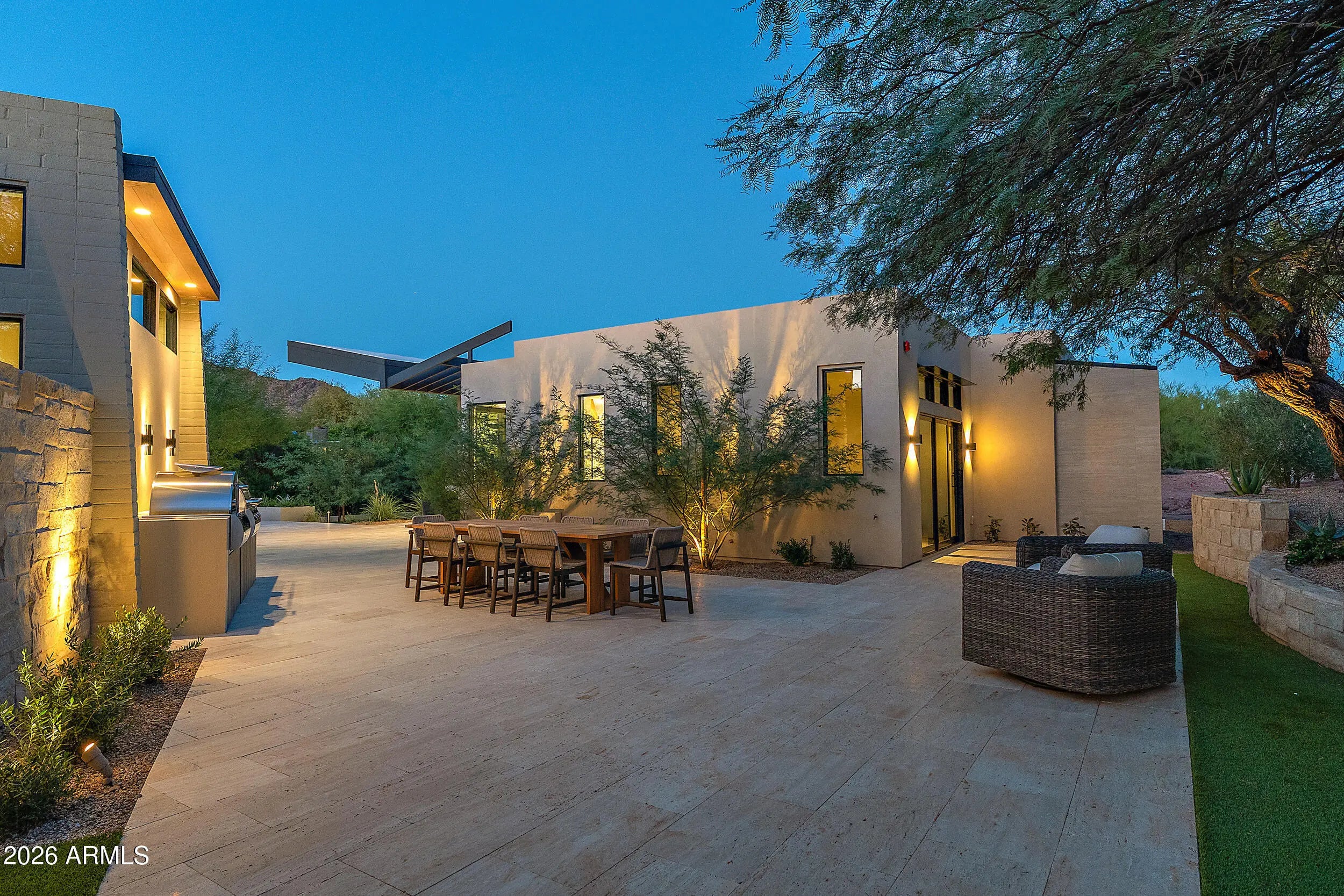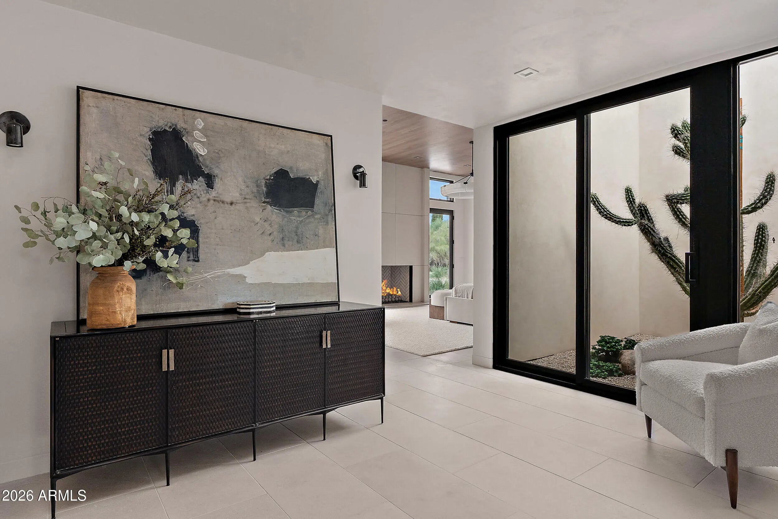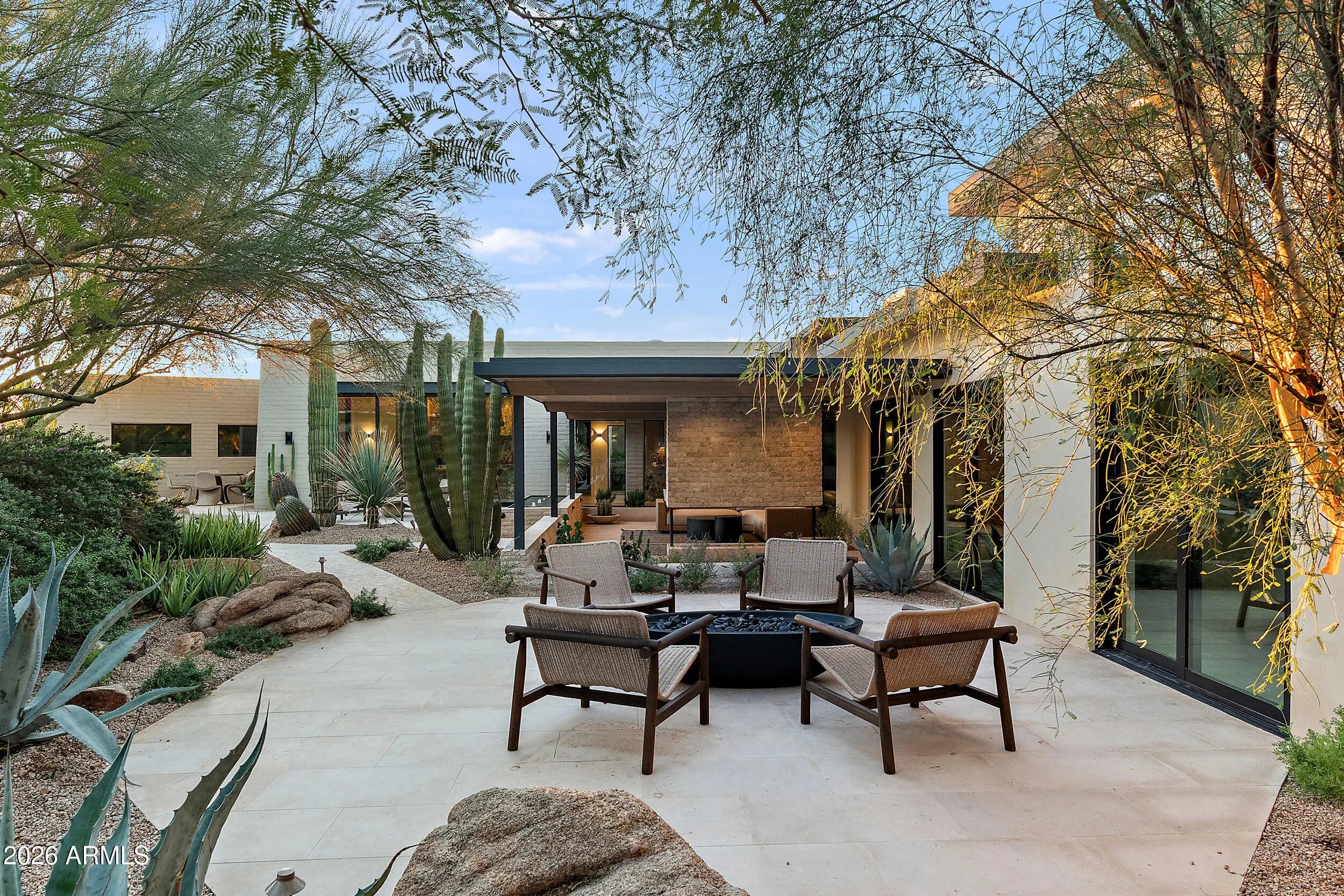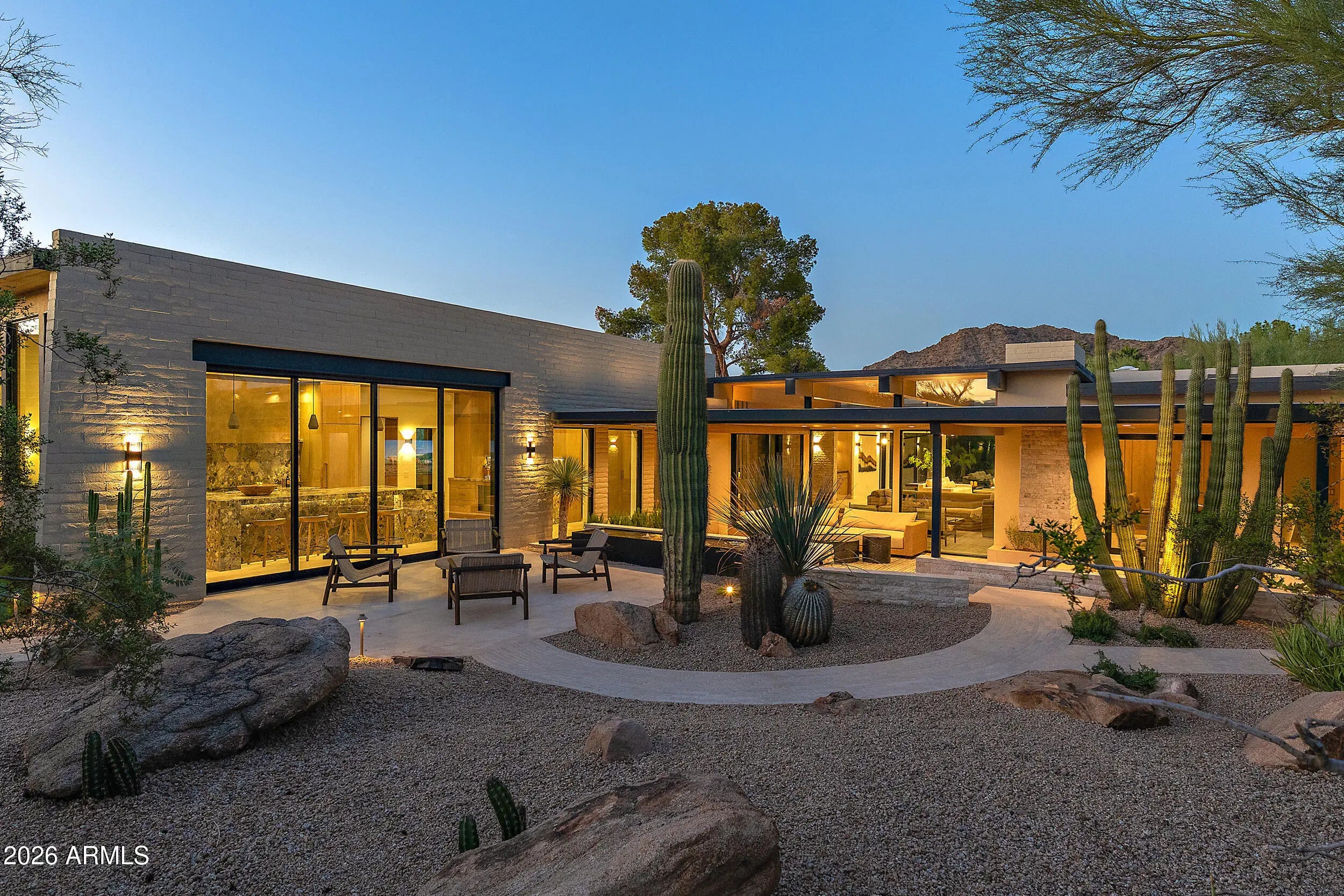 Just completed is a unique, sophisticated new-build by world renowned interior designer Erinn V, in collaboration with Erik Peterson/PHX Architecture. The estate represents a rare fusion of Arizona mid-century architecture, design heritage, & contemporary luxury in Paradise Valley's most desired location, with majestic views of Camelback, Mummy & Phoenix Mountain Preserve. The 1-acre estate includes 7170 sq ft of living space across the main & guest house with walls of glass capturing majestic mountain views & skylights flooding the interiors with natural light. Exceptional workmanship & top-quality materials include honed, oversized limestone flooring, bleached white oak ceilings, custom walnut millwork, Roman clay finishes, custom stonework & natural imported stone countertops. Enjoy the outdoors with lush landscaping, water fountains, and abundant seating areas that create a resort-like setting, while the 40' x 18' zero-edge pool and spa provide a centerpiece for leisure and entertaining. The main house features an impressive Chef's kitchen with walls of glass showcasing up-close views of iconic Camelback Mountain. Designed for both beauty and functionality, the kitchen is equipped with Monogram appliances, custom hand-finished walnut cabinets with white bronze pulls, butler's pantry and stone island clad in Ceppo Breccia slabs from Italy. Oversized sliding doors open the kitchen to a patio with fire features, a water feature and outdoor TV surrounded by beautiful lush desert landscaping. For outdoor cooking and entertaining, the estate offers two BBQ areas (one off the kitchen and another by the guest house), outfitted with professional-grade FireMagic grills and a pizza oven. The owner's suite exudes a tranquil ambiance, highlighted by two private Zen gardens and a striking limestone fireplace. Blending elegance with functionality, it offers dual walk-in closets with custom Walnut floor to ceiling cabinetry and stone countertops, along with the convenience of a full-size washer and dryer. A secondary junior owner's suite adds versatility to the floorplan, easily accommodating use as a guest retreat, game room, fitness space, or den with mountain views. The private office makes a bold statement with bleached walnut millwork, built-in shelving, and expansive windows that frame breathtaking views of Camelback Mountain. The impressive 2,149 square-foot guest house is a private retreat of its own, complete with a full Monogram kitchen, spacious great room, 3 bedrooms, 3.5 baths and dedicated laundry room. Perfect for entertaining or hosting extended family and guests. The large paver circular driveway with plenty of parking space leads to an oversized four-car garage with matte-finish epoxy flooring, clerestory windows to Camelback and tall ceilings to accommodate lifts for a total of 8 vehicles.