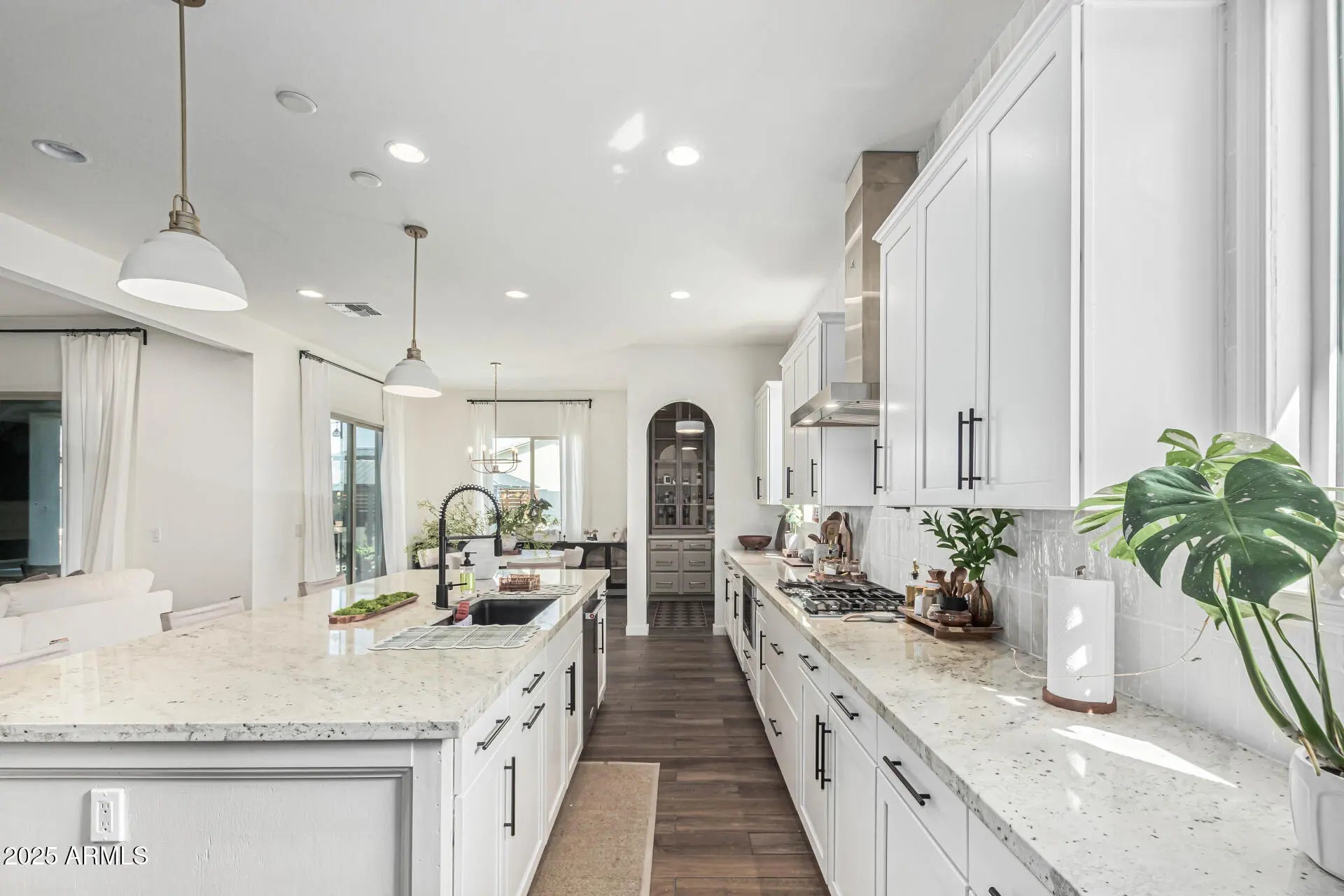 Stunning one-story home on a desirable corner lot with east/west exposure! The 3-car garage & manicured curb appeal set the tone for what awaits inside! Thoughtfully designed interior featuring wood-look tile flooring, recessed lighting, & designer wall finishes in select areas. A butler's service area enhances formal dining, while the bright living room invites relaxation w/cozy fireplace. Elegant kitchen boasts large island w/breakfast bar, granite counters, pendant lighting, SS appliances, walk-in pantry, white cabinetry, & breakfast nook w/backyard access. The main bedroom is a true sanctuary comprising backyard access & lavish bathroom w/dual vanities, floor-to-ceiling tiled shower, & walk-in closet. There's a split bedroom with its own bathroom, perfect for guests! You'll love the Jack-&-Jill bathroom, den w/French glass doors, & private family room. The backyard is designed for year-round enjoyment with a covered patio, sparkling blue pool, Ramada with built-in BBQ, artificial grass, colorful desert plantings, & a cozy fire pit area. Enjoy style, privacy, & resort-style outdoor living!