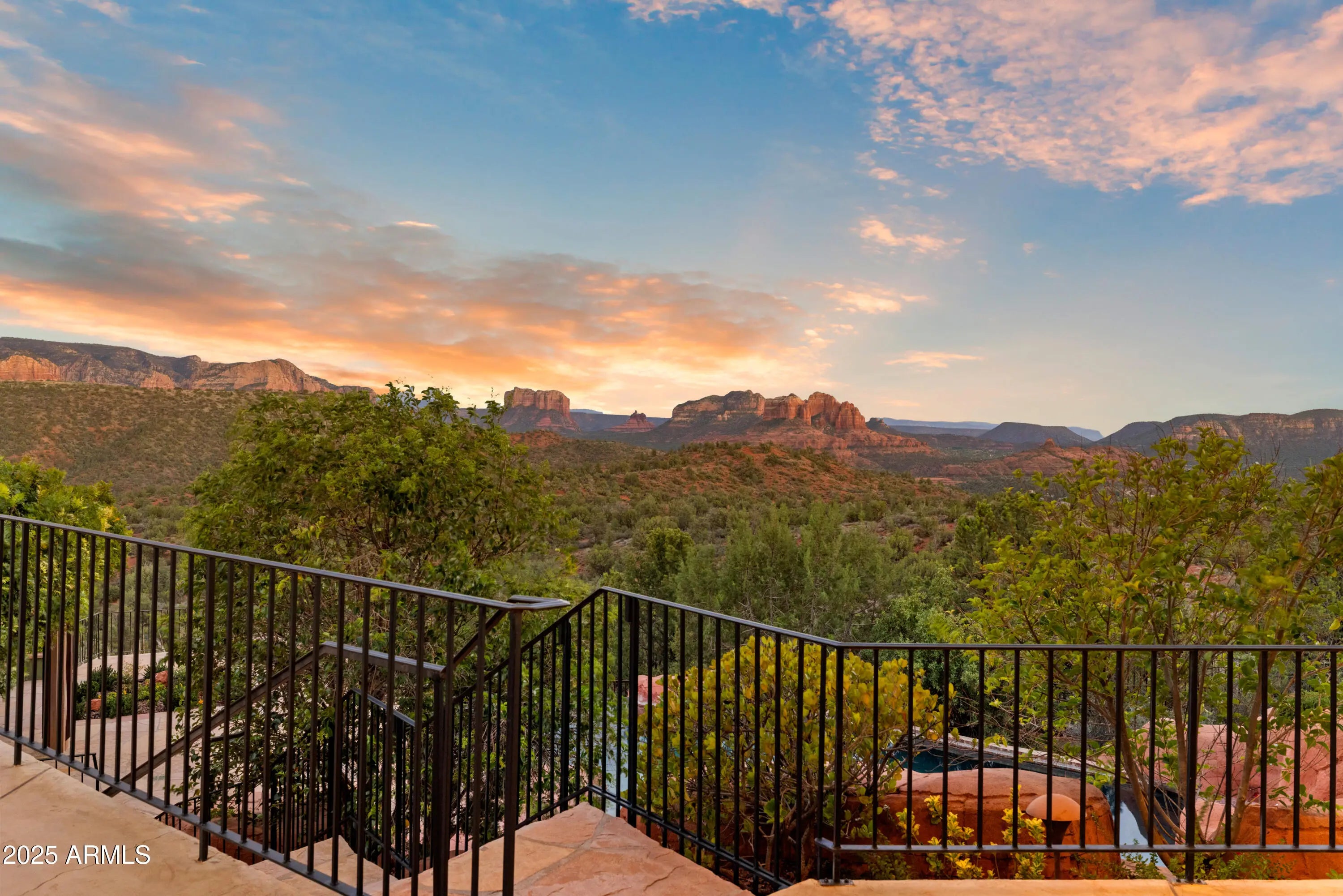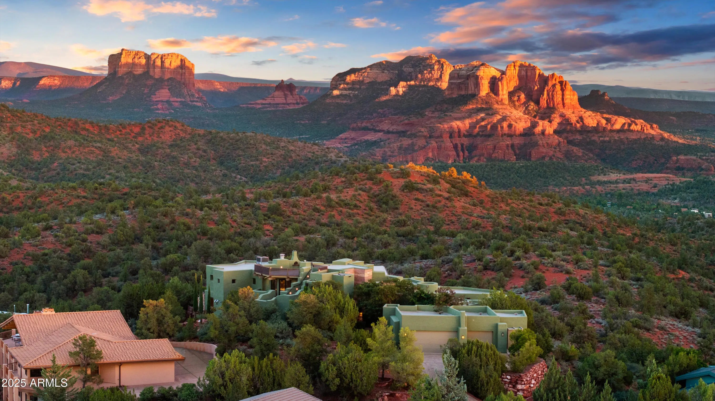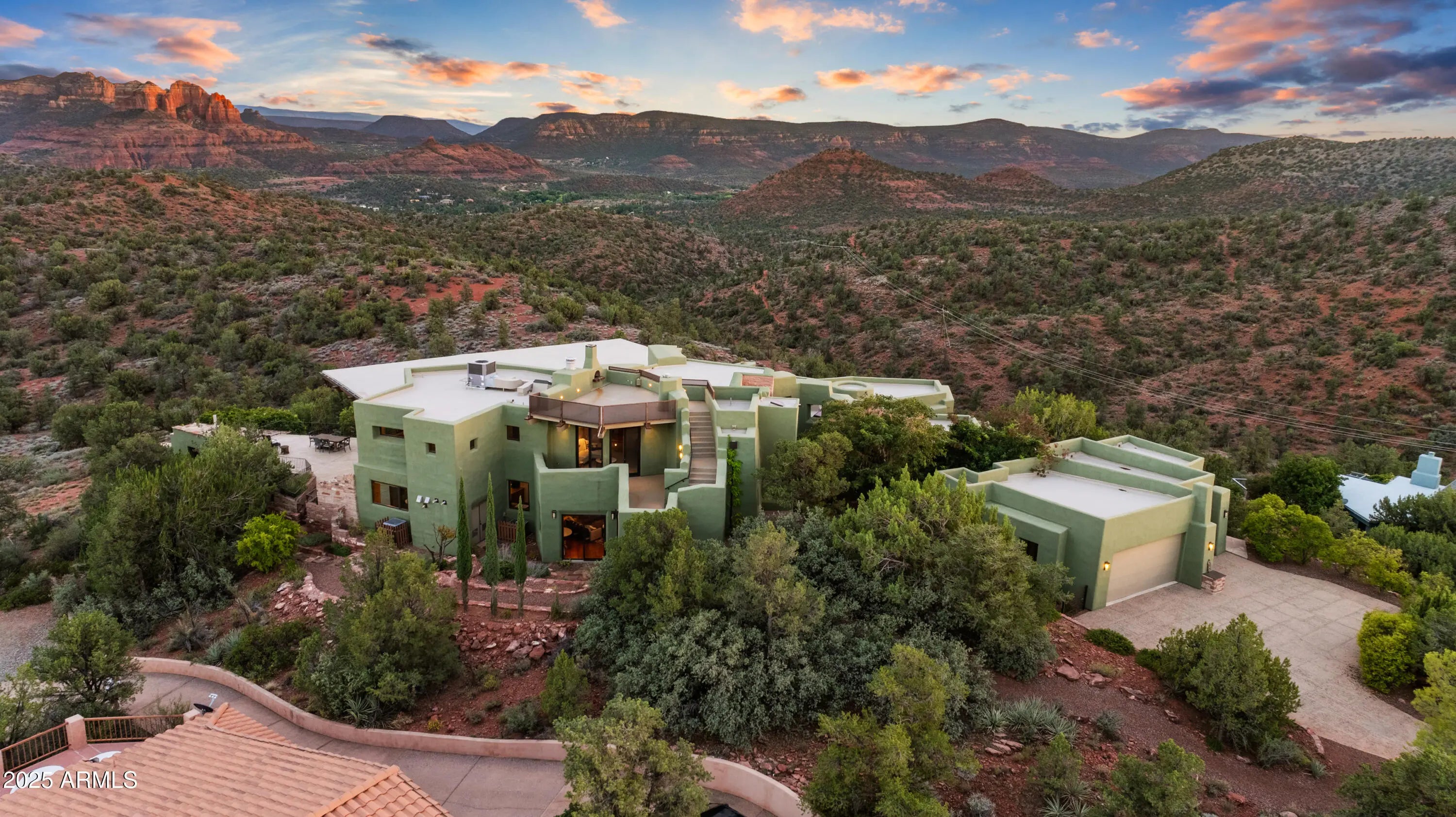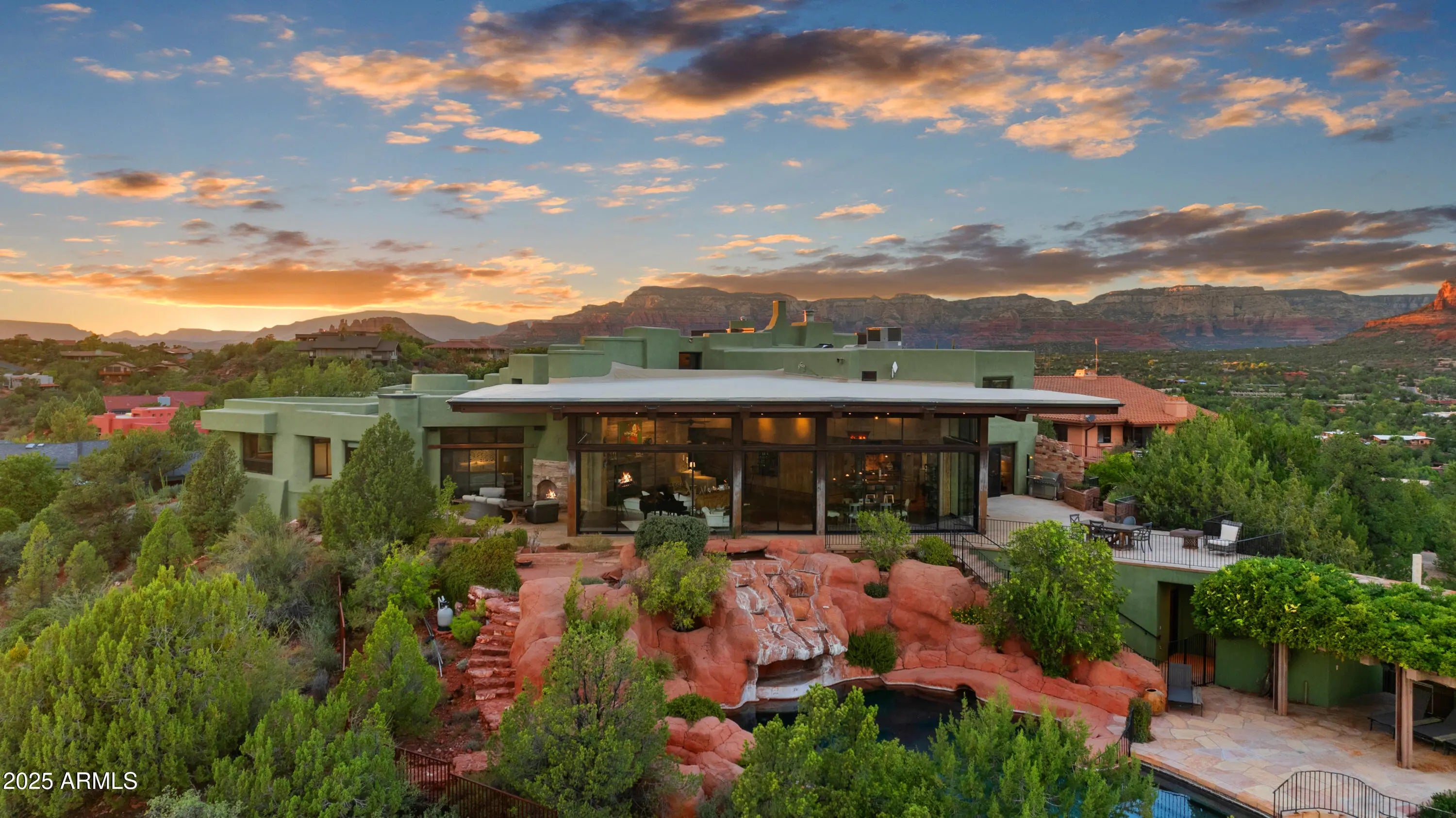 Sedona's Pinnacle of Privacy & Panoramic Beauty: Perched high in one of Sedona's most exclusive gated communities, this Santa Fe styled masterpiece is surrounded by acres of National Forest and offers a level of privacy often sought by those looking to escape. From sunrise to starlight, unobstructed red rock panoramas create a backdrop unlike anywhere else. Perfect for intimate living, yet designed for unforgettable entertaining, the home features a seamless indoor-outdoor flow with disappearing glass walls, multiple fireplaces, expansive view decks, and a resort-style pool with waterfall. The gourmet chef's kitchen, wet bar, and formal dining space make hosting effortless, while the main-level primary suite offers its own sanctuary with spa bath, gym, and private patio. Upstairs, two guest suites enjoy private elevator access and their own view terraces. Additional highlights include a dedicated office or fourth bedroom, an oversized steam shower, artisan details inspired by Native American pueblo architecture, and an extended 3-car garage for extra cars or room for your hobbies. In a location second to none, this is more than a home, it's a Sedona experience of unmatched beauty and tranquility.