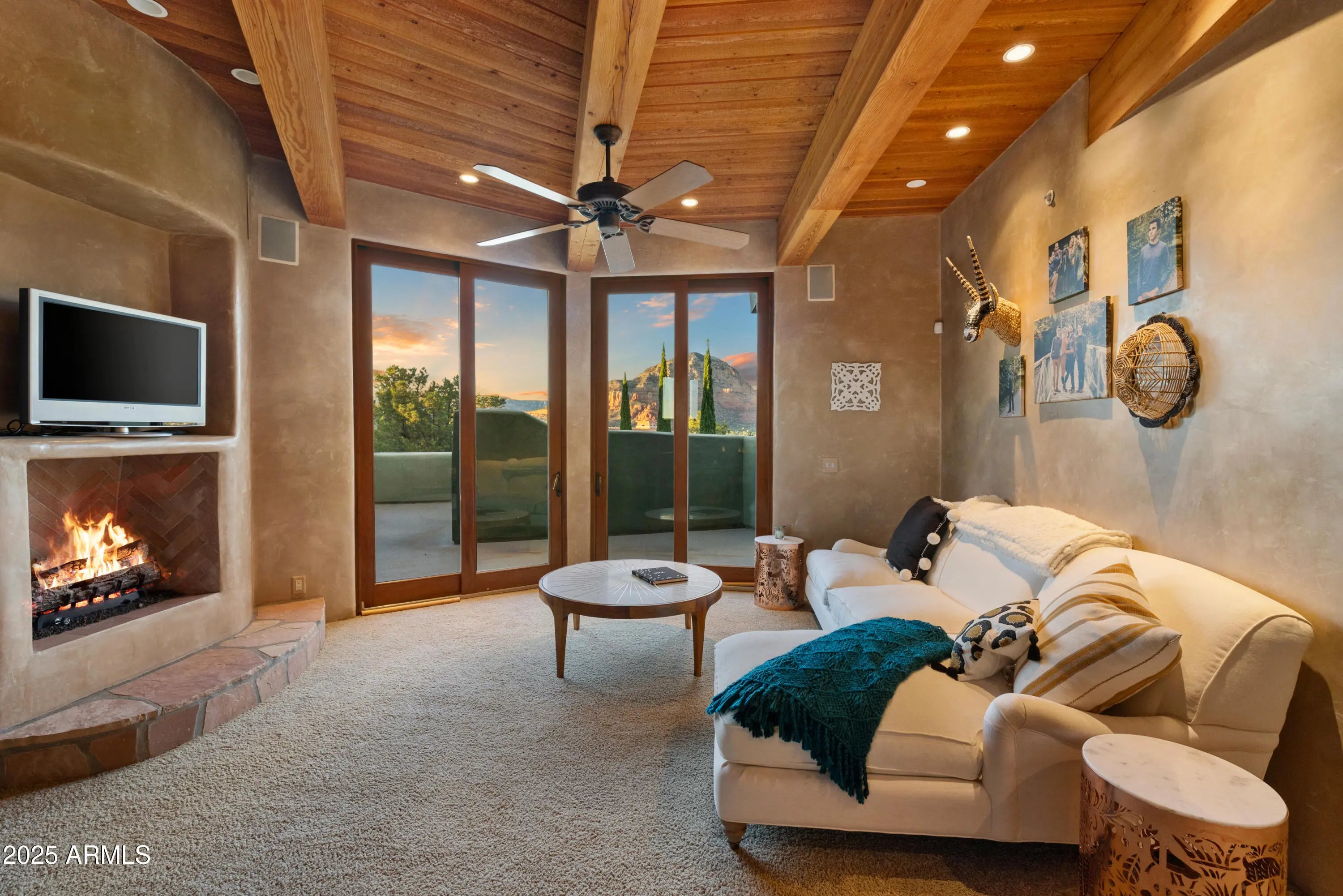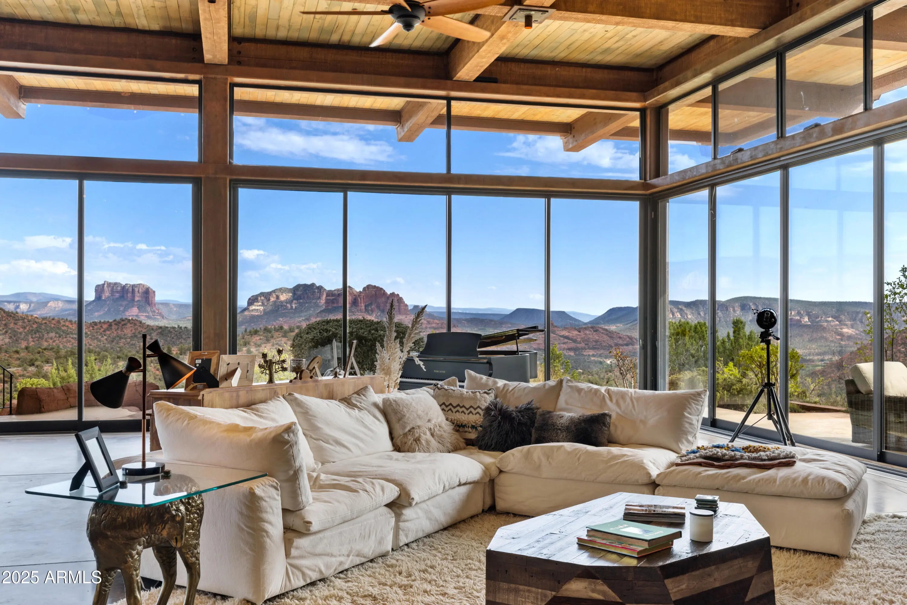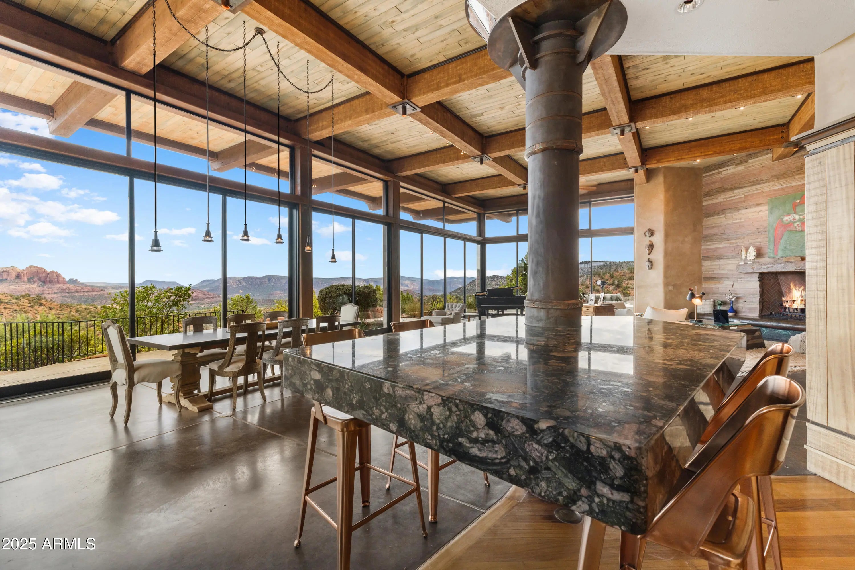 Sedona's Pinnacle of Privacy & Panoramic Beauty: Perched high in one of Sedona's most exclusive gated communities, this Santa Fe styled masterpiece is surrounded by acres of National Forest and offers a level of privacy often sought by those looking to escape. From sunrise to starlight, unobstructed red rock panoramas create a backdrop unlike anywhere else. Perfect for intimate living, yet designed for unforgettable entertaining, the home features a seamless indoor-outdoor flow with disappearing glass walls, multiple fireplaces, expansive view decks, and a resort-style pool with waterfall. The gourmet chef's kitchen, wet bar, and formal dining space make hosting effortless, while the main-level primary suite offers its own sanctuary with spa bath, gym, and private patio. Upstairs, two guest suites enjoy private elevator access and their own view terraces. Additional highlights include a dedicated office or fourth bedroom, an oversized steam shower, artisan details inspired by Native American pueblo architecture, and an extended 3-car garage for extra cars or room for your hobbies. In a location second to none, this is more than a home, it's a Sedona experience of unmatched beauty and tranquility.
