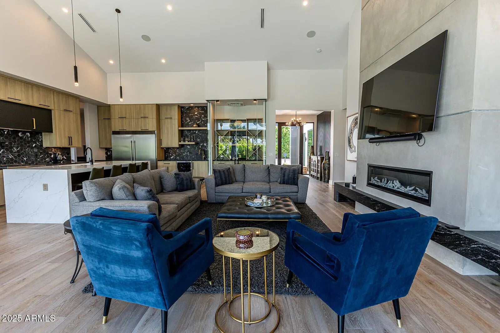 This stunning 2022 Arcadia Osborn modern home offers an open concept layout w 5 bed 4.5 bath. Upon entry, you're welcomed by soaring vaulted ceilings & rich wood flooring that flow t/o the great room, complete w a striking fireplace feature wall that seamlessly connects to the dining area & chef's kitchen. The kitchen boasts custom oak cabinetry, high-end appliance, a spacious butler's prep area, walk -in pantry & a glass-enclosed wine room-perfect for both entertaining & family living. The split floor plan provides privacy & comfort. Primary suite features a private entrance to the backyard, dual-sink vanity, oversized walk-in shower, freestanding soaking tub. Amazing indoor-outdoor living w sliders that open to resort style backyard showcasing pool, built in BBQ, firepit & turf lawn.