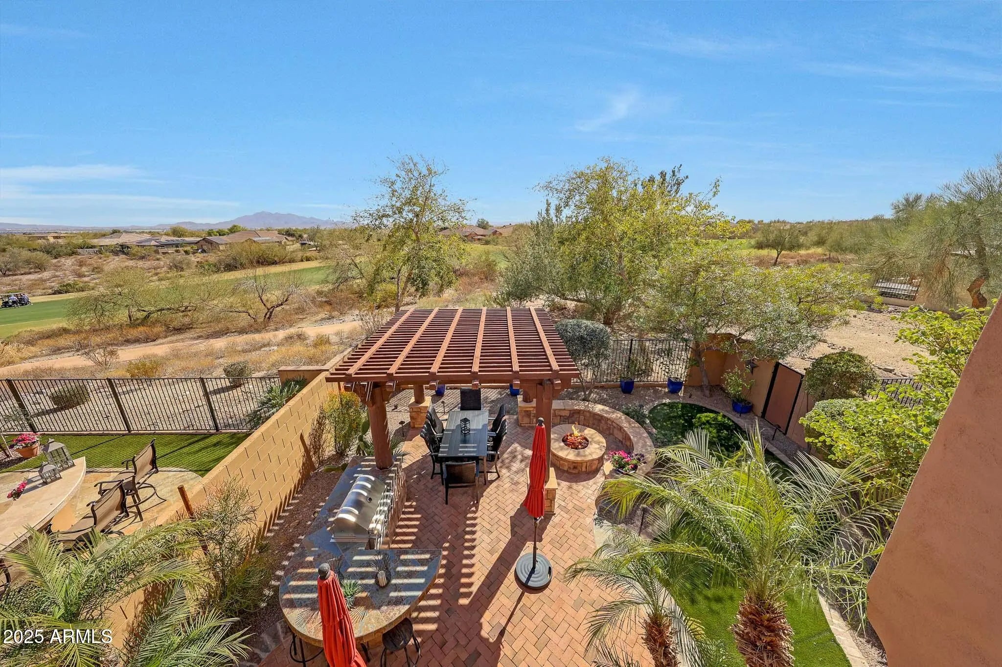 This customized Golf Villa in the gated Vallarta neighborhood of Verrado offers luxury living: private community pool, spa, and BBQ area ''perfect for entertaining. Located on the 5th fairway of the Verrado Golf Club, it features panoramic views of the course, mountains, and city lights. The southern-exposed private backyard includes a custom BBQ area with pergola, Delta Heat Gas Grill, fire pit, artificial turf, and a spacious covered patio. Inside, enjoy a remodeled powder bath, office/den, formal dining with beams, quartz countertops, and a family room with fireplace. The master retreat offers a walk-in closet, private balcony, and stunning views. Two guest rooms share a full bath. Across from community pool and amenities, this villa is a perfect lock-and-leave for your Verrado Lifestyl