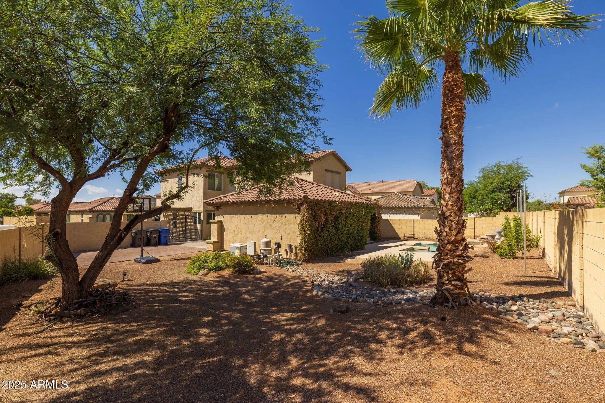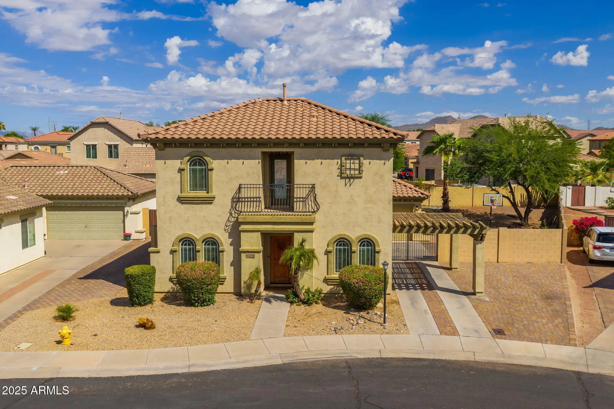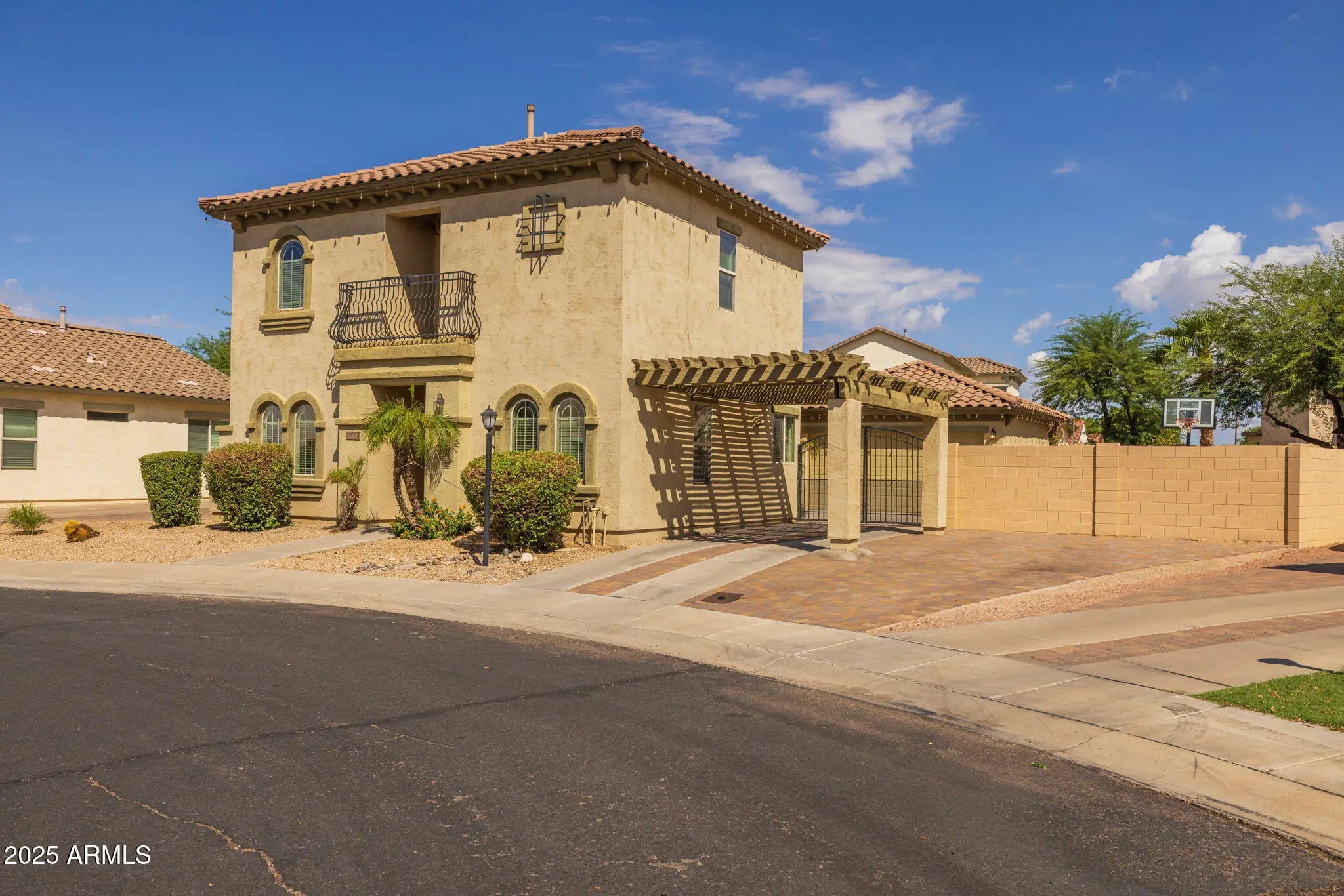 Welcome to one of the largest lots in NE Mesa's private gated community of Cecina—a home that blends timeless Spanish-style charm with modern luxury upgrades and resort-style outdoor living. Priced to sell and move-in ready, this beautifully reimagined hacienda has been enhanced with more than $100,000 in thoughtful improvements. Tucked away on a spacious homesite, the residence offers nearly 1,900 sq. ft. of light-filled living space, soaring 20-ft ceilings, and expansive windows that create an airy, coastal-inspired feel. Inside, you'll find three spacious bedrooms and three fully renovated bathrooms, each featuring custom walk-in showers with sleek glass doors, granite vanities, and designer mirrors. The chef's kitchen shines with white cabinetry, premium Café appliances (including oven with air fryer mode and matching microwave), an island with striking custom rock accents, and elegant chandeliers that add warmth and sophistication. A balcony retreat off the primary suite, new luxury vinyl flooring downstairs, fresh interior paint, and upgraded 5" baseboards complete the interior refresh. Step outdoors and experience Arizona living at its finest. The oversized backyard is a true oasis with a heated pool and spa with water feature controlled by a modern digital system, professional bistro lighting that casts a year-round glow, and mature greenery for added privacy. A large covered patio and basketball play space make the yard perfect for gatherings. The detached 2-car garage features brand-new epoxy flooring, while the extended paver driveway and gate provide parking for up to eight vehicles. The home also includes a fully installed surveillance system with no monthly fees, a washer and dryer that will convey, and a generous $5,000 buyer concession that can be applied toward upgrades, closing costs, or a down payment. To make the move even more effortless, the sellers are offering free pool and yard maintenance through the end of 2025. Beyond your doorstep, Cecina residents enjoy a community pool and playground, along with convenient freeway access and close proximity to shopping, dining, and nearby parks.