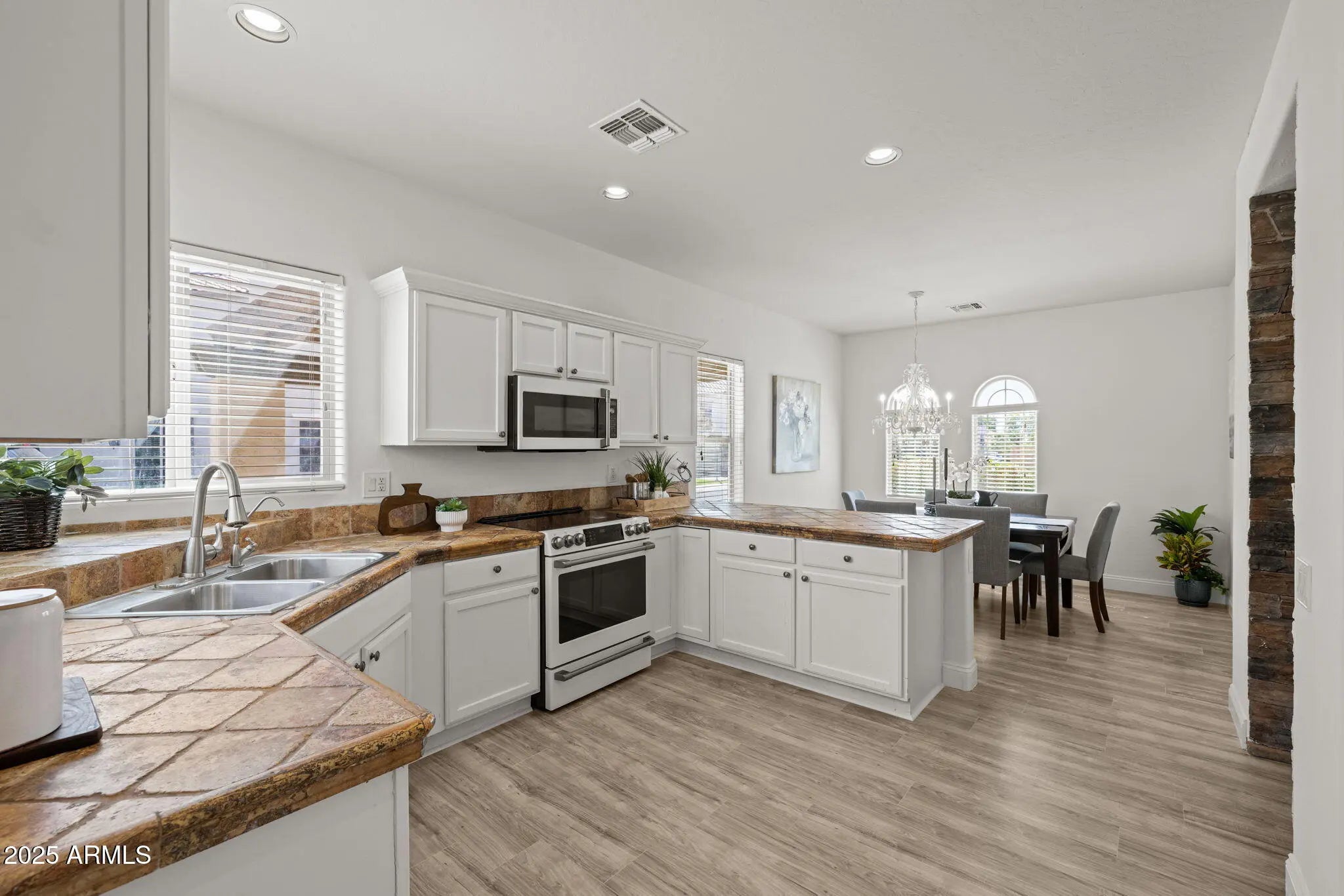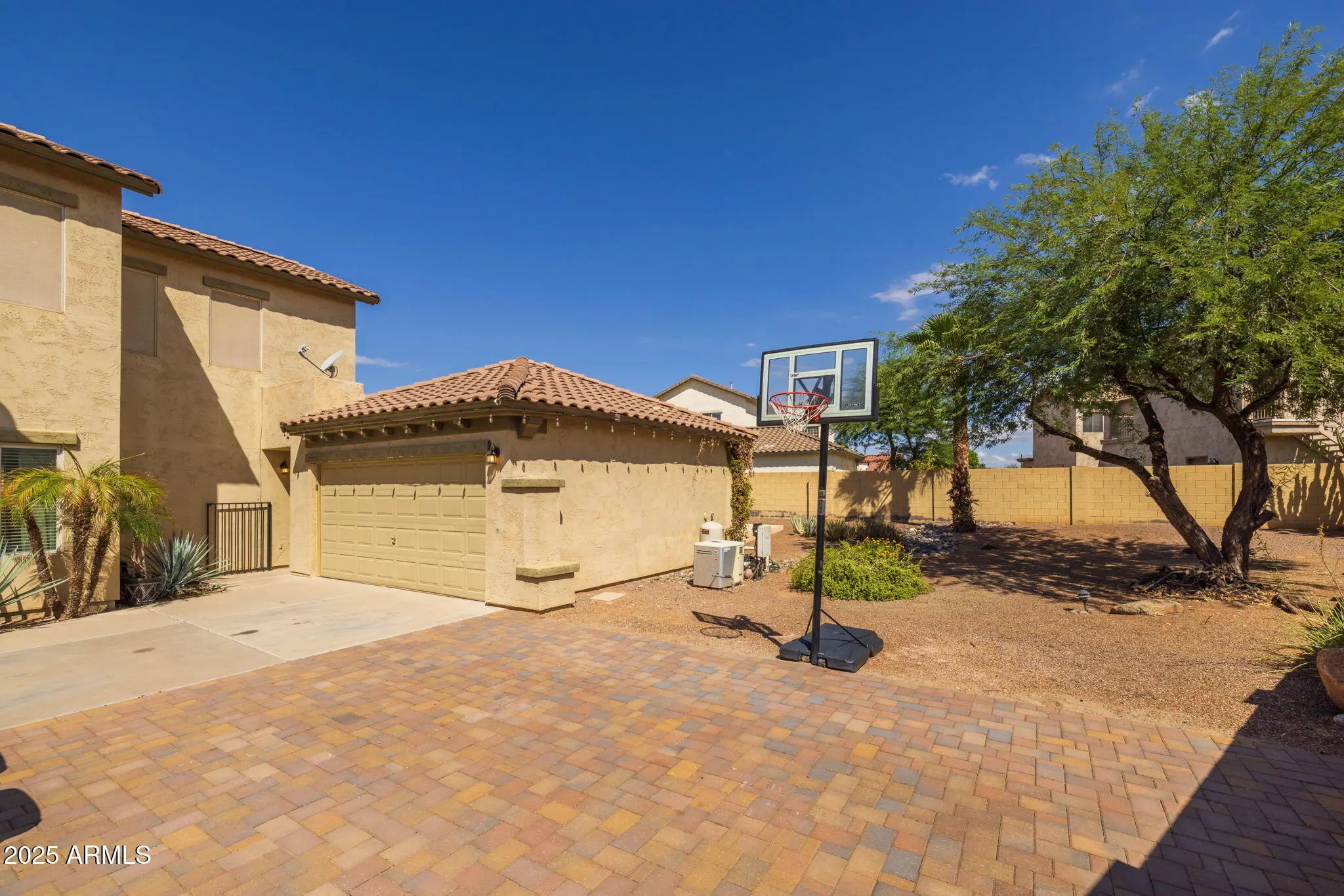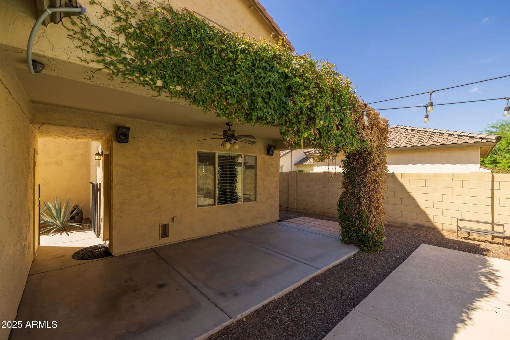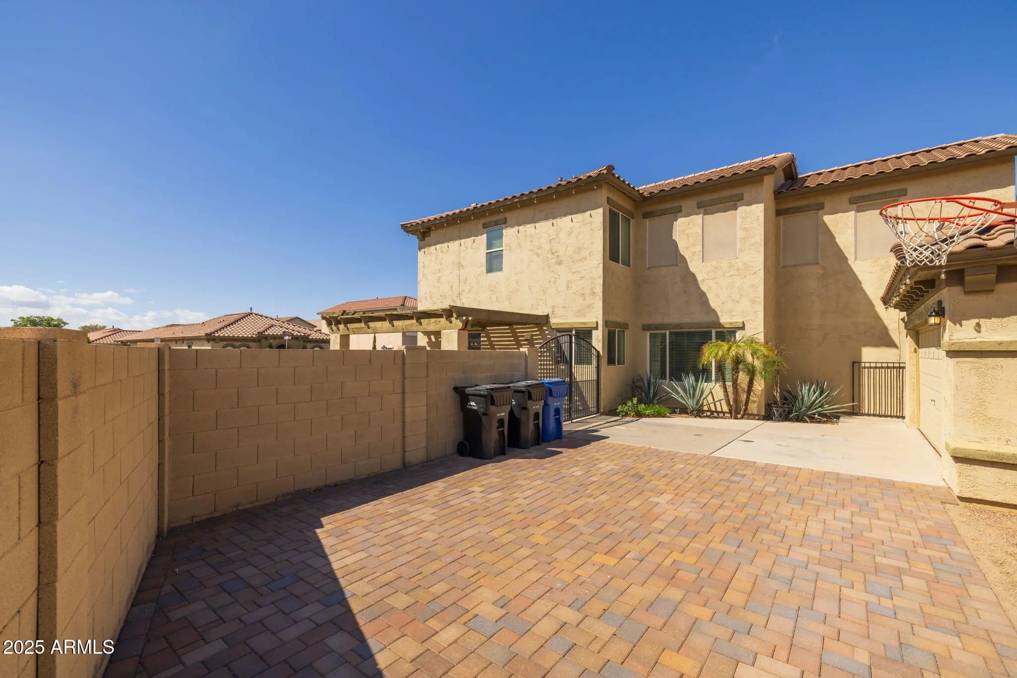 Welcome to one of the largest lots in NE Mesa's private gated community of Cecina—a home that blends timeless Spanish-style charm with modern luxury upgrades and resort-style outdoor living. Priced to sell and move-in ready, this beautifully reimagined hacienda has been enhanced with more than $100,000 in thoughtful improvements. Tucked away on a spacious homesite, the residence offers nearly 1,900 sq. ft. of light-filled living space, soaring 20-ft ceilings, and expansive windows that create an airy, coastal-inspired feel. Inside, you'll find three spacious bedrooms and three fully renovated bathrooms, each featuring custom walk-in showers with sleek glass doors, granite vanities, and designer mirrors. The chef's kitchen shines with white cabinetry, premium Café appliances (including oven with air fryer mode and matching microwave), an island with striking custom rock accents, and elegant chandeliers that add warmth and sophistication. A balcony retreat off the primary suite, new luxury vinyl flooring downstairs, fresh interior paint, and upgraded 5" baseboards complete the interior refresh. Step outdoors and experience Arizona living at its finest. The oversized backyard is a true oasis with a heated pool and spa with water feature controlled by a modern digital system, professional bistro lighting that casts a year-round glow, and mature greenery for added privacy. A large covered patio and basketball play space make the yard perfect for gatherings. The detached 2-car garage features brand-new epoxy flooring, while the extended paver driveway and gate provide parking for up to eight vehicles. The home also includes a fully installed surveillance system with no monthly fees, a washer and dryer that will convey, and a generous $5,000 buyer concession that can be applied toward upgrades, closing costs, or a down payment. To make the move even more effortless, the sellers are offering free pool and yard maintenance through the end of 2025. Beyond your doorstep, Cecina residents enjoy a community pool and playground, along with convenient freeway access and close proximity to shopping, dining, and nearby parks.