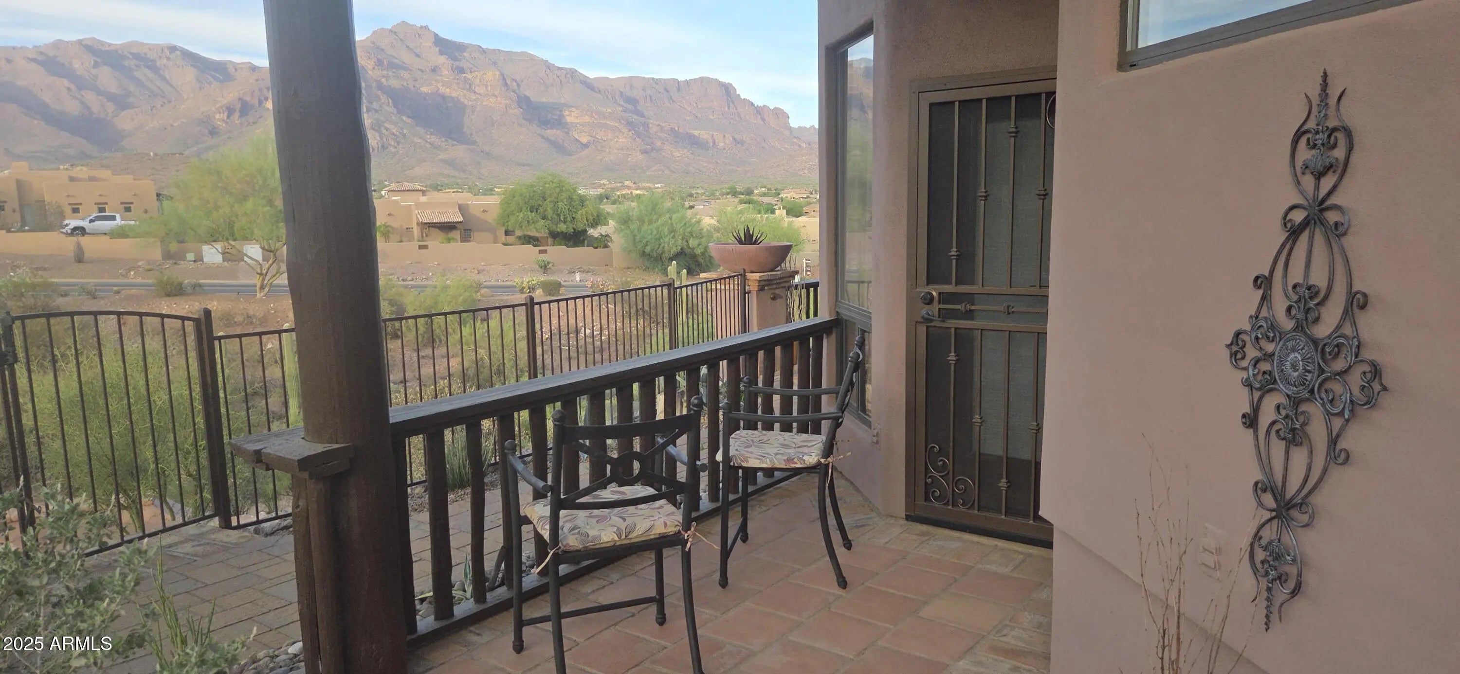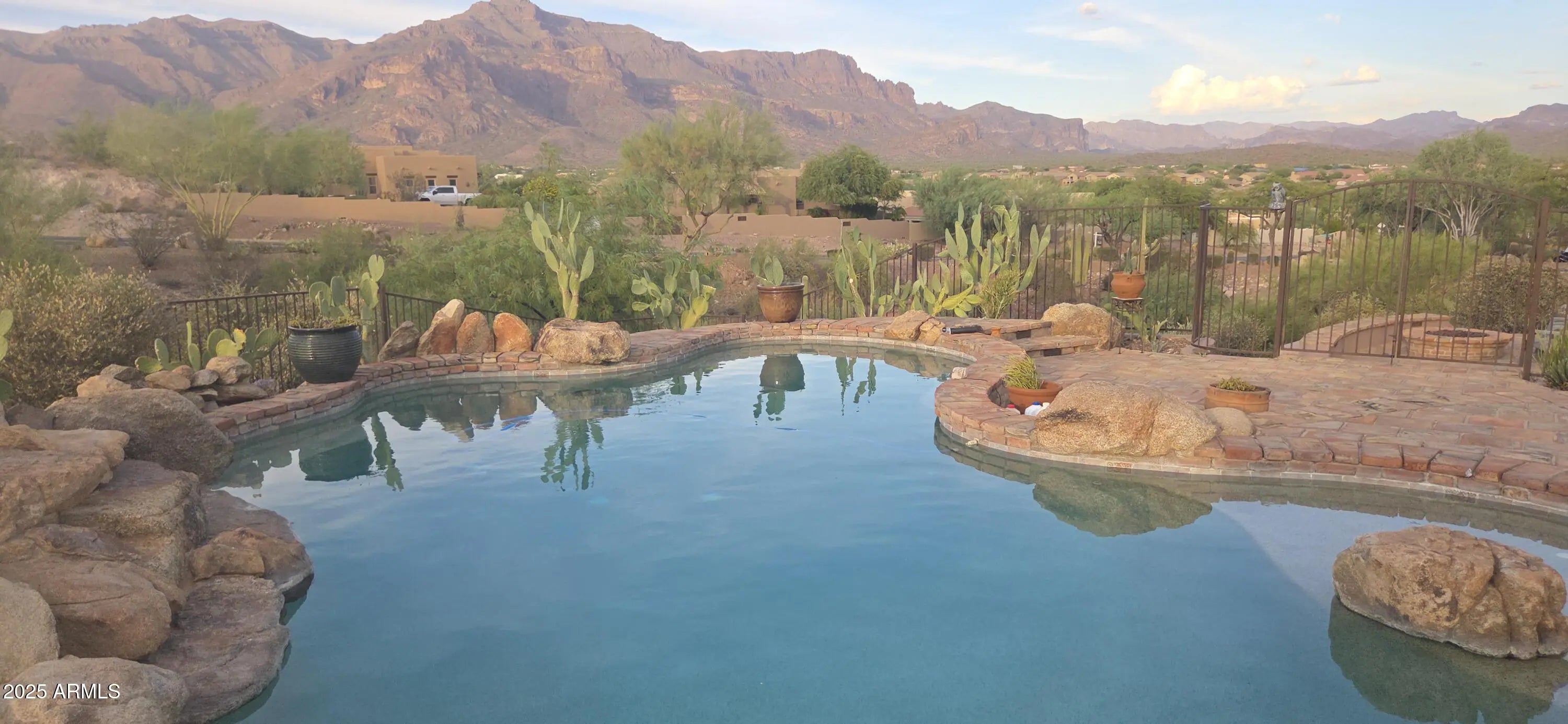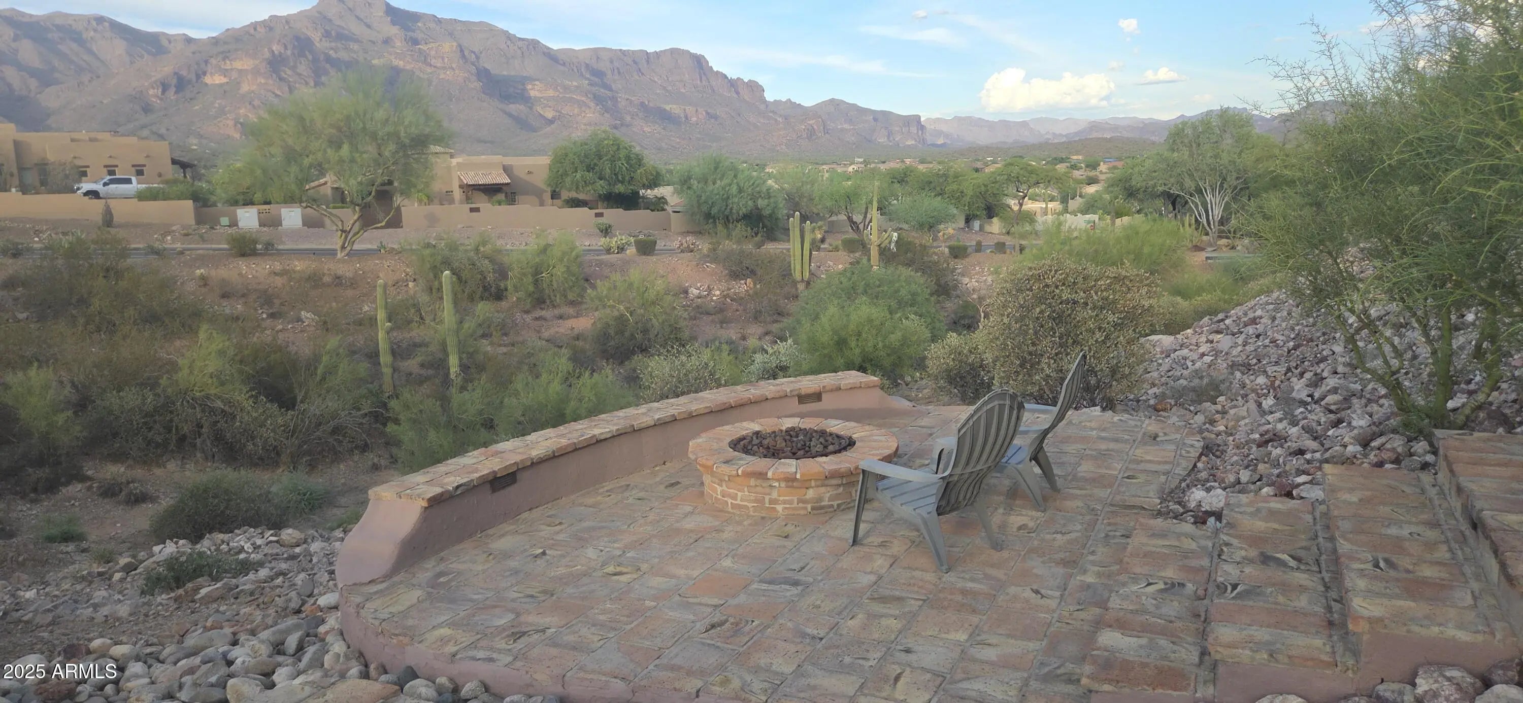 Fabulous views of the Superstitions. No homes behind. Split floor plan and all 3 bedrooms and flex room have exterior door access to six exterior sitting areas. 9 1/2 foot deep pool with waterfall and great views. Two wood burning fireplaces. Granite from Brazil in kitchen, primary bath, make-up area and wet bar area. Wet bar has petrified wood sink from Turkey. Stone surround on both fireplaces. Primary suite has sitting room with bay window with great views of the Superstitions and fireplace. 2 new Trane air conditioners (2024) and 2 new water heaters (2024). Large 3 car garage with 2 walk-in closets. Beamed ceiling and archways. Golf course views and firepit . Breakfast bar. Breakfast area has bay window with mountain views. Plantation shutters, Many enclaves. ,59 acre. Owner/Agent Covered patios, Extra storage space with 9 closets. Crown molding