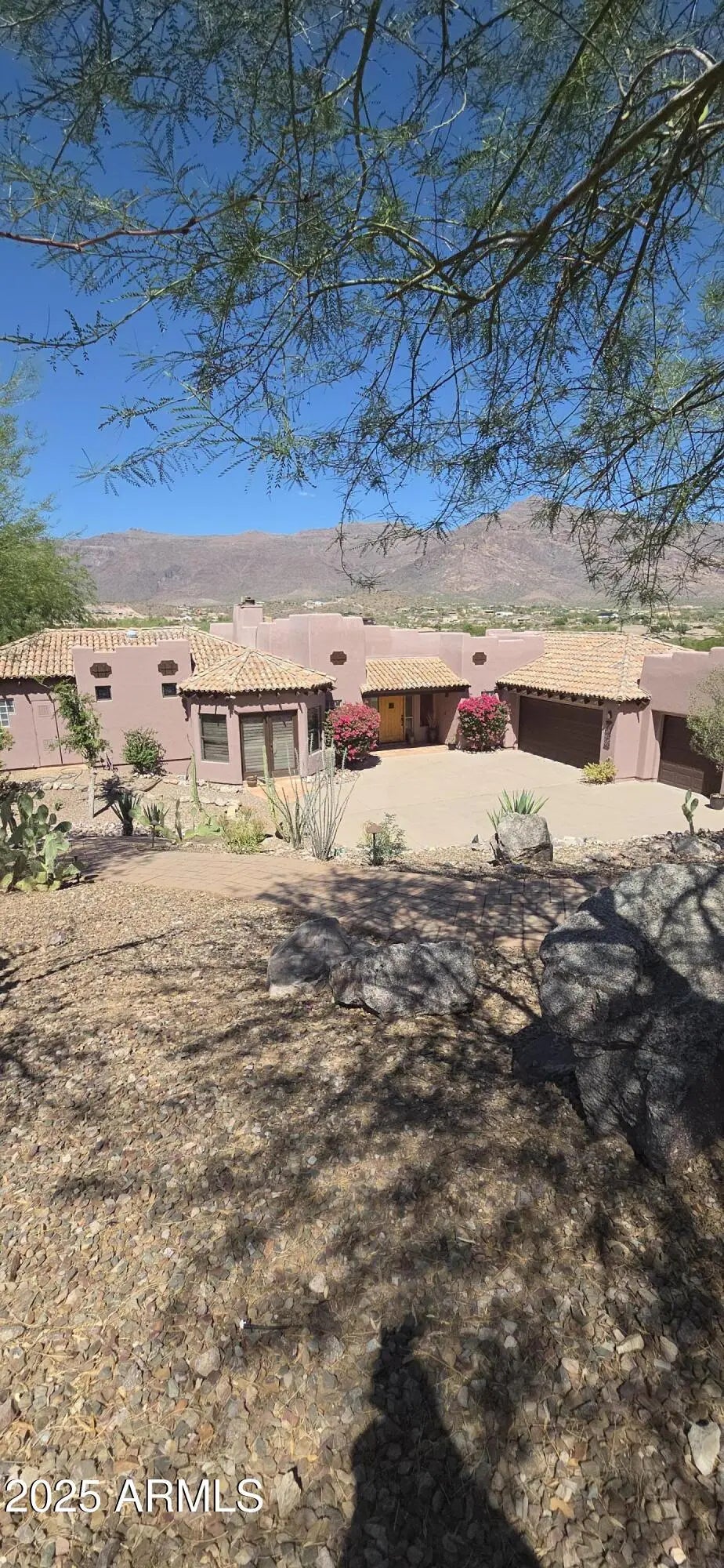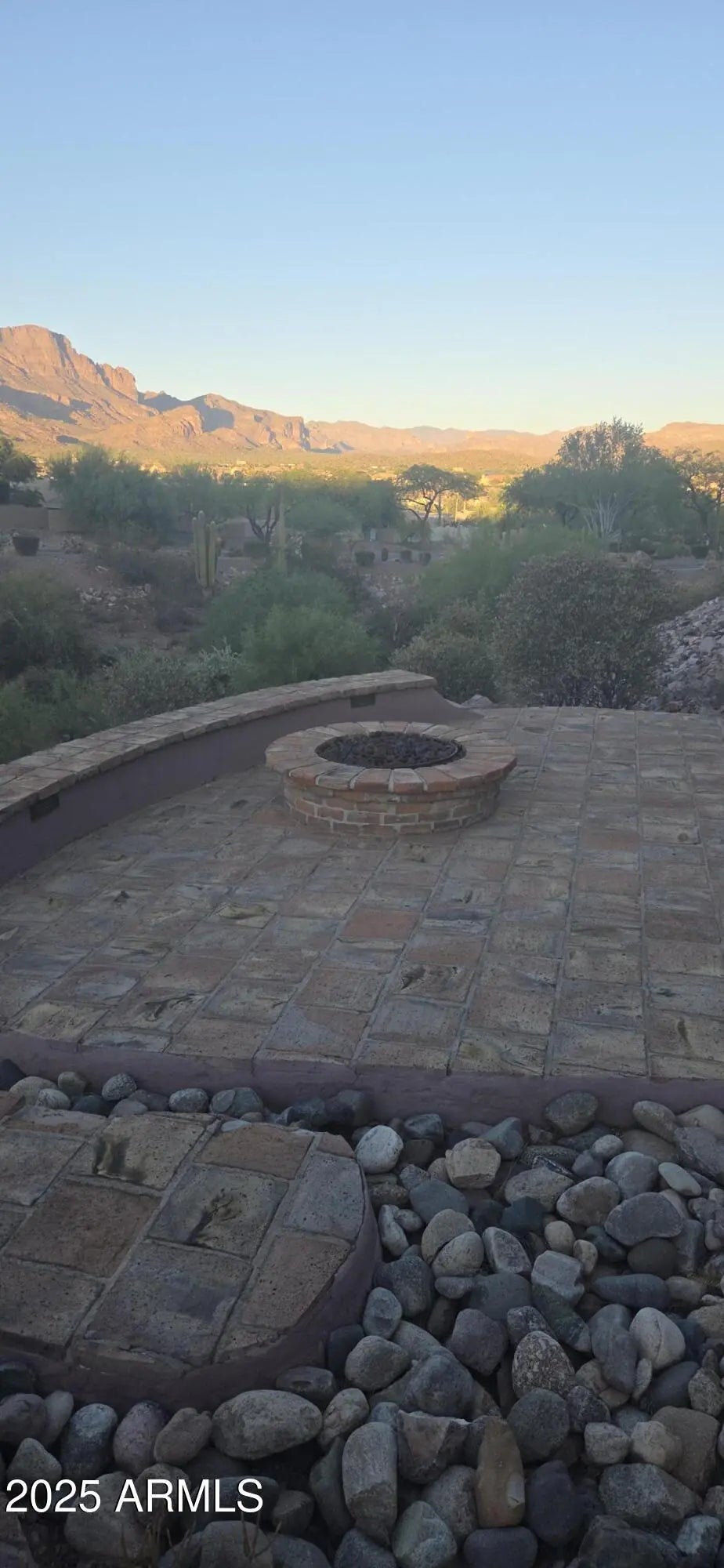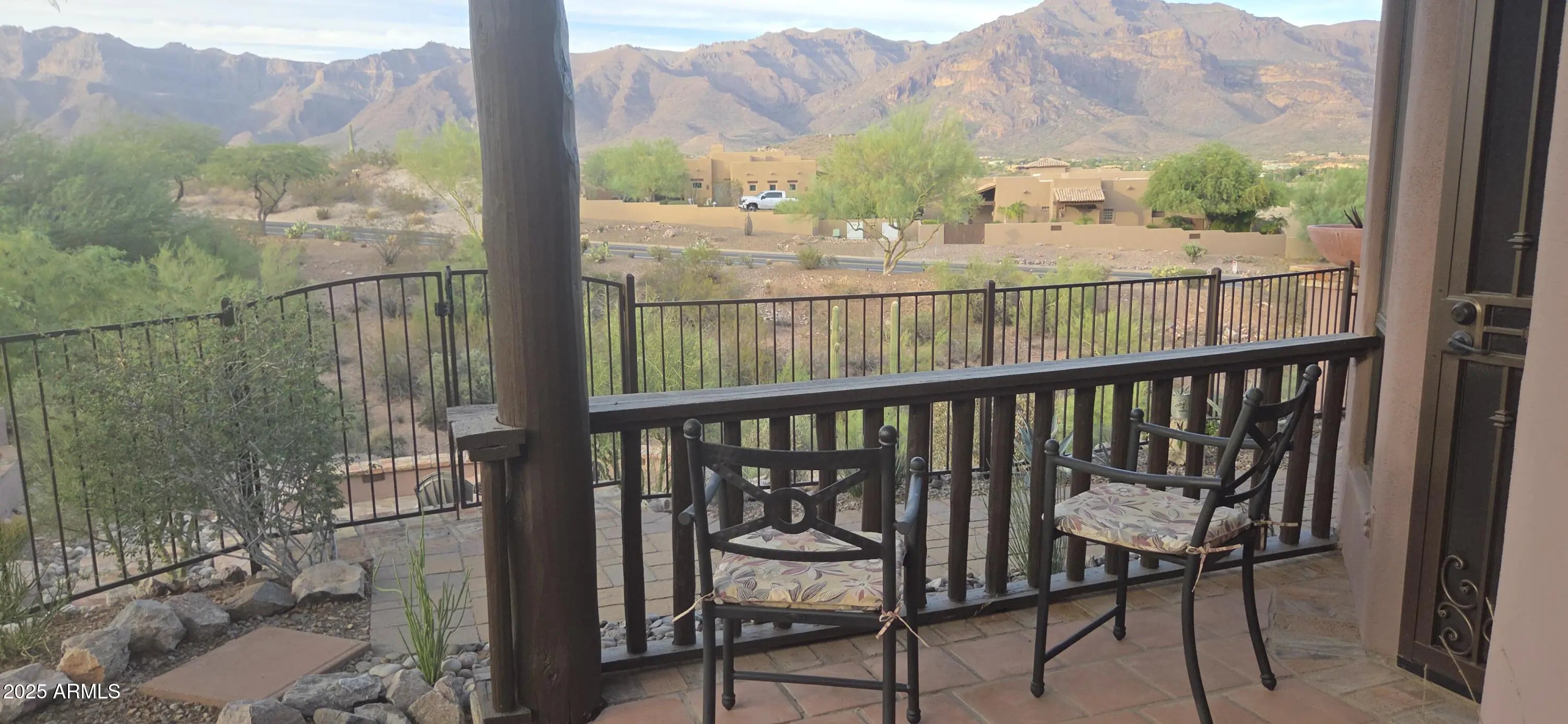 Fabulous views of the Superstitions. No homes behind. Split floor plan and all 3 bedrooms and flex room have exterior door access to six exterior sitting areas. 9 1/2 foot deep pool with waterfall and great views. Two wood burning fireplaces. Granite from Brazil in kitchen, primary bath, make-up area and wet bar area. Wet bar has petrified wood sink from Turkey. Stone surround on both fireplaces. Primary suite has sitting room with bay window with great views of the Superstitions and fireplace. 2 new Trane air conditioners (2024) and 2 new water heaters (2024). Large 3 car garage with 2 walk-in closets. Beamed ceiling and archways. Golf course views and firepit . Breakfast bar. Breakfast area has bay window with mountain views. Plantation shutters, Many enclaves. ,59 acre. Owner/Agent Covered patios, Extra storage space with 9 closets. Crown molding