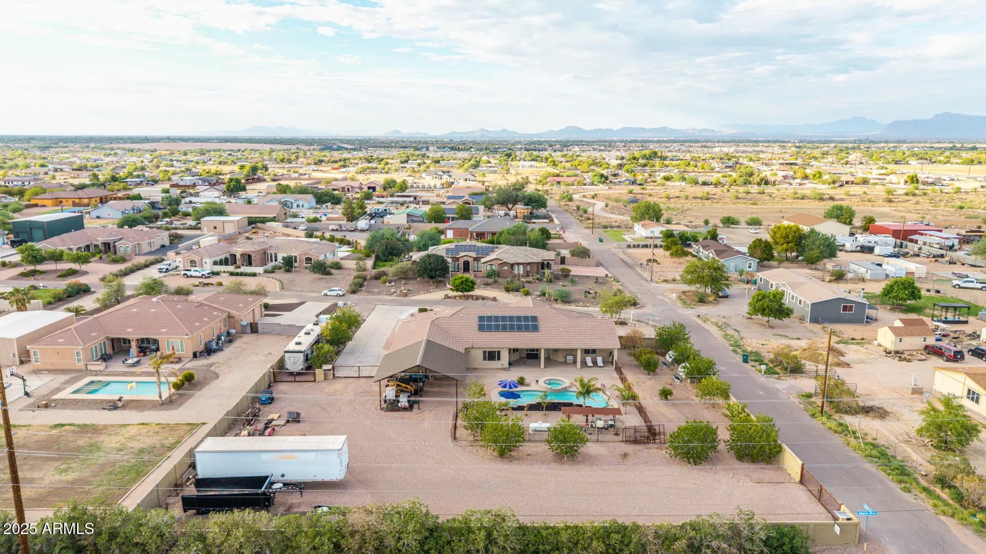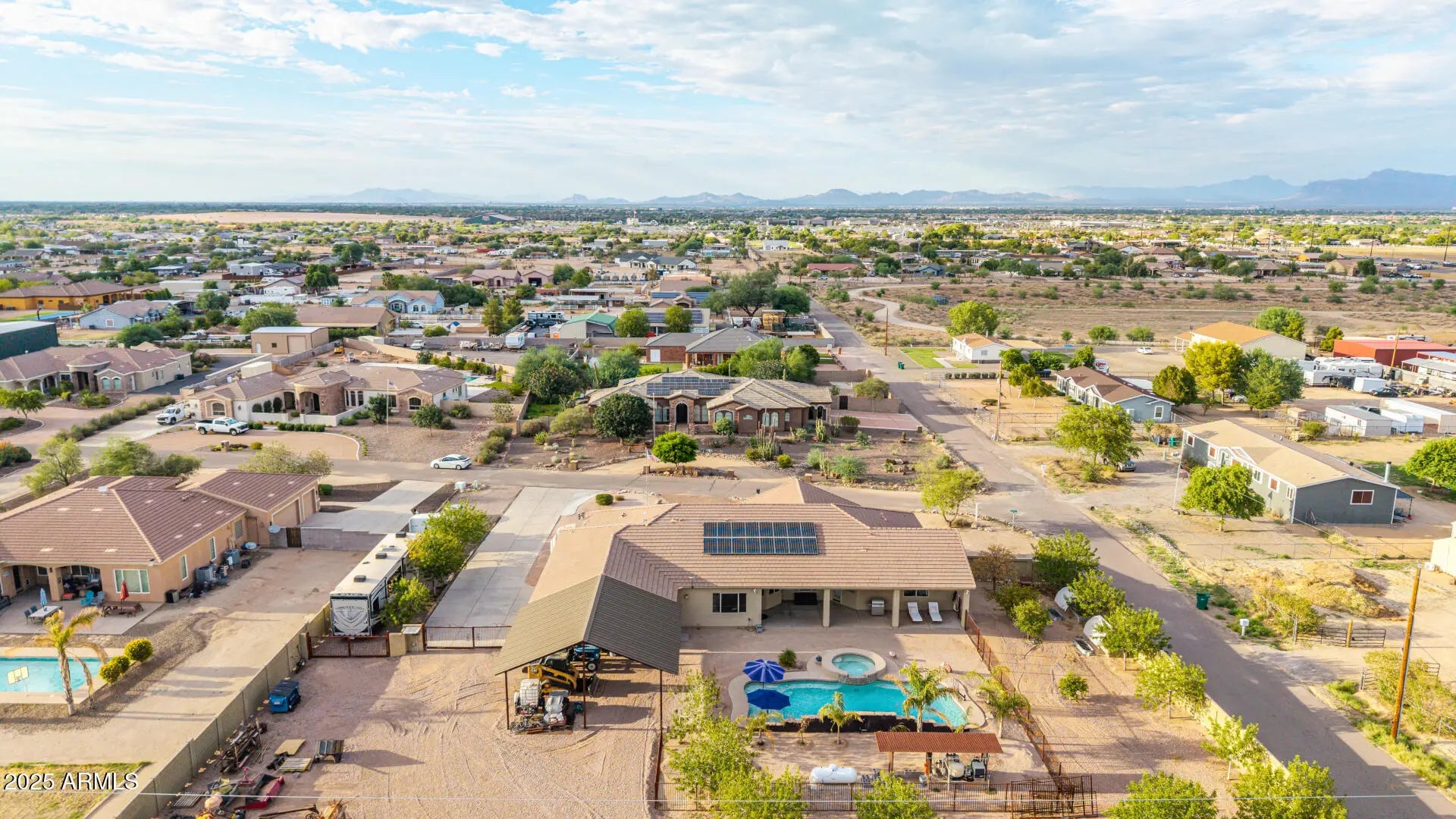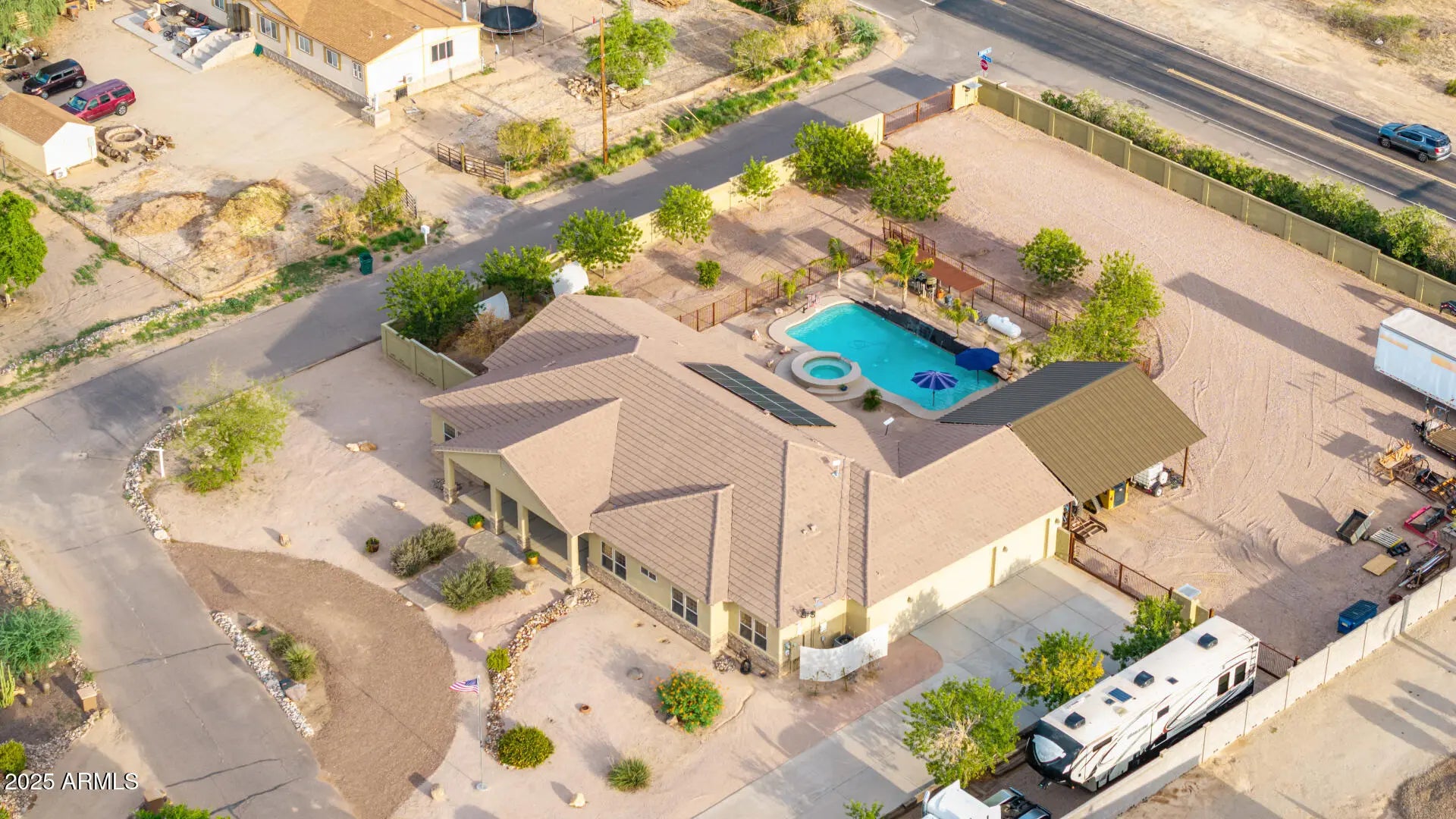 Stunning Single Story 5-Bedroom Queen Creek Home on just over an Acre, corner lot with pool, solar, NO HOA, & More! Welcome to your dream retreat at 20533 E Navajo Dr, where comfort meets functionality in this beautifully upgraded horse property located on a desirable corner lot in Queen Creek! This spacious 5-bedroom, 2.5-bathroom, 3 1/2 car garage, home offers the perfect blend of charm and modern amenities. Inside, you'll be greeted by an open, light-filled layout with tile and wood-look flooring, new carpet throughout, a floor-to-ceiling stone fireplace in the family room, and a warm, neutral color palette throughout, 2 new HVAC units installed in 2019, & new water heater in 2025. he chef's kitchen is a true highlightfeaturing granite countertops, ample cabinetry, a walk-in pantry, center island with breakfast bar, and built-in appliances for a seamless cooking experience. The primary suite is a peaceful retreat with double doors, his and her walk-in closets, and a spa-inspired bathroom with dual vanities. Looking for more space? A generous den provides the perfect spot for a home office, creative studio, or playroom. Step outside to your private backyard oasiscomplete with a covered patio, 20'x40' saltwater pool with built-in hot tub, a 30x30 shade structure, raised garden beds, and ample seating areas ideal for entertaining or enjoying the Arizona sunshine. With RV gates, there's plenty of room for your toys, trailers, or recreational vehicles with 2 separate entries/exit. This home truly has it all the space, privacy, energy efficiency, and luxury outdoor livingall nestled in a prime Queen Creek location. No HOA, RV Parking, Horse Property, and sitting on just over 1 full acre.