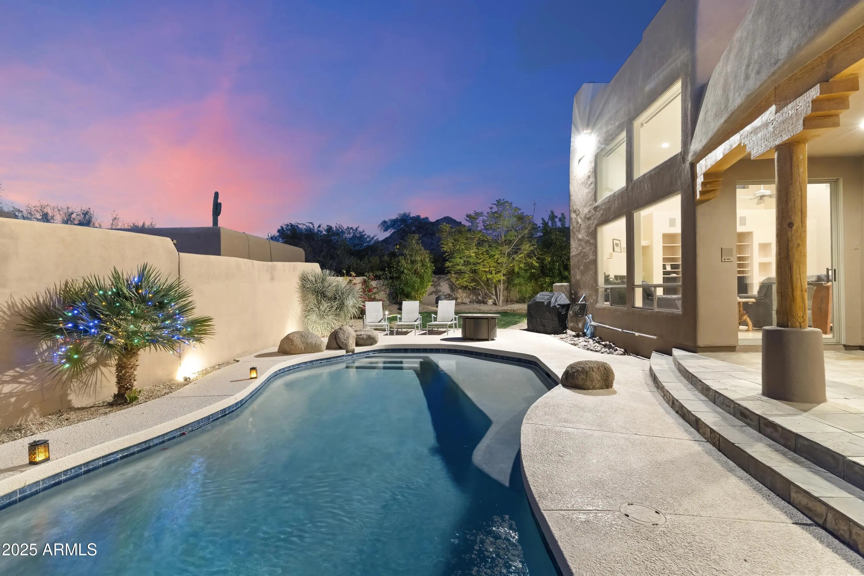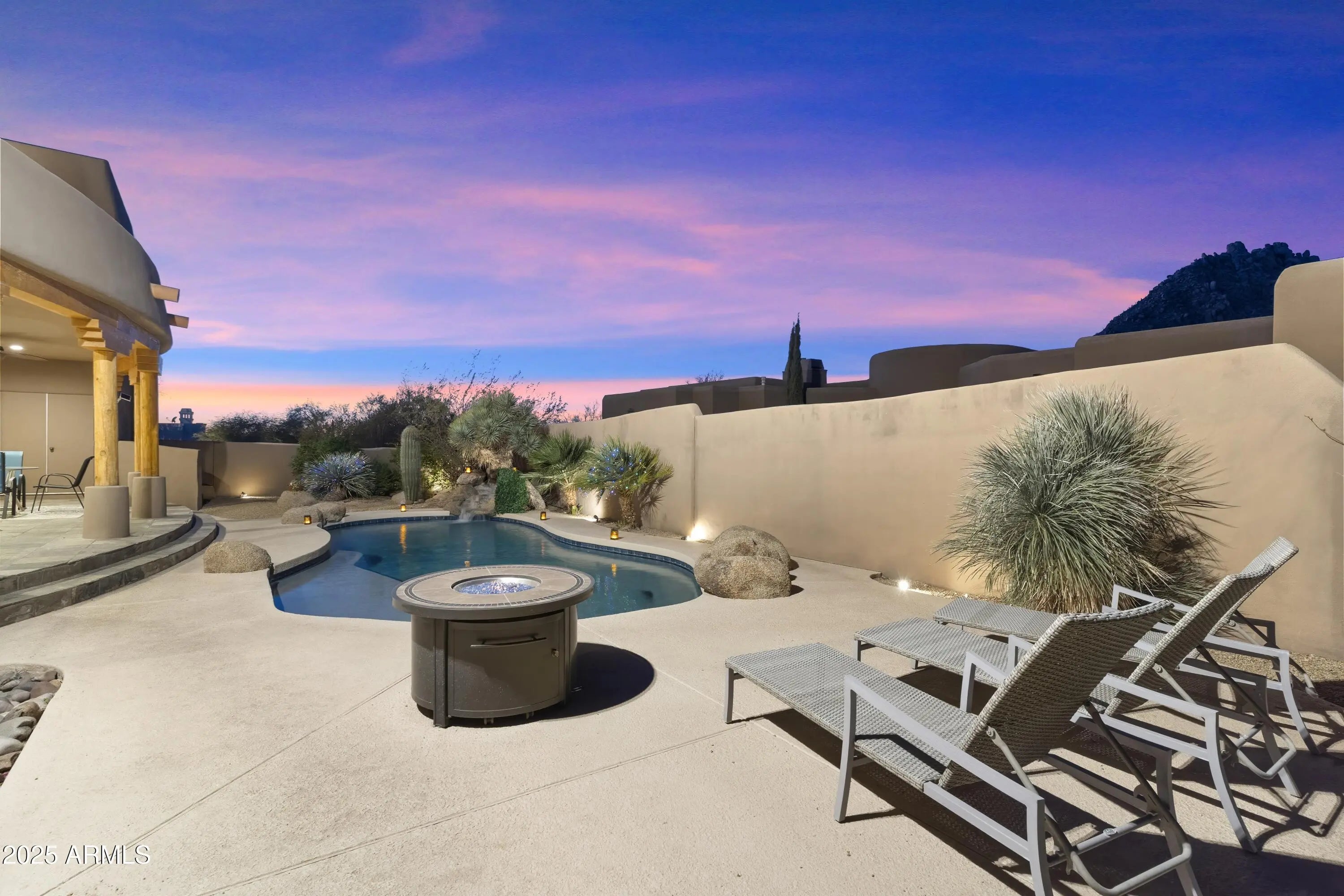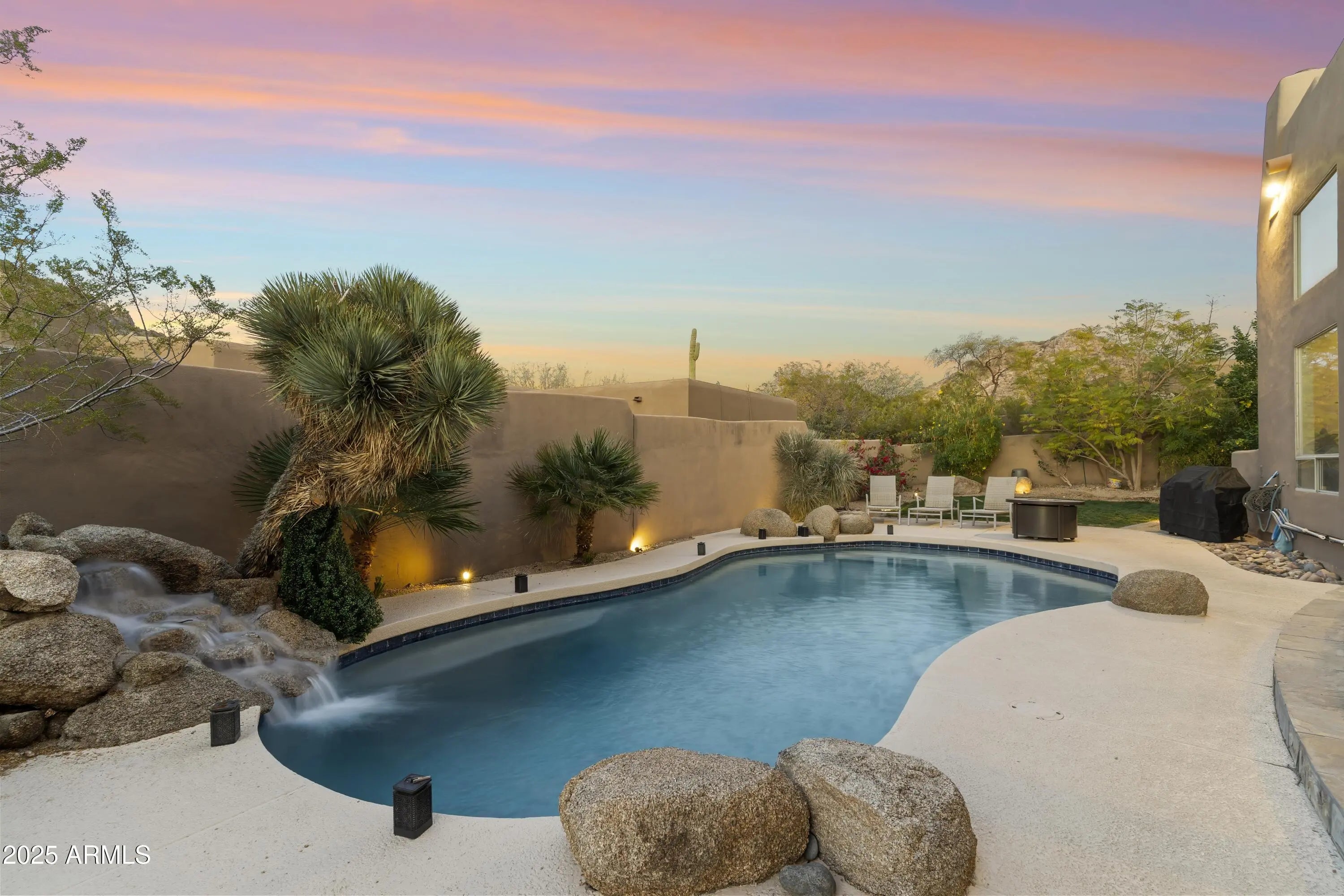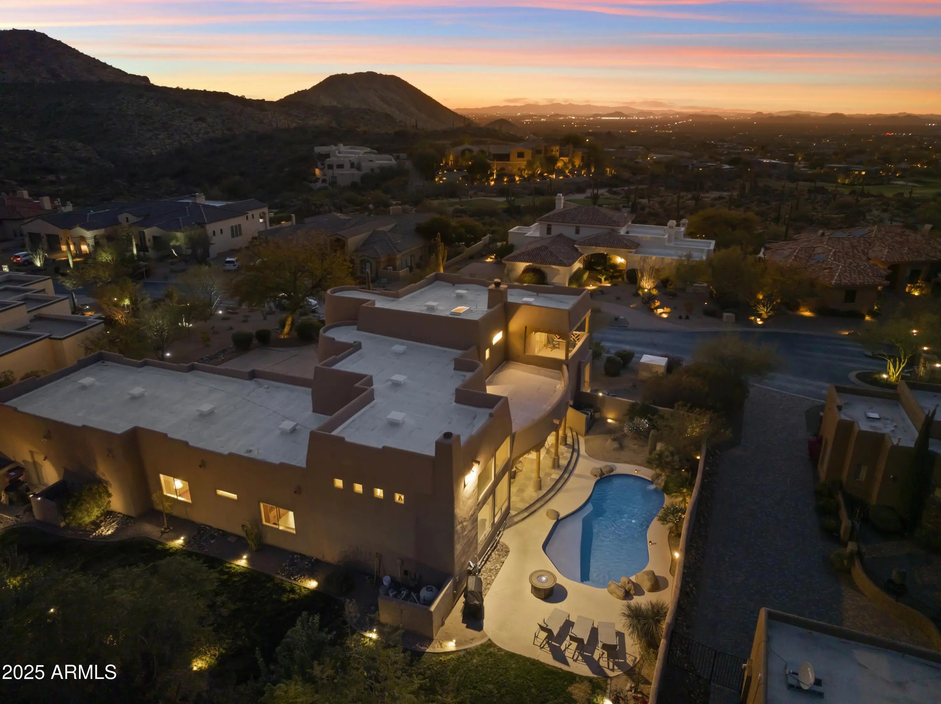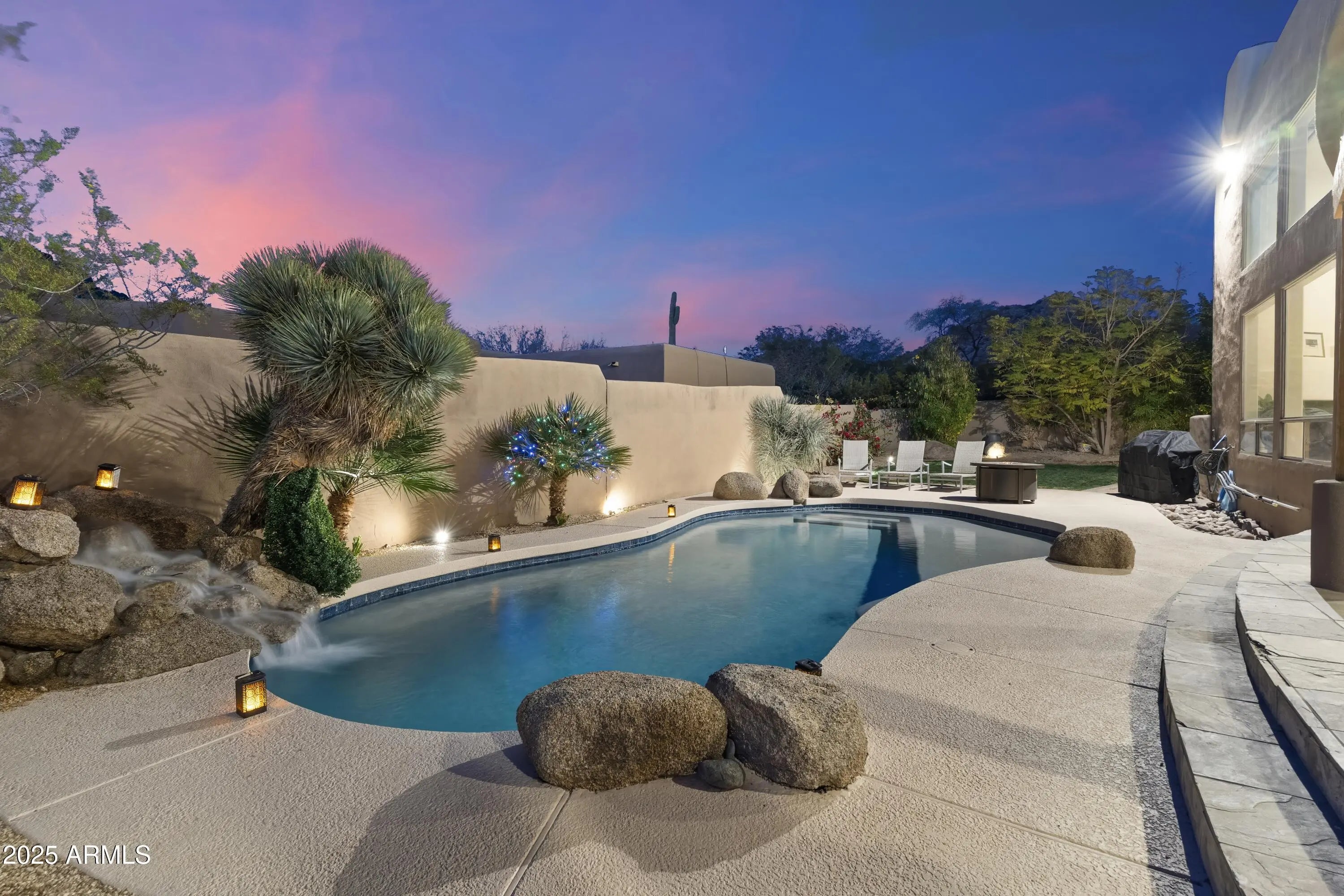 Gated Troon Village Retreat! Breathtaking sunrise and sunset views of Pinnacle Peak, Troon Mountain, and Scottsdale city lights.The grand entry sets the tone with 14-foot ceilings, leading into a spacious dining room, flex room with a wet bar, framed by stunning mountain views. The great room, w/ its floor-to-ceiling windows, remote-controlled gas fireplace, and custom window treatments and Travertine flooring is built for entertaining. The gourmet chef's kitchen is a showpiece, with Jeribi Blue quartzite countertops, a blue glass waterfall backsplash, matching Bosch appliances, a huge Dacor refrigerator, double ovens, a six-burner luxury gas stove, and a massive island with a second sink and abundant storage, all beneath soaring ceilings that flood the space with natural light. Beautiful grass oasis backyard with mature landscaping, flowering Jacaranda trees, and large pool with Baja shelf. The expansive primary suite is a private sanctuary, occupying the entire second floor with its own sprawling covered terrace featuring 270-degree views of mountains and city lights. Inside, a gas fireplace, custom media center, and sliding glass doors to the terrace create a true retreat. The spa-inspired ensuite offers double vanities, a jacuzzi tub, Jeribi Blue Quartzite counters, a custom tiled shower, and large dual walk-in closets. The home also includes a first-floor guest suite with an ensuite bath with custom shower, plus Jack & Jill bedrooms and full attached bath with modern Azurite vanities and upgraded lighting, and flooring. Additional highlights include a dedicated office with sunset views, a spacious dining room, and an oversized laundry room with quartzite counters and ample cabinetry. Outside, the huge resort-style backyard is an entertainer's dream. A recently upgraded PebbleSheen pool with a Baja shelf and boulder waterfall is surrounded by expansive patios, a blue crystal gas firepit, and a BBQ grill, with optional natural gas hookup. The expansive backyard has a lush, shaded 3,500 square foot grass lawn that is the perfect playtime setting for kids of all ages and pups. The mature landscaping with towering flowering Jacaranda trees, blooming bushes, and organic lemon tree add to the ambiance, all enclosed by a six-foot pueblo-style wall for ultimate privacy. The oversized three-car garage provides plentiful storage, and the home features three zoned, recently installed A/C units, an updated water purification system. Nestled in a prestigious gated North Scottsdale enclave, this home is a five-iron from Troon Golf Course and minutes from world-class golf, hiking trails, fine dining, and shopping. With top-tier upgrades, unparalleled views, and a prime location, this is Troon luxury living at its finest.