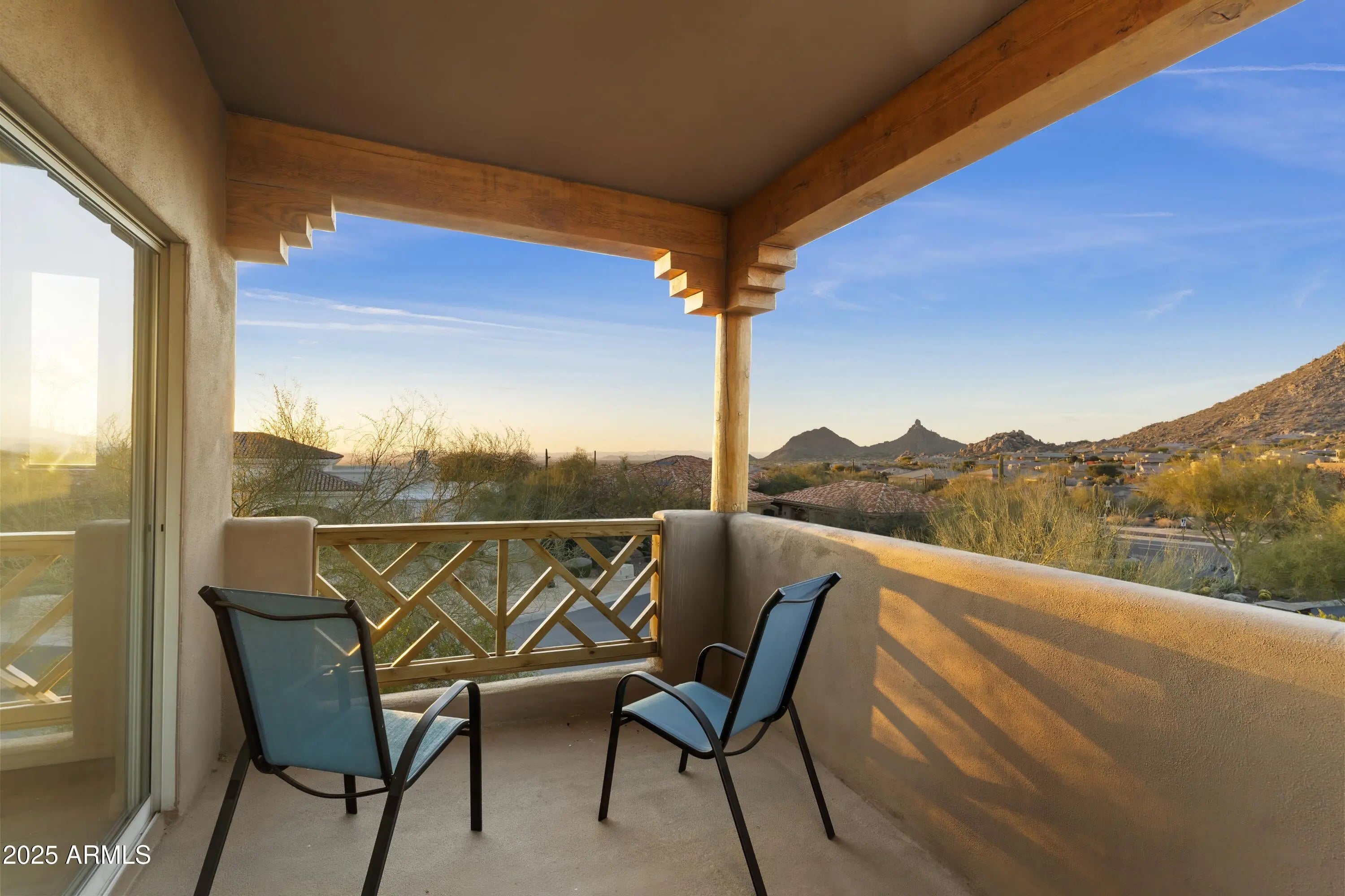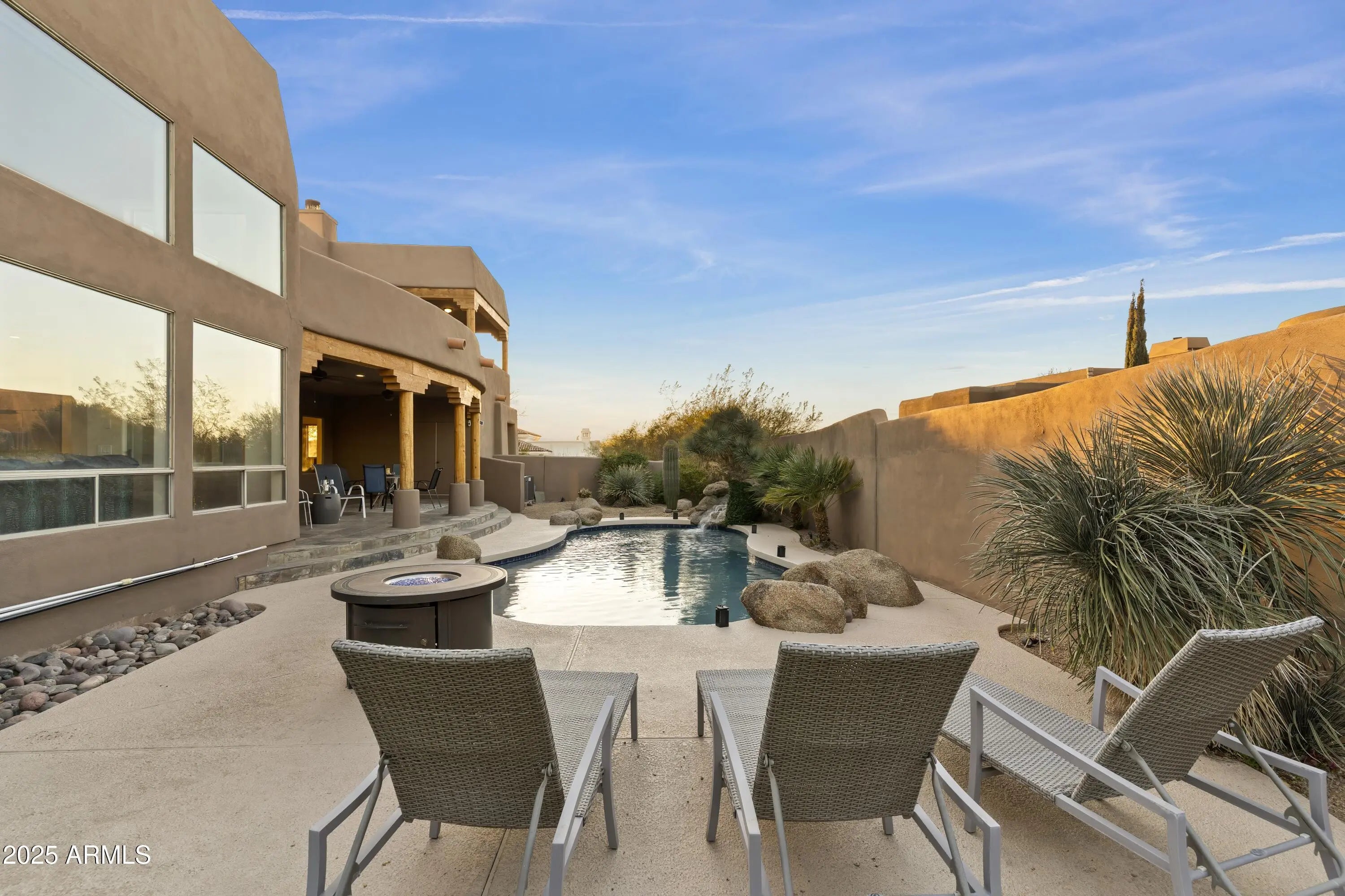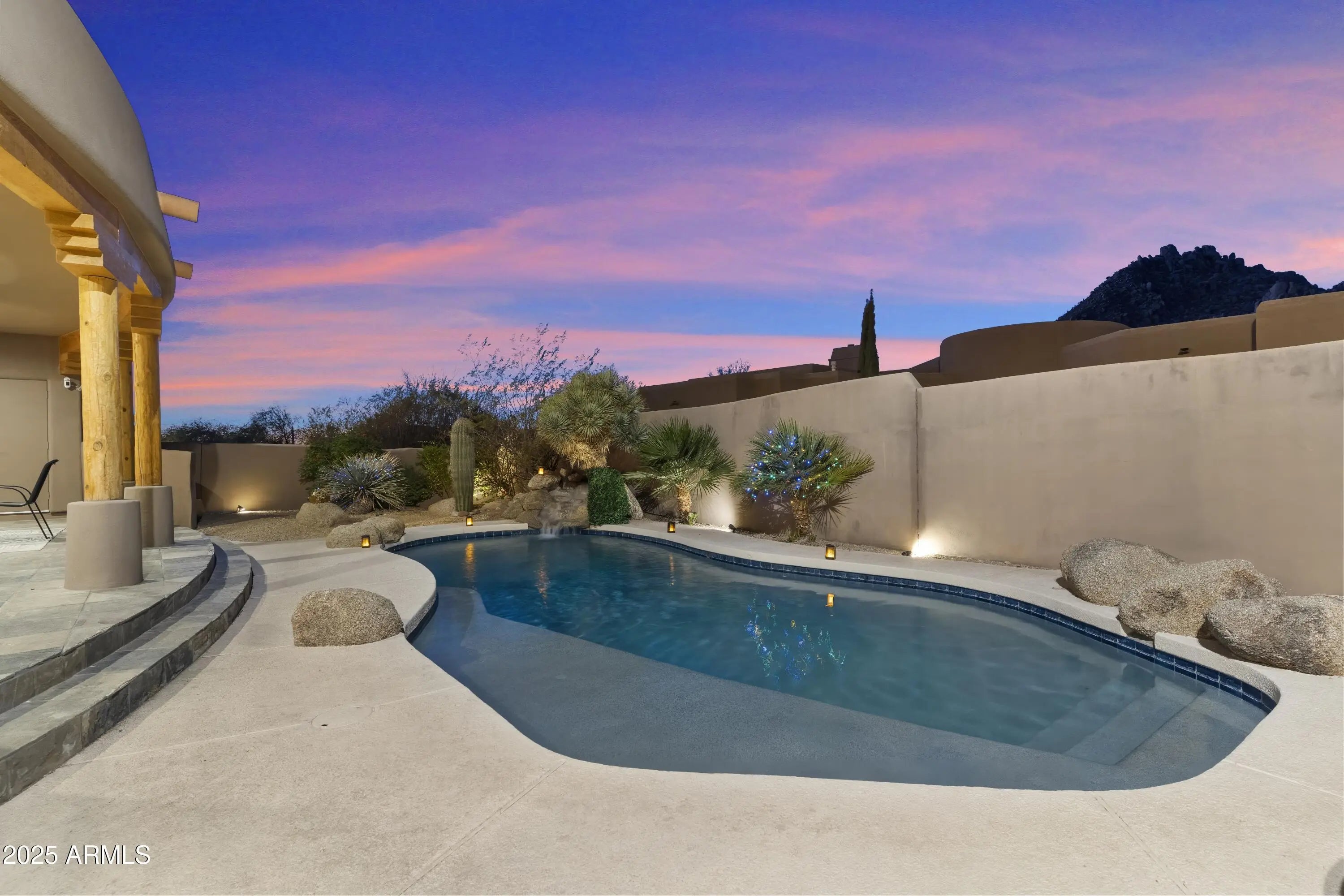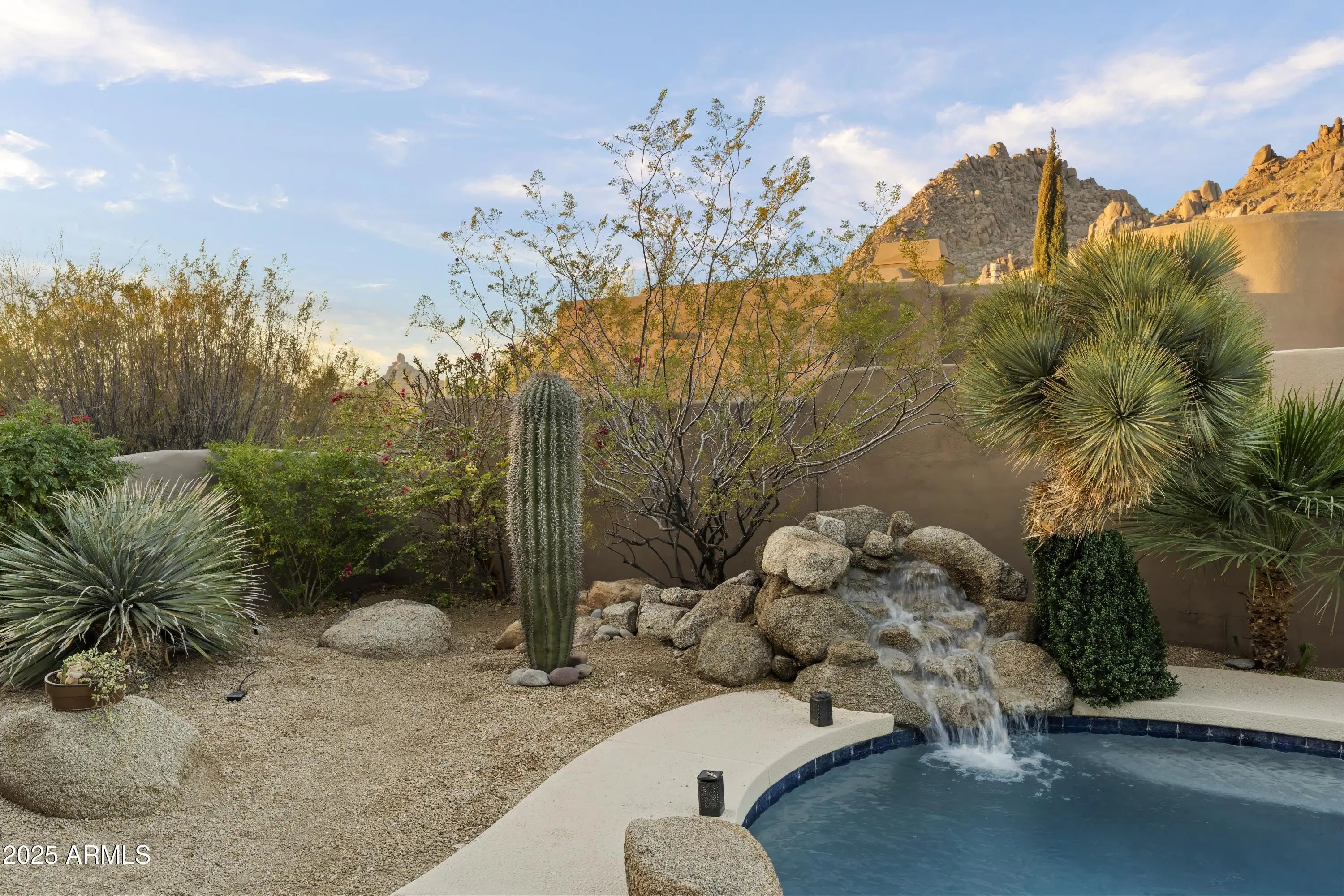 Gated Troon Village Retreat! Breathtaking sunrise and sunset views of Pinnacle Peak, Troon Mountain, and Scottsdale city lights.The grand entry sets the tone with 14-foot ceilings, leading into a spacious dining room, flex room with a wet bar, framed by stunning mountain views. The great room, w/ its floor-to-ceiling windows, remote-controlled gas fireplace, and custom window treatments and Travertine flooring is built for entertaining. The gourmet chef's kitchen is a showpiece, with Jeribi Blue quartzite countertops, a blue glass waterfall backsplash, matching Bosch appliances, a huge Dacor refrigerator, double ovens, a six-burner luxury gas stove, and a massive island with a second sink and abundant storage, all beneath soaring ceilings that flood the space with natural light. Beautiful grass oasis backyard with mature landscaping, flowering Jacaranda trees, and large pool with Baja shelf. The expansive primary suite is a private sanctuary, occupying the entire second floor with its own sprawling covered terrace featuring 270-degree views of mountains and city lights. Inside, a gas fireplace, custom media center, and sliding glass doors to the terrace create a true retreat. The spa-inspired ensuite offers double vanities, a jacuzzi tub, Jeribi Blue Quartzite counters, a custom tiled shower, and large dual walk-in closets. The home also includes a first-floor guest suite with an ensuite bath with custom shower, plus Jack & Jill bedrooms and full attached bath with modern Azurite vanities and upgraded lighting, and flooring. Additional highlights include a dedicated office with sunset views, a spacious dining room, and an oversized laundry room with quartzite counters and ample cabinetry. Outside, the huge resort-style backyard is an entertainer's dream. A recently upgraded PebbleSheen pool with a Baja shelf and boulder waterfall is surrounded by expansive patios, a blue crystal gas firepit, and a BBQ grill, with optional natural gas hookup. The expansive backyard has a lush, shaded 3,500 square foot grass lawn that is the perfect playtime setting for kids of all ages and pups. The mature landscaping with towering flowering Jacaranda trees, blooming bushes, and organic lemon tree add to the ambiance, all enclosed by a six-foot pueblo-style wall for ultimate privacy. The oversized three-car garage provides plentiful storage, and the home features three zoned, recently installed A/C units, an updated water purification system. Nestled in a prestigious gated North Scottsdale enclave, this home is a five-iron from Troon Golf Course and minutes from world-class golf, hiking trails, fine dining, and shopping. With top-tier upgrades, unparalleled views, and a prime location, this is Troon luxury living at its finest.