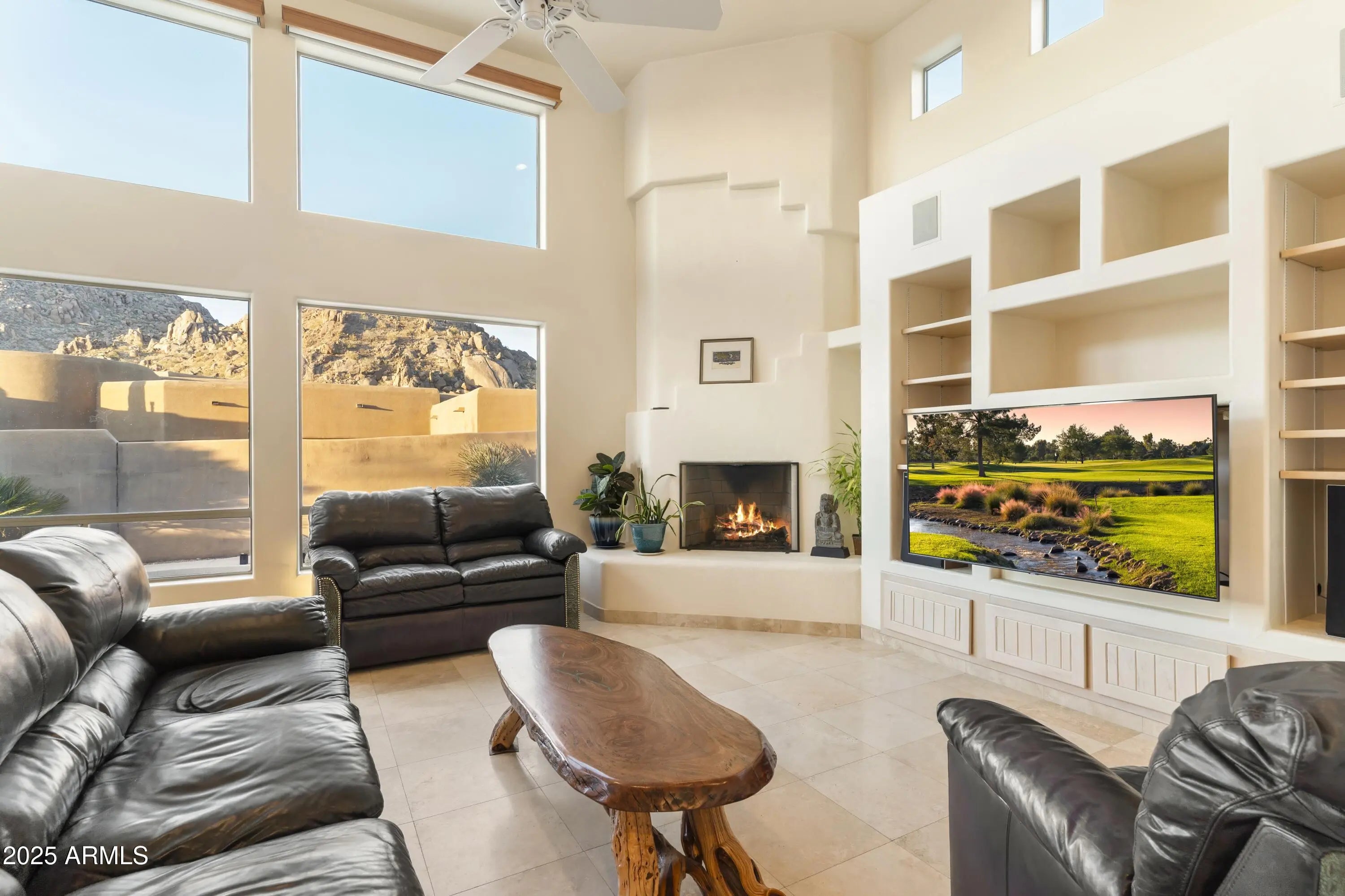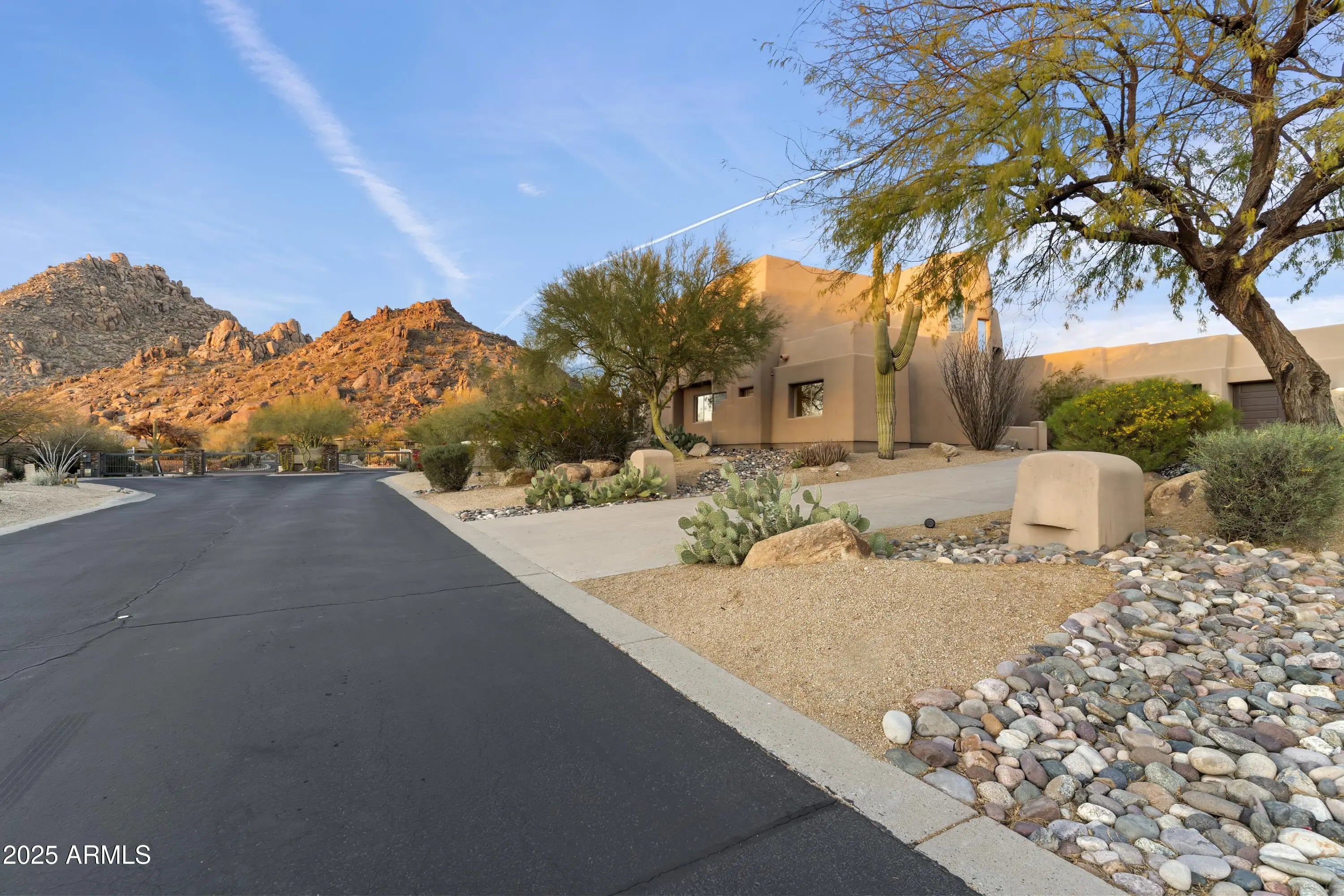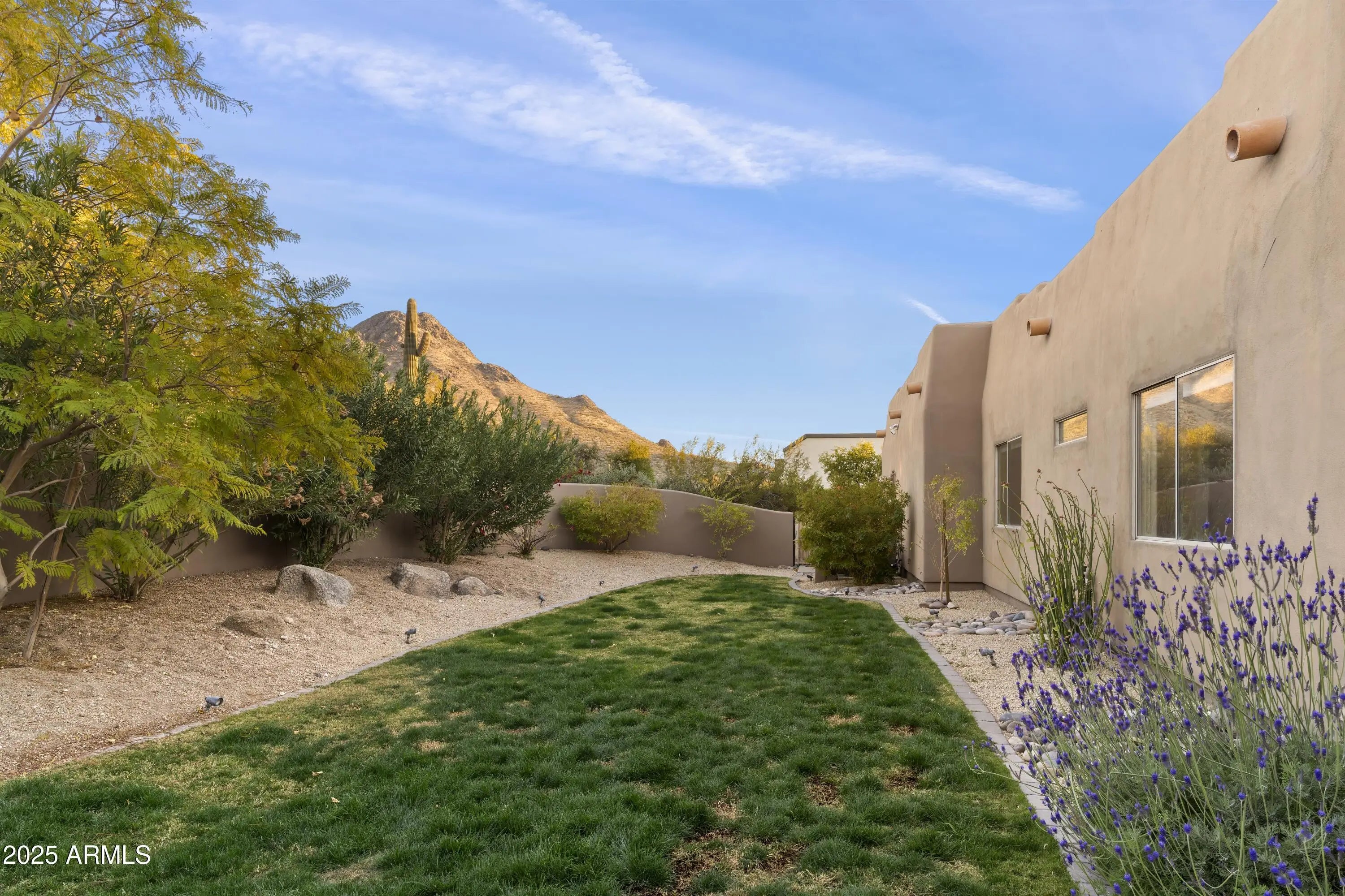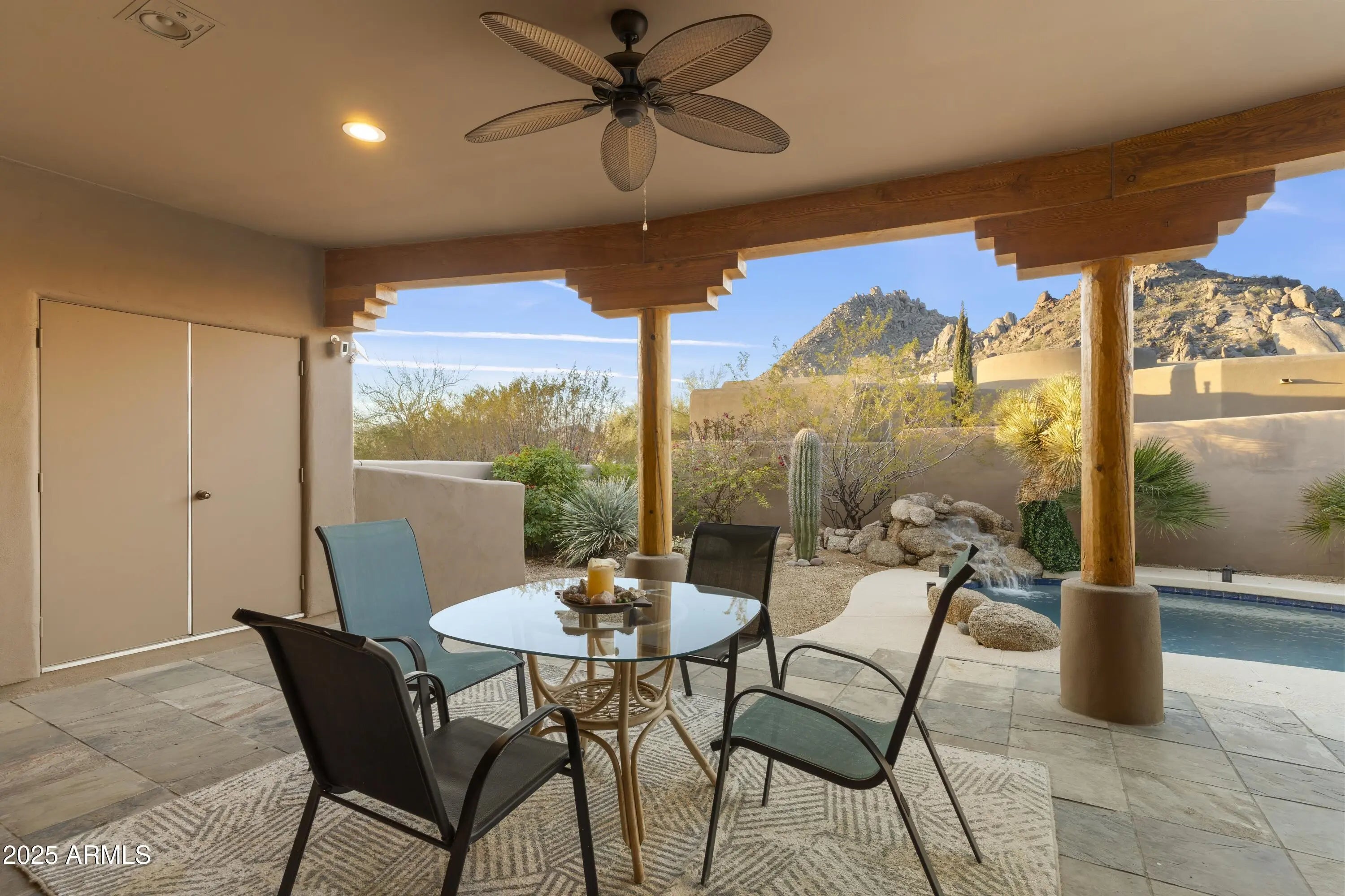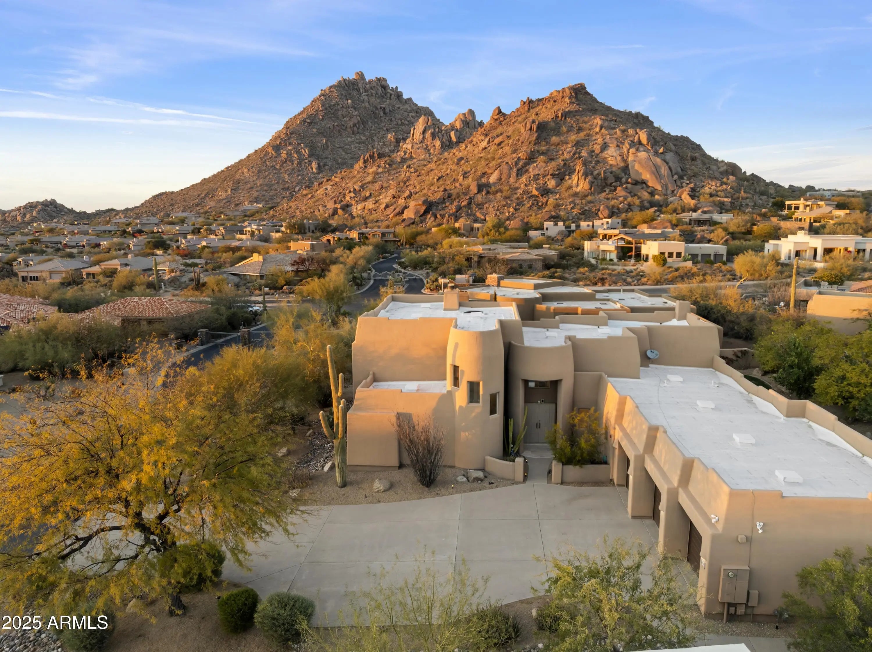 Gated Troon Village Retreat! Breathtaking sunrise and sunset views of Pinnacle Peak, Troon Mountain, and Scottsdale city lights.The grand entry sets the tone with 14-foot ceilings, leading into a spacious dining room, flex room with a wet bar, framed by stunning mountain views. The great room, w/ its floor-to-ceiling windows, remote-controlled gas fireplace, and custom window treatments and Travertine flooring is built for entertaining. The gourmet chef's kitchen is a showpiece, with Jeribi Blue quartzite countertops, a blue glass waterfall backsplash, matching Bosch appliances, a huge Dacor refrigerator, double ovens, a six-burner luxury gas stove, and a massive island with a second sink and abundant storage, all beneath soaring ceilings that flood the space with natural light. Beautiful grass oasis backyard with mature landscaping, flowering Jacaranda trees, and large pool with Baja shelf. The expansive primary suite is a private sanctuary, occupying the entire second floor with its own sprawling covered terrace featuring 270-degree views of mountains and city lights. Inside, a gas fireplace, custom media center, and sliding glass doors to the terrace create a true retreat. The spa-inspired ensuite offers double vanities, a jacuzzi tub, Jeribi Blue Quartzite counters, a custom tiled shower, and large dual walk-in closets. The home also includes a first-floor guest suite with an ensuite bath with custom shower, plus Jack & Jill bedrooms and full attached bath with modern Azurite vanities and upgraded lighting, and flooring. Additional highlights include a dedicated office with sunset views, a spacious dining room, and an oversized laundry room with quartzite counters and ample cabinetry. Outside, the huge resort-style backyard is an entertainer's dream. A recently upgraded PebbleSheen pool with a Baja shelf and boulder waterfall is surrounded by expansive patios, a blue crystal gas firepit, and a BBQ grill, with optional natural gas hookup. The expansive backyard has a lush, shaded 3,500 square foot grass lawn that is the perfect playtime setting for kids of all ages and pups. The mature landscaping with towering flowering Jacaranda trees, blooming bushes, and organic lemon tree add to the ambiance, all enclosed by a six-foot pueblo-style wall for ultimate privacy. The oversized three-car garage provides plentiful storage, and the home features three zoned, recently installed A/C units, an updated water purification system. Nestled in a prestigious gated North Scottsdale enclave, this home is a five-iron from Troon Golf Course and minutes from world-class golf, hiking trails, fine dining, and shopping. With top-tier upgrades, unparalleled views, and a prime location, this is Troon luxury living at its finest.