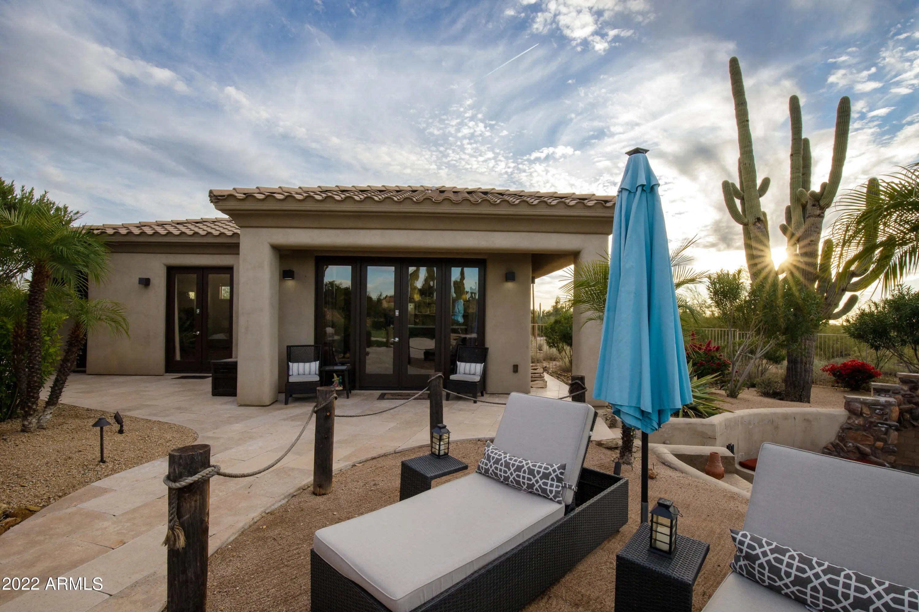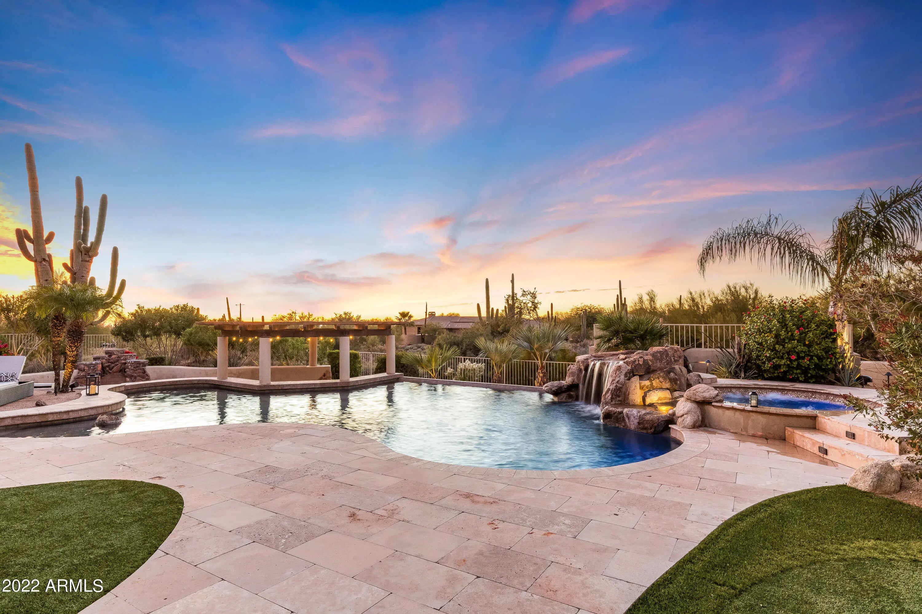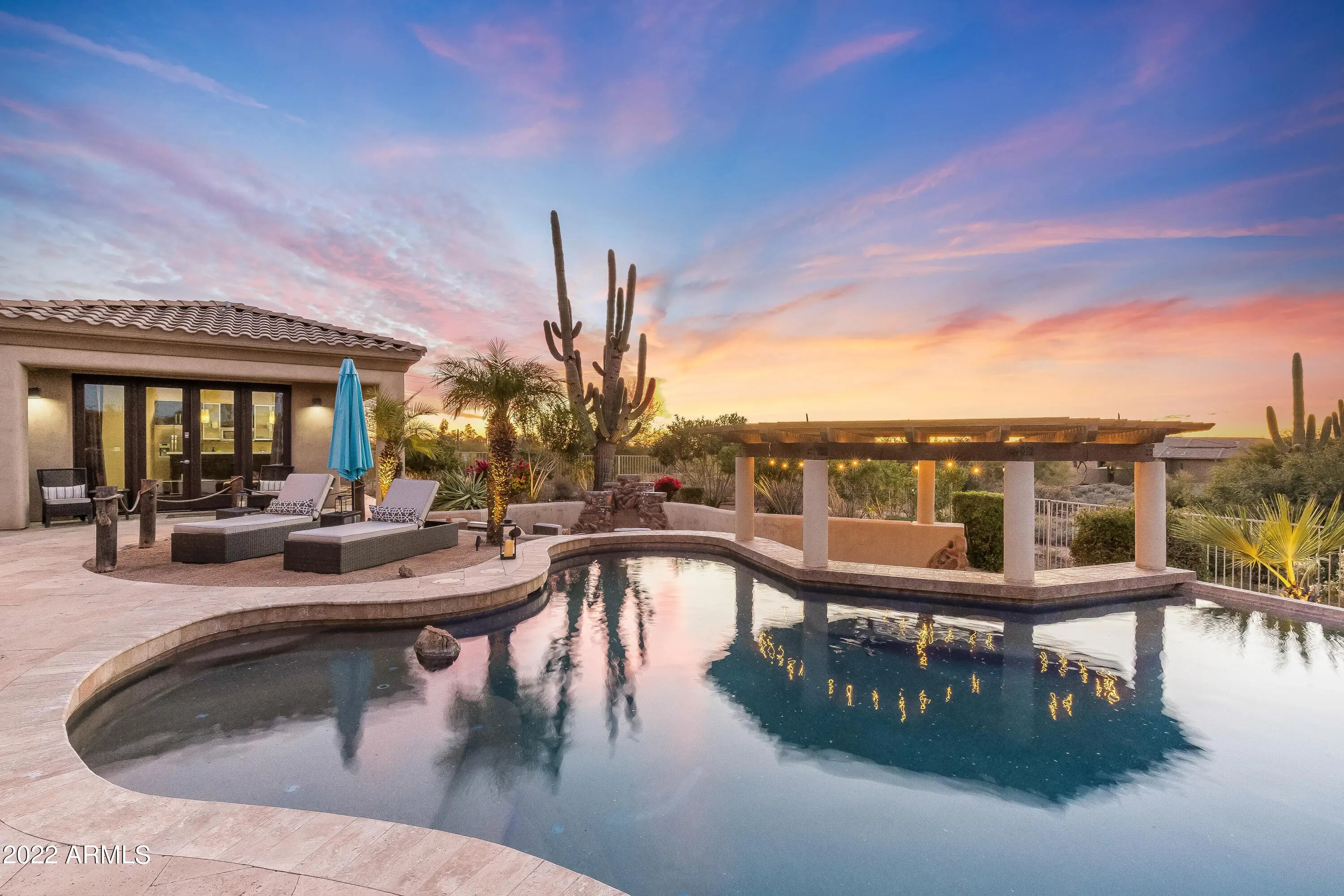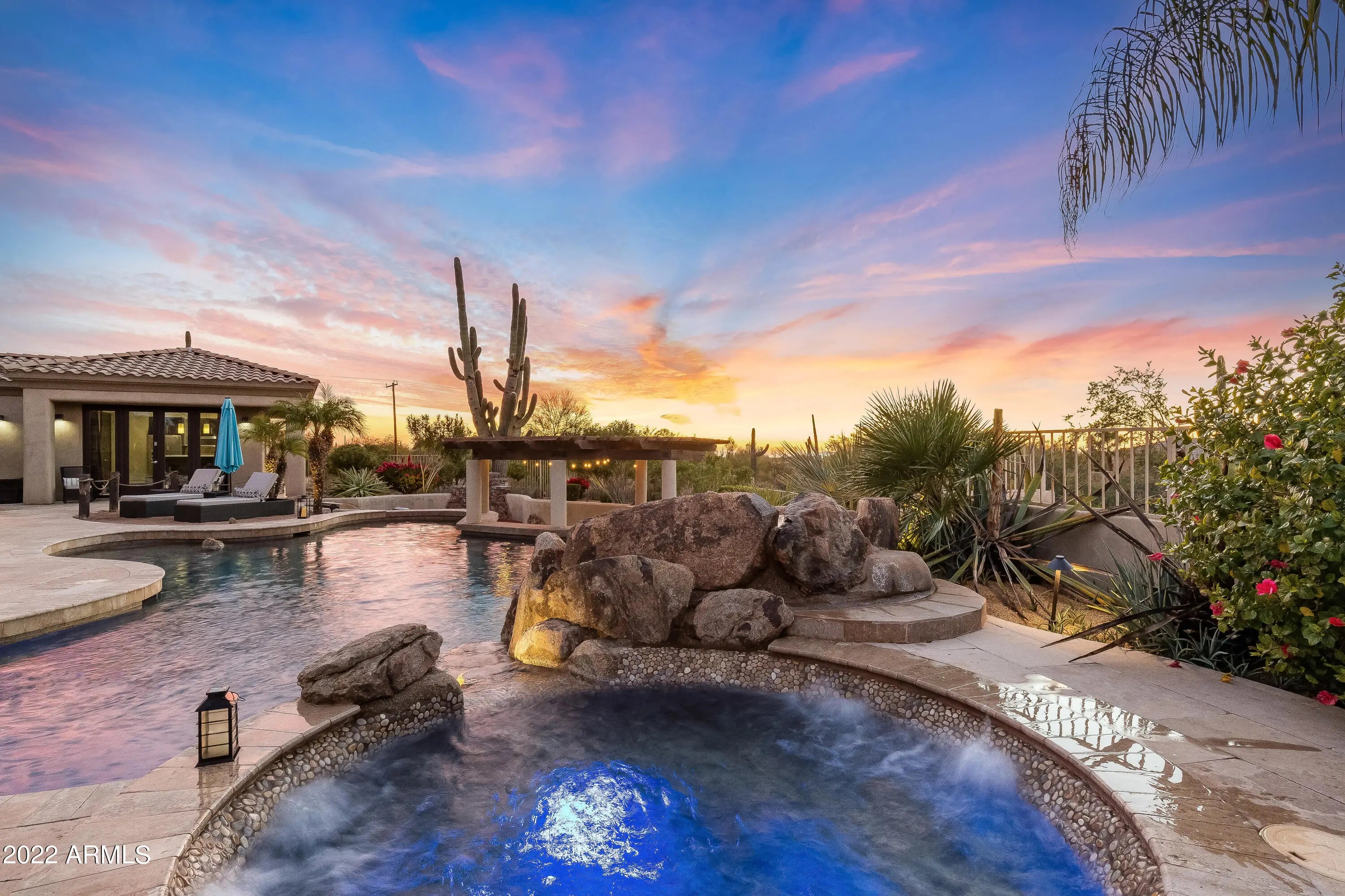 Come tour this entertainer's dream home with open living spaces, modern kitchens, and a resort backyard with a first-class guest house! Situated on a one acre quiet cul-de-sac lot in Saguaro Highlands, it is one of the few properties with natural area open space behind the lot that offers great privacy! This home offers a state of the art smart home package. Control4 delivers a truly intelligent smart home experience that makes life more convenient, safe, and enjoyable. With smart pads in the main suite, kitchen, garage and casita, you will always be conveniently in control of your home like TV's, lights, window coverings and more! In the garage you will find a ready to go EV charger! Recent updates include a new AC unit, irrigation and landscape lighting completed in 2024. Outdoor entertaining will be a dream in the spectacular backyard which delivers a custom Jack Nicklaus Series Putting Green, a huge covered patio, an expansive sparkling pool with custom built spa, water features and a swim-up bar, a built-in BBQ and gorgeous landscaped gardens. This gorgeous, spacious luxury residence showcases 5 bedrooms, 3.5 bathrooms, 3 car garage and is proudly perched in a peaceful neighborhood surrounded by the saguaro desert with mountain views. Dual living is made easy in this home, which features a convenient detached 1 bedroom, 1 bathroom casita with a private full kitchen and washer/dryer. The interiors of the home are sun drenched and spacious, showcasing soaring ceilings, a flowing open floor plan, tiled & wooden flooring, and an impressive dry bar. The oversized combined kitchen/living space will be a hub for entertainment and showcases a gorgeous feature stone fireplace and huge windows to take in the resort style outdoor views. Thoughtfully designed, the functional kitchen offers top-brand appliances, ample cabinet storage space, splash backs, a floating double waterfall island, and dining area. Cozy and warm, the living and family spaces provide the perfect zone for relaxation or indoor entertaining throughout winter. Five impressive bedrooms are showcased across the home. Discover the sizable main suite featuring back patio access, plantation shutters and an immaculate private bathroom with soaking tub, dual vanities and a huge walk-in closet. In addition, three generously sized bedrooms are located in the primary residence, while the separate casita contains a living area with backyard access, a fully equipped kitchen, one bedroom and one bathroom. Each of the bathroom spaces are separated throughout the residence, and have been tastefully designed to include ample vanity storage, luxury glass enclosed showers, deep soaking bathtubs and chic tiles. Located in proximity to excellent schools, retail shopping, parks, bars, restaurants, and essential amenities this incredible property must be inspected to be truly appreciated!