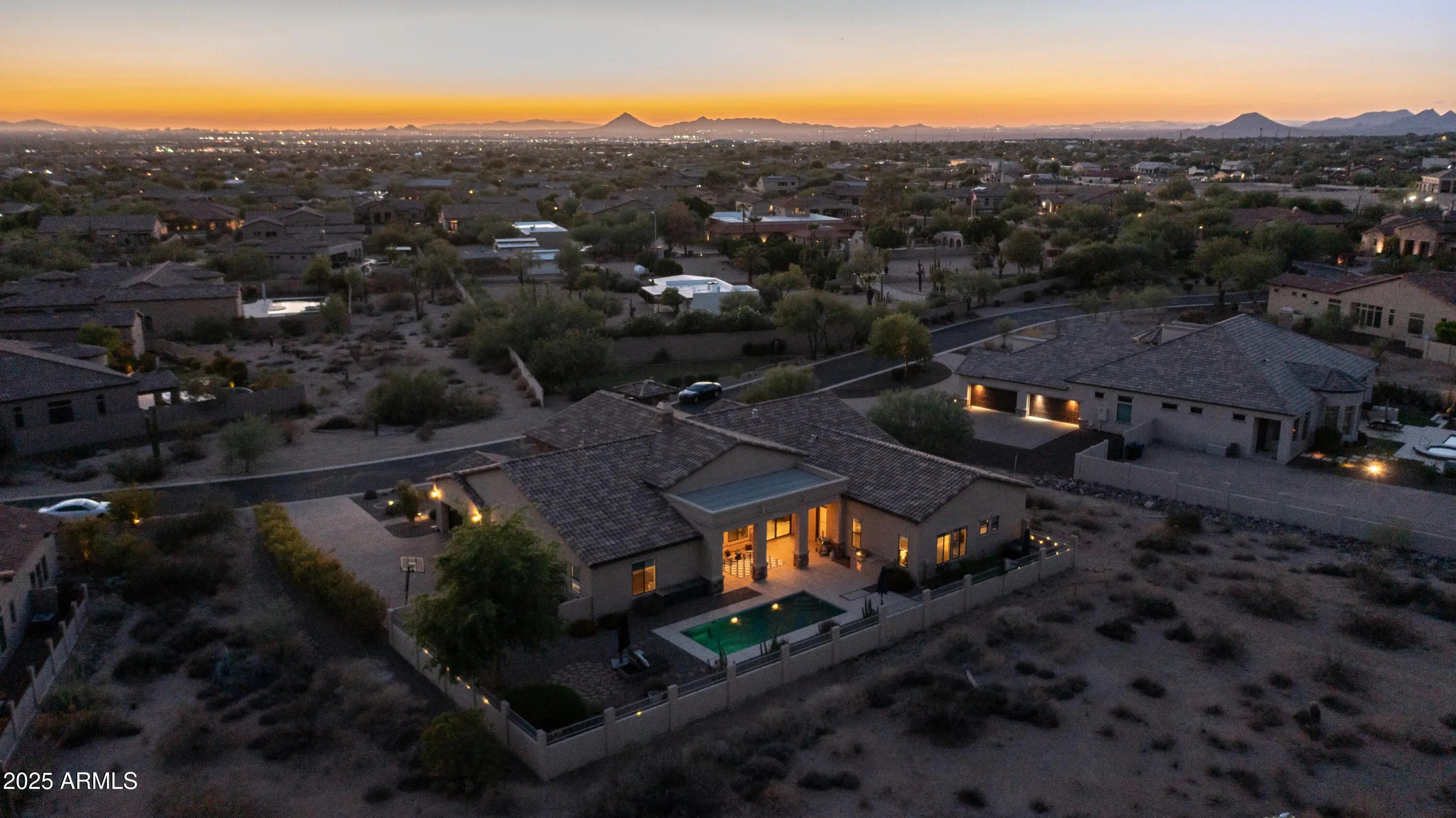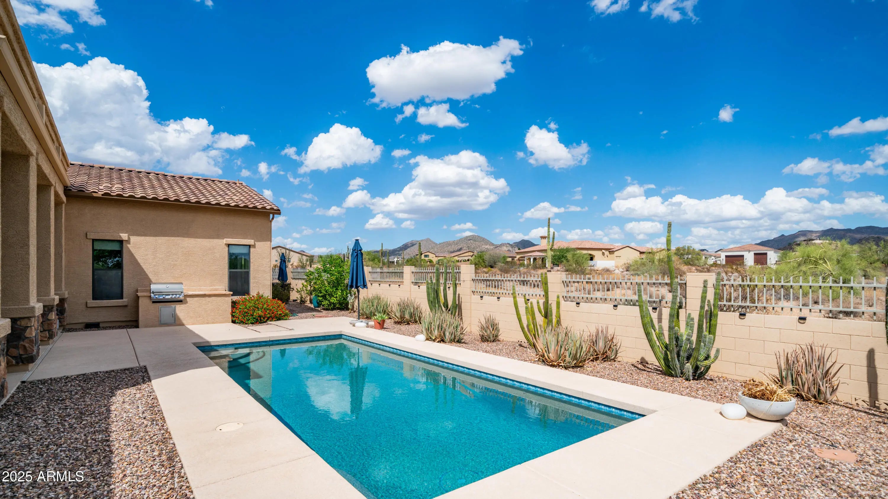 Best Priced home in Mountain Bridge. Spectacular single-level home in the upscale gated community of Estrella Vista at Mountain Bridge. This isn't just a home, it's a lifestyle, surrounded with some of the best hiking and biking trails in Arizona, the serene NE Mesa foothills plus all the amenities Mountain Bridge has to offer. This 4403 sq. ft. home blends elegance, comfort and style with seamless indoor-outdoor living. Featuring 5 bedrooms, 4.5 baths, that includes a private guest suite with its own entrance, perfect for a mother-in-law suite, teen room or hosting guests in style. The open and spacious floor plan includes a formal dining room, office/den and a chef's kitchen with granite countertops, 6-burner gas cooktop, wall oven, microwave, an oversized sit-up island, butler's pantry plus walk-in pantry and opens to kitchen dining and great room with a cozy stone fireplace. A bonus/media room provides flexible space for entertainment or relaxation. The luxurious primary retreat offers a private bonus room, perfect for a gym, office, nursery, or cozy sitting area. The spa-like bathroom features dual vanities, a soaking tub, a spacious walk-in shower, and an expansive walk-in closet. This home sits on a 35,439 sq. ft. lot backing to a natural wash for privacy and an oversized 4-car garage, RV gate, and the room to build an RV garage. Relax and unwind or entertain family and friends in the sparkling pool with beautiful mountain views, peaceful sunrises, and breathtaking sunsets in this tranquil desert setting. This award-winning master-planned community offers resort-style living for all ages with amenities that include Pool, Tennis, Pickleball, Basketball, Fitness Center, Playground, Clubhouse, Walking and Biking Trails and more. Fantastic location with Great Schools, Restaurants and Shopping, just one mile to the 202 freeway,15 minutes to Saguaro Lake and just 20 Minutes to Sky Harbor, Mesa Gateway Airports and Scottsdale. Experience the perfect blend of luxury and resort-style living, surrounded by the breathtaking natural beauty of the Sonoran Desert.