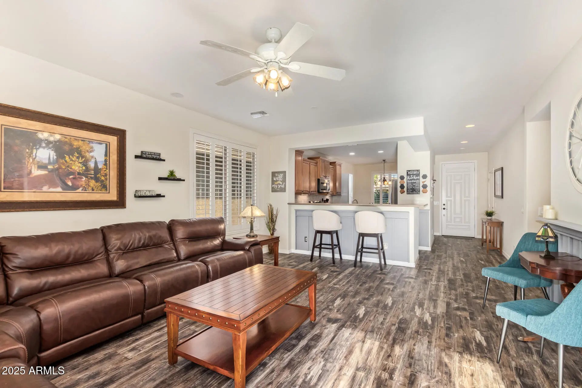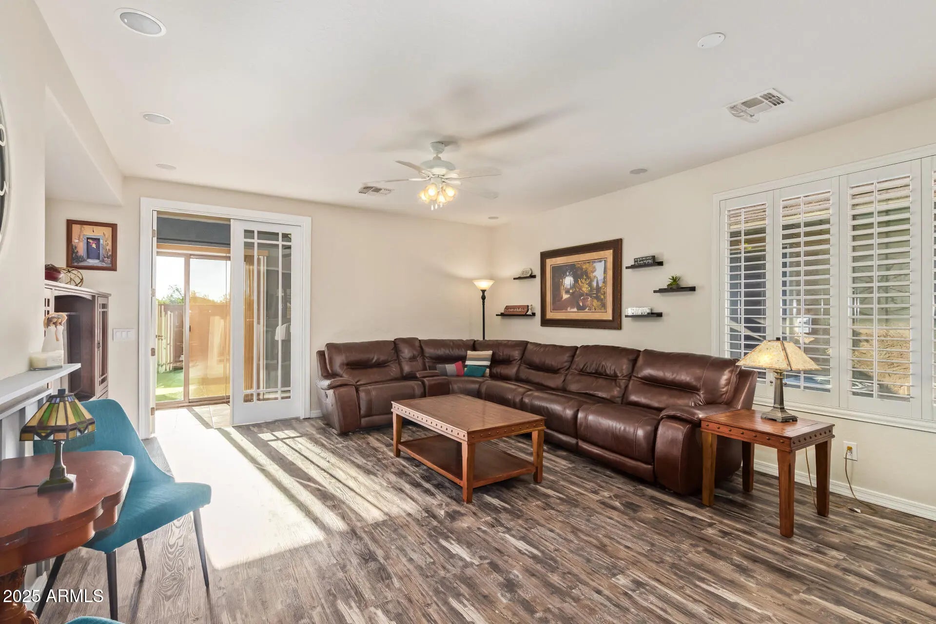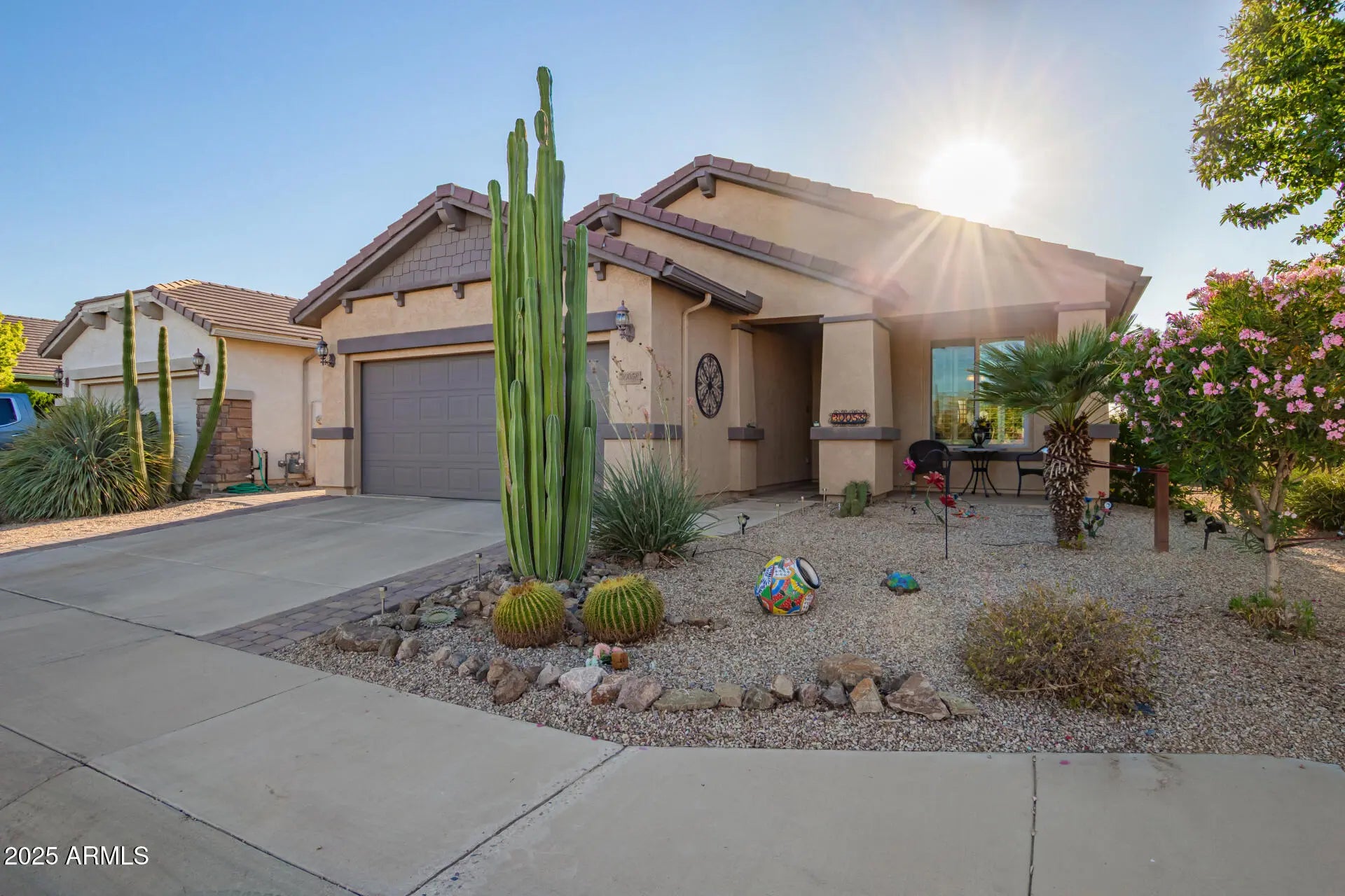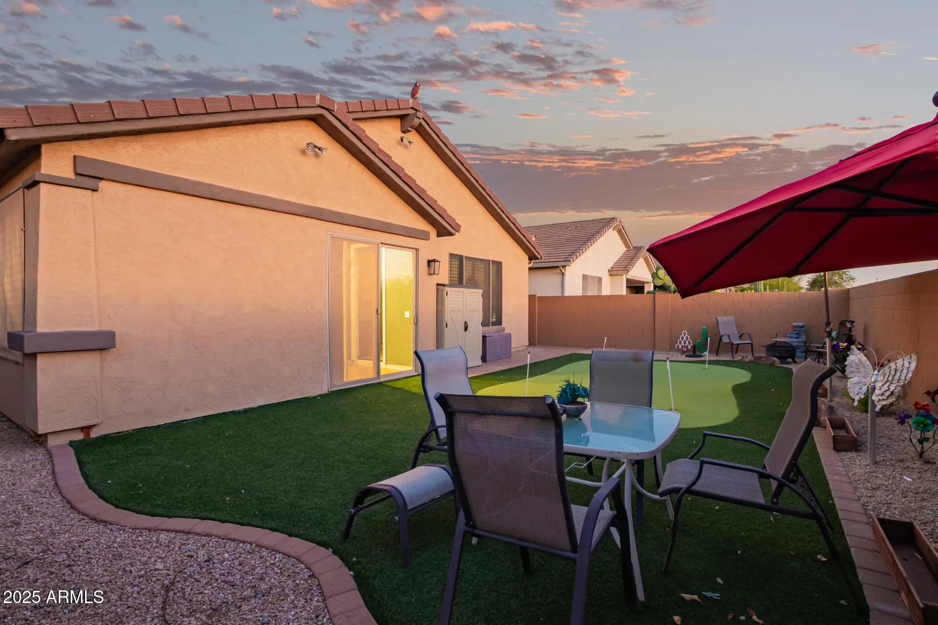 Welcome to this beautifully updated 2-bed, 2-bath home in the 55+ gated community of Solera at Johnson Ranch! Inside enjoy LVP flooring throughout with carpet only in the primary bedroom, plantation shutters, and a bright open layout. The kitchen offers maple cabinets, Corian counters, stainless steel appliances, and a tile backsplash. Energy efficiency shines with 100% OWNED PV solar panels. The garage features epoxy floors and built-in cabinets, while a tiled and enclosed patio adds 144 sq ft of bonus space. Outdoors, enjoy a private backyard with no rear neighbors, a turf putting green, and west-facing views for stunning Arizona sunsets. Solera residents enjoy resort-style amenities including pools, fitness center, billiards, pickleball, and more! Active adult living at its finest!
