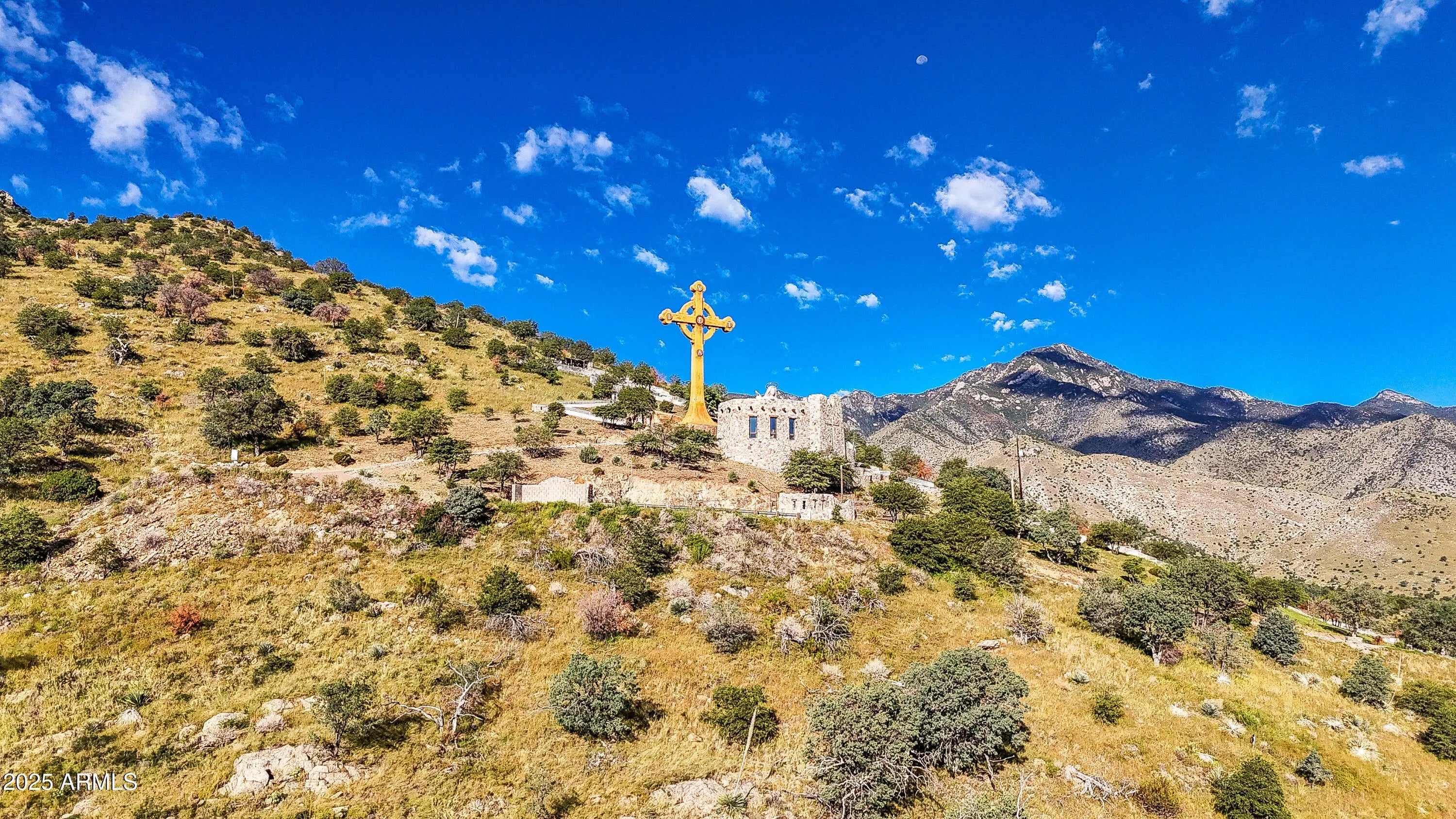 Stunning Custom Home with Panoramic Mountain Views on 5+ Acres. Nestled at the base of the Huachuca Mountains, this exceptional custom home offers breathtaking views and unmatched privacy on over 5 serene acres. The iconic Our Lady of the Sierras shrine and cross are clearly visible, adding to the one-of-a-kind setting. Inside, the home features two spacious primary suites, each with its own full bath, plus a convenient half-bath for guests. A dedicated office with patio access makes working from home a pleasure. The open great room is the heart of the home, showcasing a dramatic stone gas fireplace and large picture windows that frame the stunning mountain and shrine views. The gourmet kitchen is both beautiful and functional, offering a breakfast bar, pantry, upgraded stainless steel appliances, and an electric range (plumbed for gas if preferred). The dining area, with its charming bay window, fills the space with natural light. Oversized three-car garage with two large storage closets. Private well. Expansive patios perfect for enjoying the scenery. Ideal elevation of 5,230' for year-round comfort. This property is more than a homeit's a private retreat with space to spread out, views that inspire, and endless potential. There is also no HOA! Conveniently located just minutes from Sierra Vista, and a short drive to historic Bisbee and Tombstone. Tucson International Airport is just over an hour away. Come experience this remarkable home for yourselfa true must-see in Hereford, AZ!
