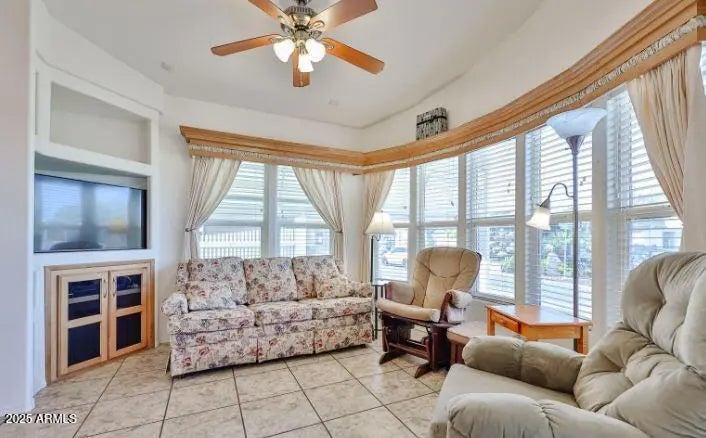 Upgraded 1BD/1.75 BA park model, recently added Arizona Room by Ernie Young—well known for creating beautiful additions in Happy Trails. The AZ room features built-in shelving, a remote-controlled fireplace, and tons of natural light. Appliances & fixtures have been updated for a new home and move-in-ready feel. Detached casita comes with laundry & a private water closet & shower. A very spacious entertainment and lounging area, perfect for having company over or just relaxing. Enough parking on newer seal coated, stamped and colored spots. Some furniture & accessories included. Resort living with pickleball, pools, heated spa, onsite Bar & Grill, golf and endless social events. Lot ownership included!