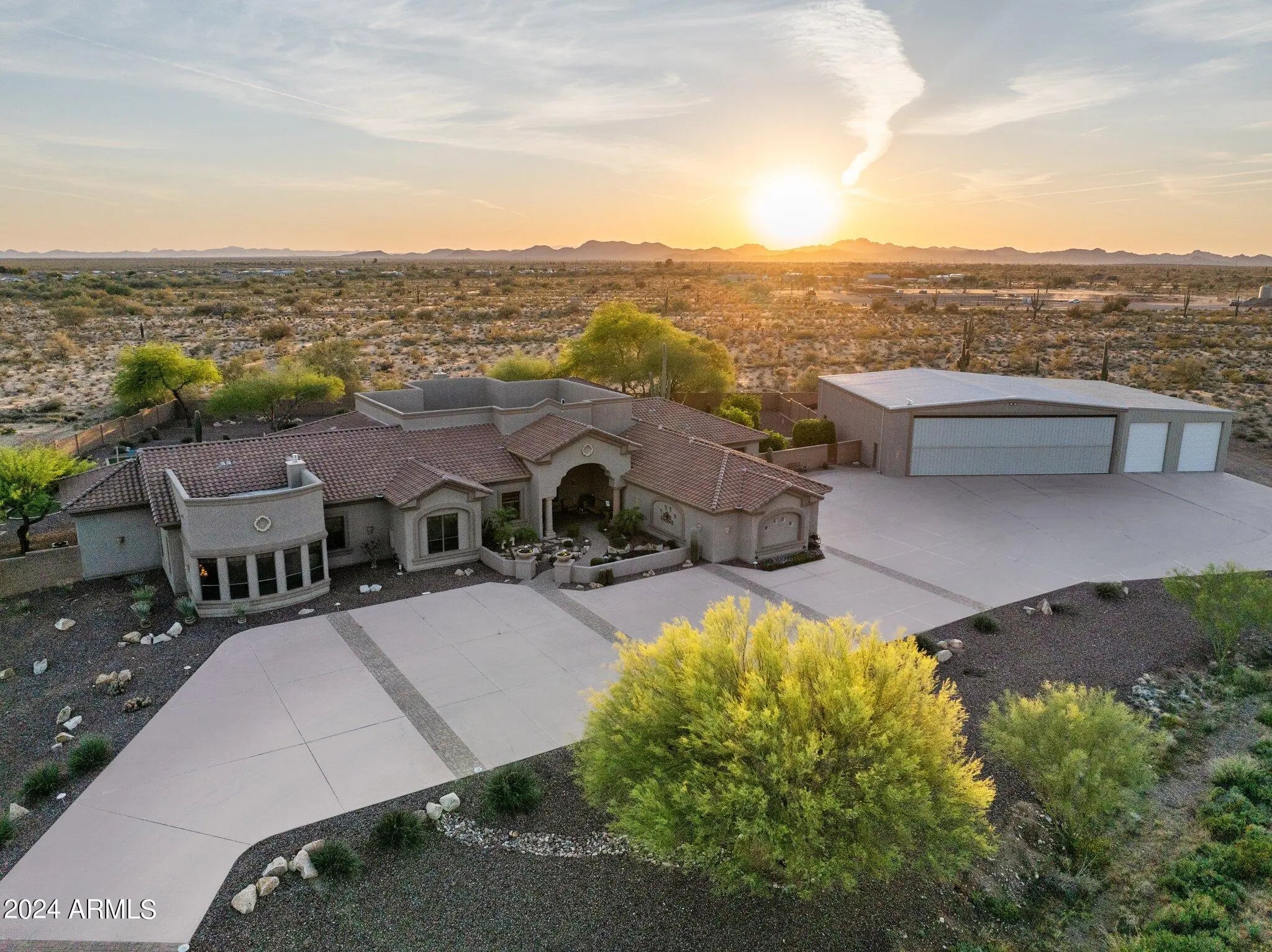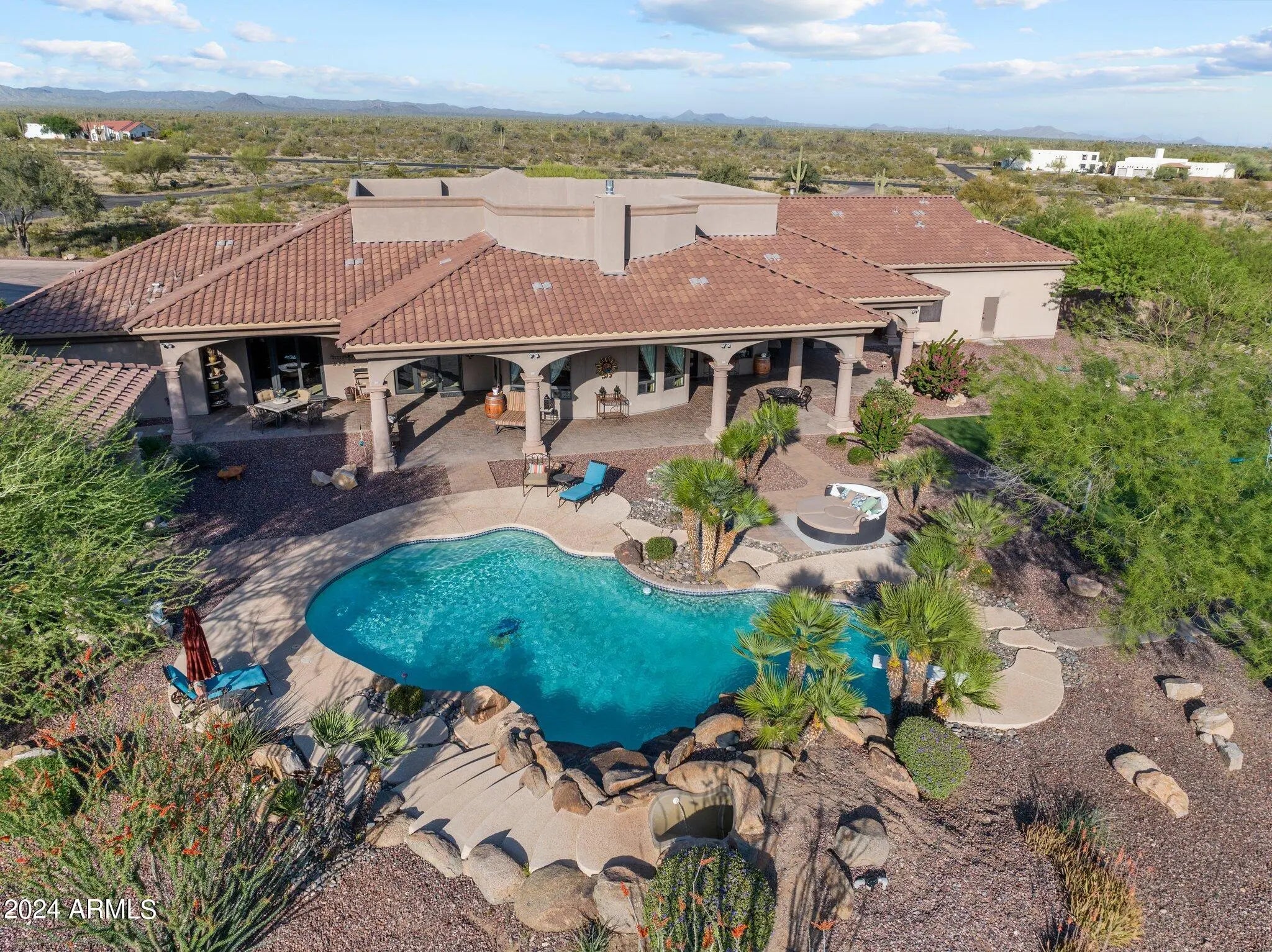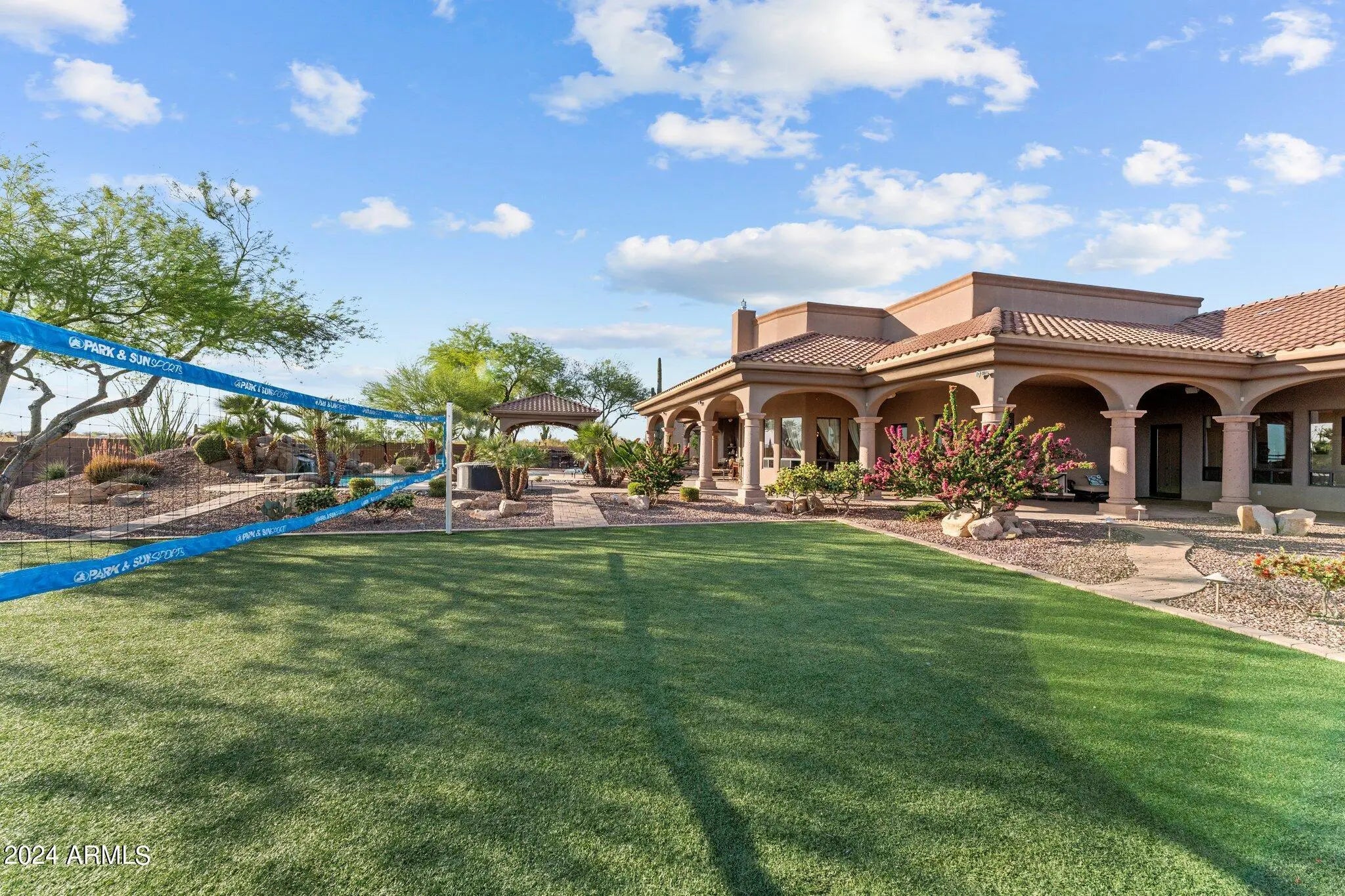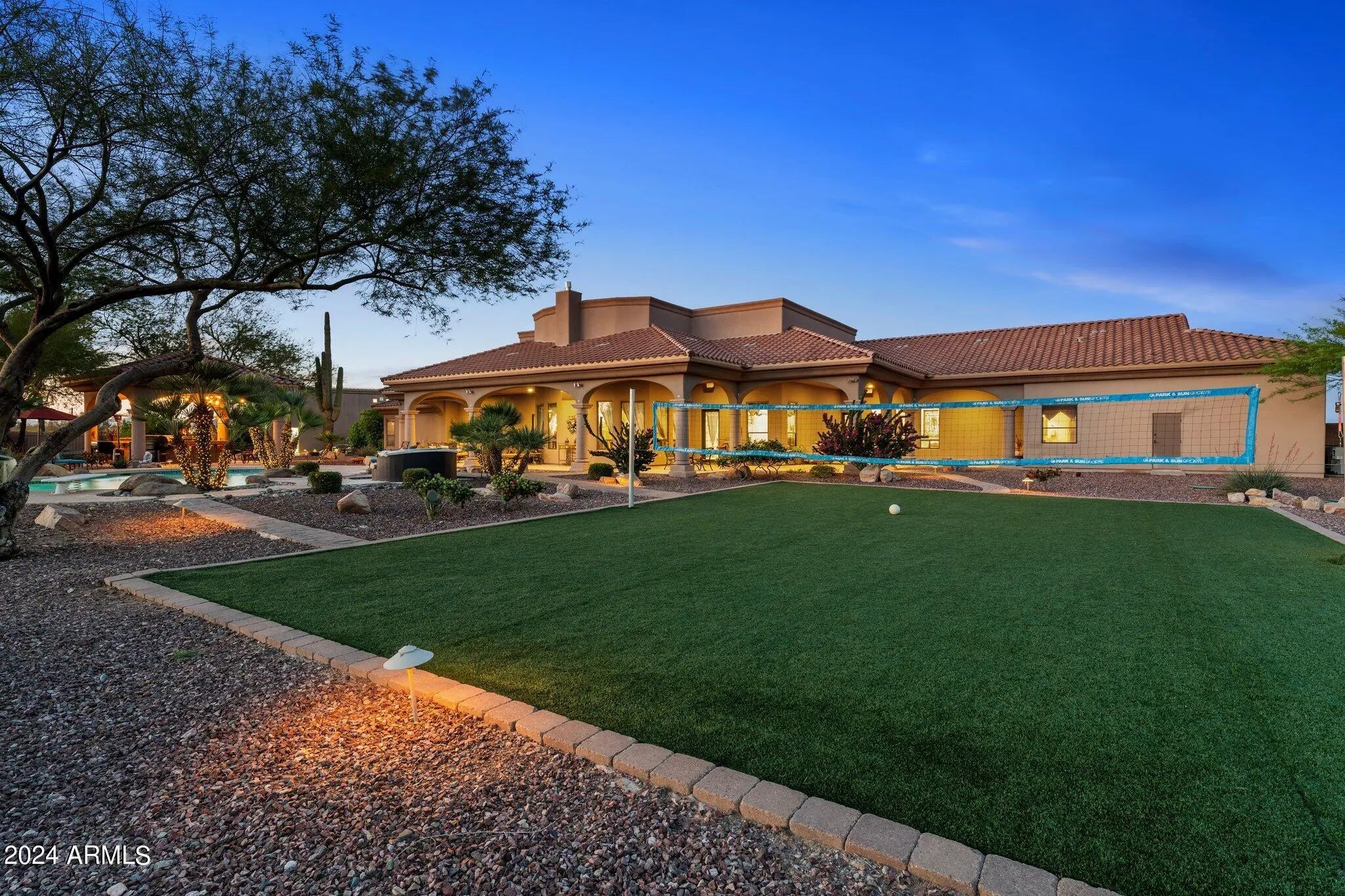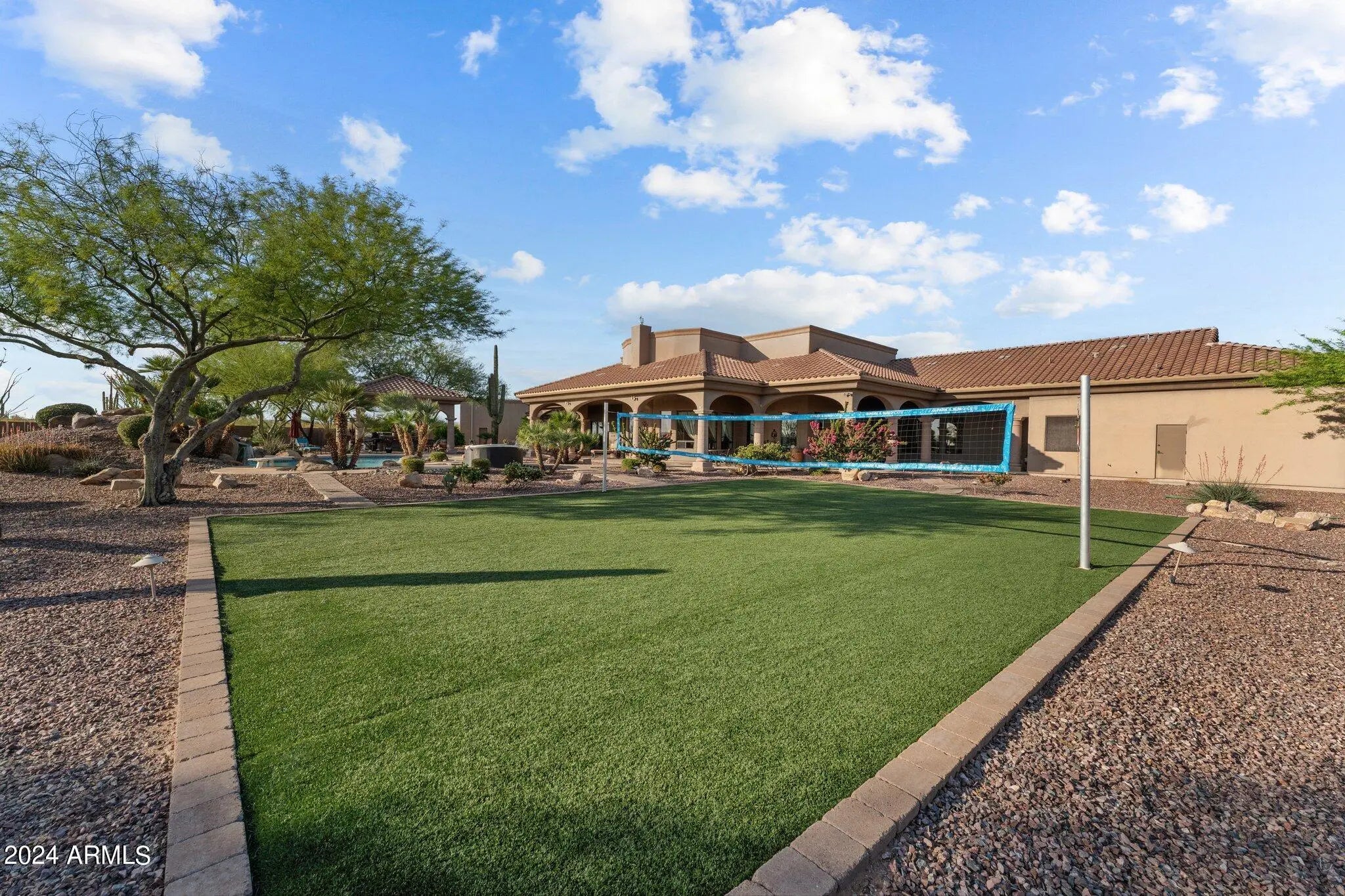 Set on 5 acres within a private airpark, this Tuscan-style estate blends timeless architecture with the kind of amenities most people only experience on vacation. With 5 bedrooms and 4.5 bathrooms, the home is designed for both elegance and ease. Sunlight pours into open living spaces, stone accents add warmth and texture, and the flow between rooms makes daily living feel effortless while still capturing the richness of Tuscan design. Step outside and the property transforms into your own private resort. A shimmering pool takes center stage, bordered by multiple lounge areas perfect for soaking in Arizona's endless skies. A full volleyball court invites spirited games with friends, while the outdoor kitchen turns meals into events, with space for everything from weekend barbecues to... sunset dinner parties. Shaded patios and breezeways extend the living experience outdoors, creating spaces where conversation lingers and evenings stretch long into the night. For aviators, the estate offers something truly rare - a private hangar with direct access to the airstrip. Imagine starting your day with the freedom to take off right from home. An oversized RV garage extends that same sense of possibility, with room for motorhomes, vehicles, collections, or creative pursuits. Just beyond the main estate, an additional 4.88-acre parcel is included. Separate from the airpark and free from HOA restrictions, it ensures privacy today and possibilities tomorrow. Whether envisioned as an equestrian setup, expansive workshops, or simply preserved as open land, it adds another layer of freedom to an already extraordinary property. This estate lives like a destination - a place where mornings begin with desert light, afternoons are spent in the pool, and evenings gather around the outdoor kitchen under a canopy of stars. It's not just a home, it's a lifestyle designed for those who expect every day to feel exceptional.