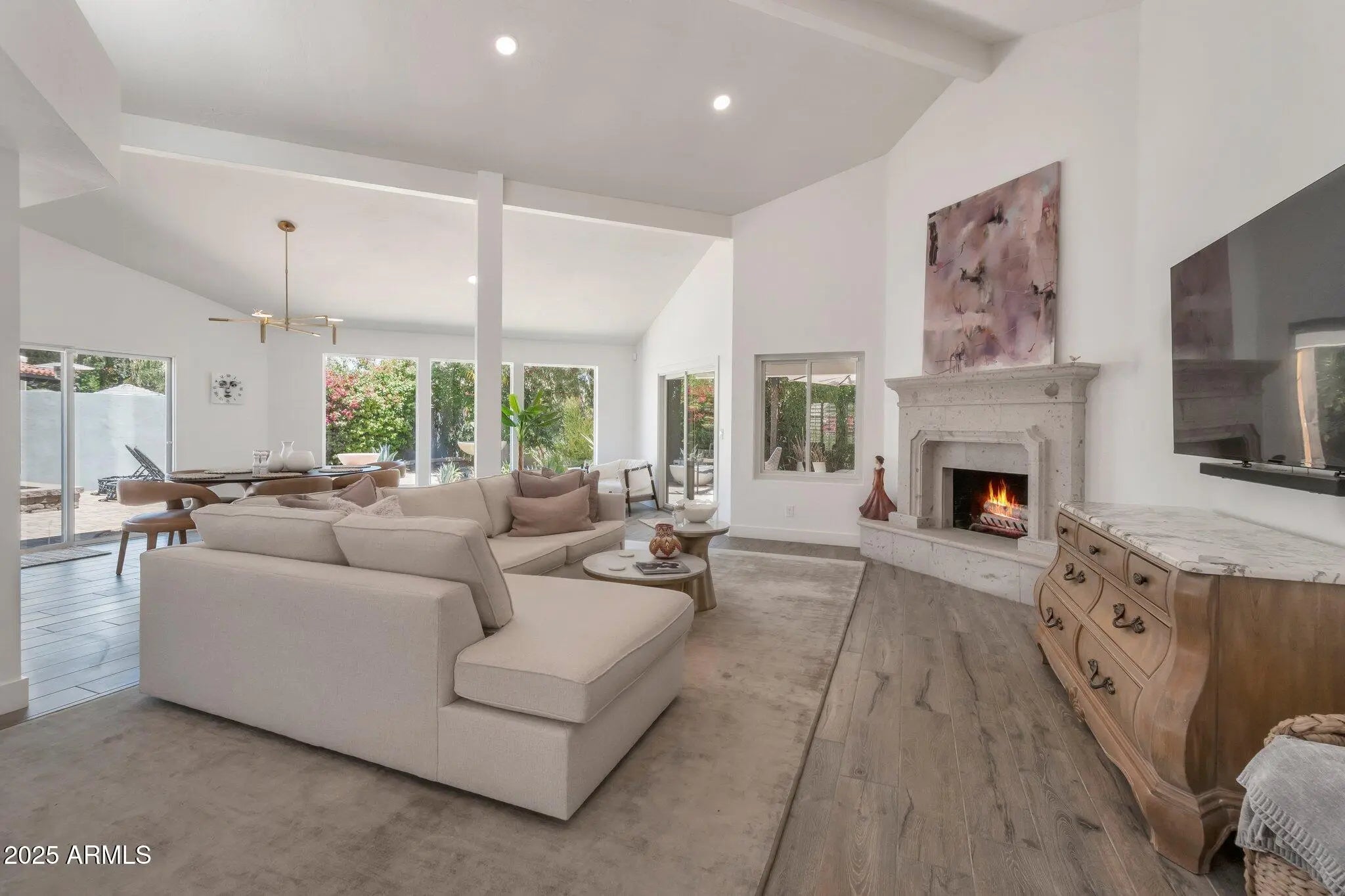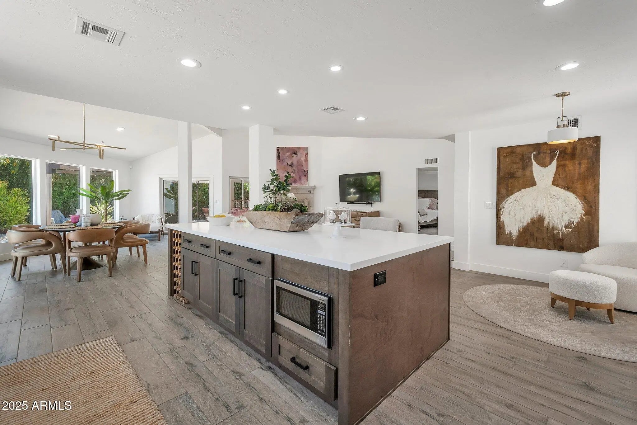 Turnkey Malouf-built home with incredible natural lighting & high ceilings. This is an open concept renovation completed in 2022. Ideally located just around the corner from access to Scottsdale's famous Greenbelt. Life-friendly flooring, two-tone kitchen cabinetry, stainless appliances, and quartz countertops with a huge kitchen island ideal for entertaining. The great room has cozy seating areas ideal for a reading nook next to the big, bright windows, cocktail hour in the corner by the kitchen, and casual dining near the fireplace. Multiple exits to the private, rear yard that features multiple planters, citrus trees, and low-maintenance hangout space. Custom pavers throughout complete the low maintenance, comfortable backyard.