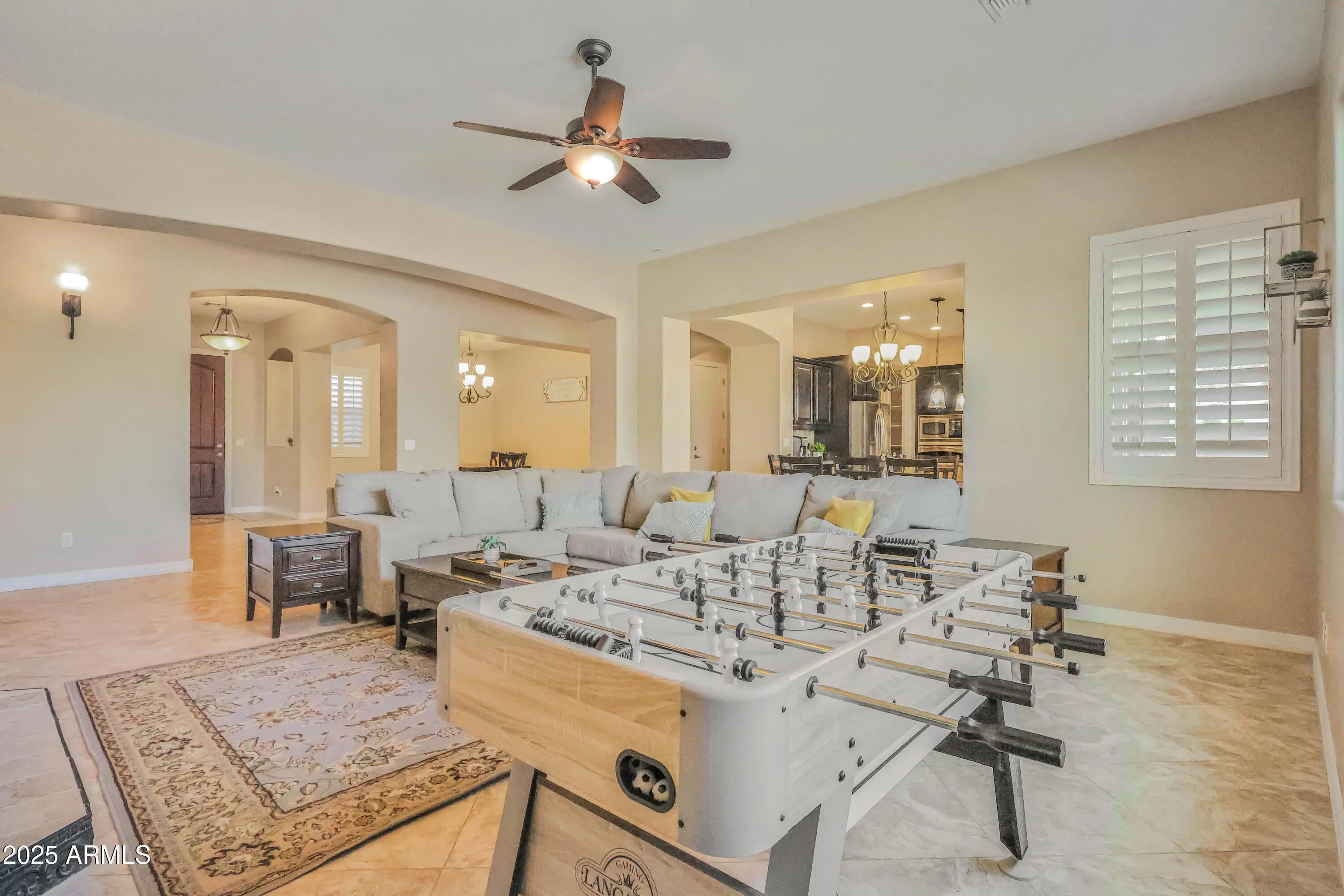 Welcome to this immaculate 4-bedroom, 3.5-bathroom home offering nearly 3,000 sq. ft. of luxurious living space on a large 0.31-acre lot with a HEATED Pool with Grotto and Slide! Built in 2012, this property has been thoughtfully upgraded inside and out, combining modern finishes with a functional split floor plan. Relax inside a huge great room design, a formal dining area, guest suite, and convenient Jack & Jill bathroom. The chef's kitchen features upgraded granite countertops, stainless steel appliances including a convection oven, travertine backsplash, and a massive pantry. A custom entertainment niche, plantation shutters throughout, and elegant 20x20 tile with mosaic accents add to the home's model-like appeal. The primary suite offers a spa-inspired bath and an enormous walk-in closet, while the 3-car tandem garage comes complete with cabinets and epoxy flooring. Outdoors, enjoy your own private resort: a heated play pool with water slide, grotto, LED lighting, hardscape with travertine and a turf putting green. A gated courtyard, low-maintenance landscaping, RV gate, and tumbled paver driveway enhance both curb appeal and functionality. Located in a highly desirable area just minutes from San Tan Village and freeway access this home truly has it all.