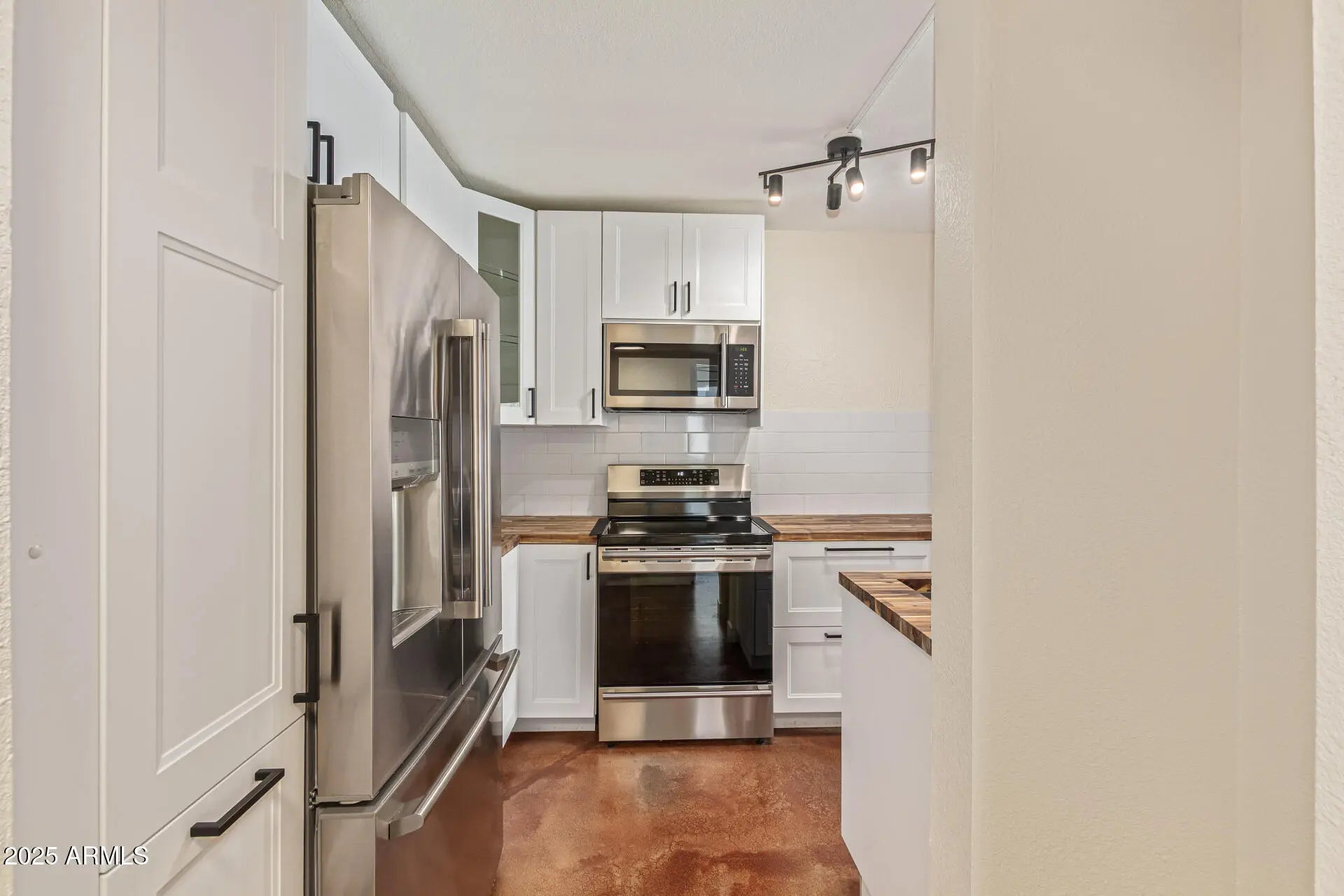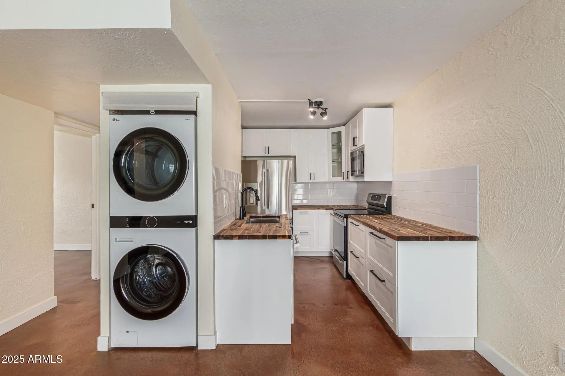Stacked Washer/Dryer, Dryer, Washer, Refrigerator, Built-in Microwave, Dishwasher, Disposal