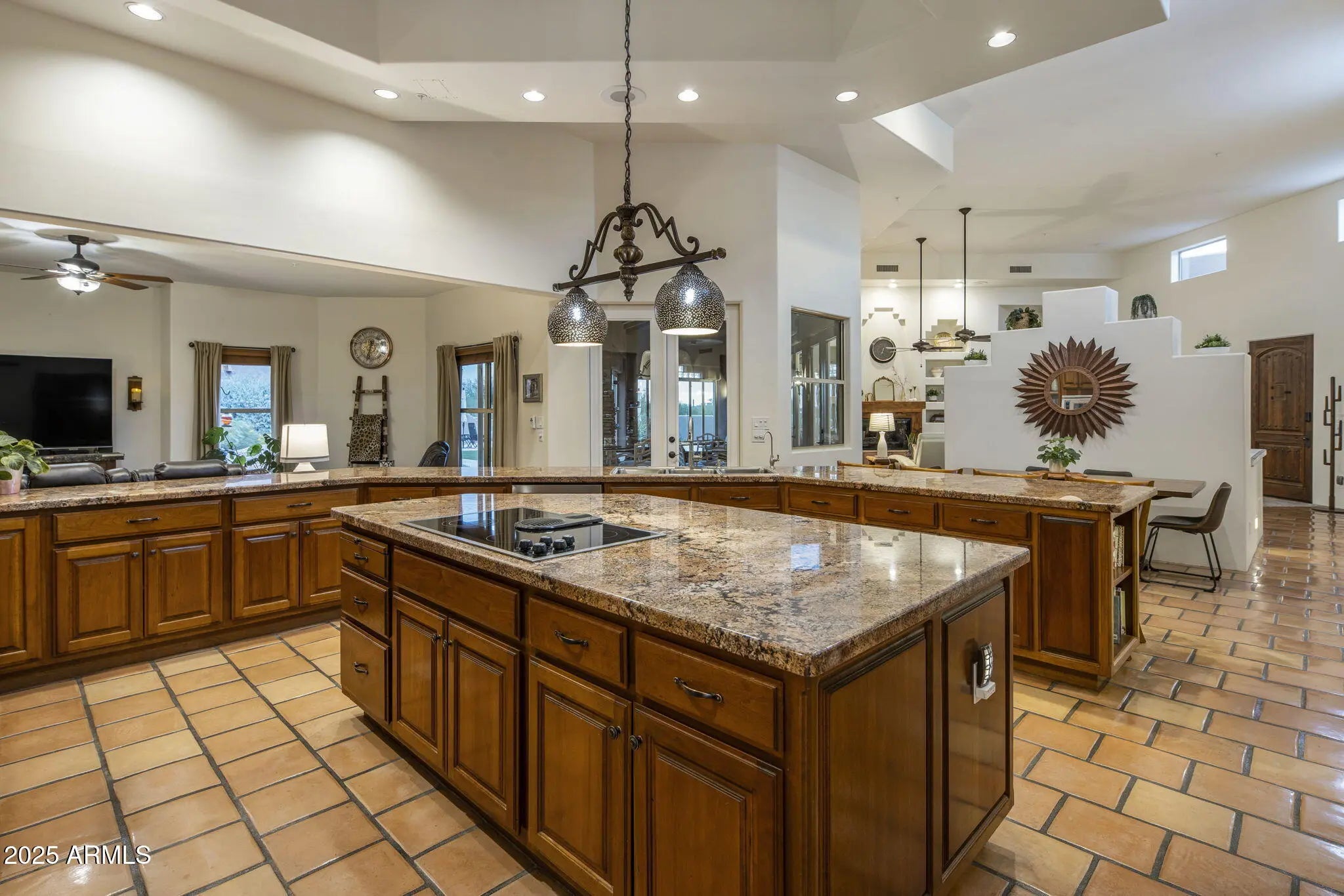 Territorial Residence in Guard-Gated Sincuidados...This timeless custom Southwest-style home is thoughtfully positioned among the natural rock outcroppings framing the property, creating a private desert sanctuary. A long driveway leads to the residence, with a guest parking area tucked beneath the canopy of a mesquite tree and a tranquil waterfall cascading through the boulders. Inside, abundant natural light flows from transom windows, skylights, and glass doors that open from the great room into the Arizona Sun Room. Custom cherry cabinetry provides exceptional storage throughout, especially in the spacious kitchen designed for both food prep and entertaining. The open floor plan is anchored by soaring ceilings, arched passageways, Saltillo tile, and a custom fireplace with built-in niches, blending authentic Santa Fe charm with modern comforts. The attached casita offers its own garage, living room, kitchenette, bedroom and 2 private patios, while a separate entertainment wing-accessible from the 4-car garage or a private exterior entrance-boasts a game room with pool/ping pong table, entertainment area, kitchenette, half bath, and a movie room. Step outside to a true North Scottsdale retreat: a resurfaced sparkling heated pool and spa, restored ramada with rooftop view deck and fireplace, and multiple patios framed by lush landscaping and desert views. Perfectly oriented, the property captures sweeping mountain vistas and unforgettable Arizona sunsets, enhanced by outdoor surround sound for evenings under the stars. As part of Sincuidados, residents enjoy 24-hour guard-gated security, clubhouse, tennis and pickleball courts, and miles of private hiking and biking trails. Conveniently located near upscale dining, shopping, and championship golf, this estate offers the best of desert living-authentic, updated, and unforgettable.