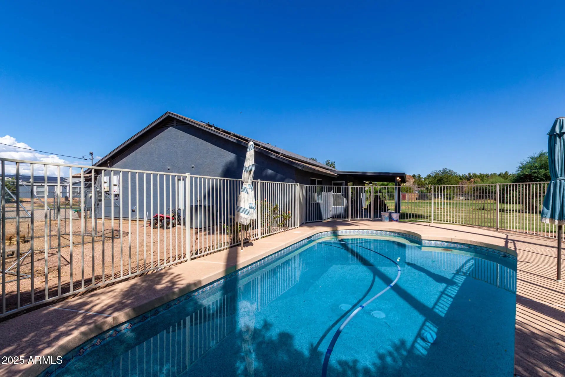Discover this beautifully maintained home in desirable Waddell! All the space you could need with 4 Large bedrooms, 2 bathrooms, and an optional office/ formal living area with vaulted ceilings as you enter through the front door. The home has a 2-car garage and is sitting on over 1-acre horse-friendly lot! NO HOA! Bring your animals and toys, there's plenty of room! Fenced in pasture with irrigation covering the whole property. The interior will charm you with soaring vaulted ceilings, tile flooring throughout (NO CARPET). The pristine kitchen features white cabinetry, NEW granite countertops, a large pantry, a new modern refrigerator, and LOTS of counter space. Large great room with vaulted ceilings Split floor plan, so primary bedroom truly feels like a private retreat. Outside you'll find a lush green backyard awaits you, with mature trees, a covered patio where you can enjoy peaceful evenings, and a sparkling pool to cool off on hot summer days! Only home on the street that is accessible from 175th. Last house on a dead-end road, so no through traffic. What are you waiting for? This is a must-see!