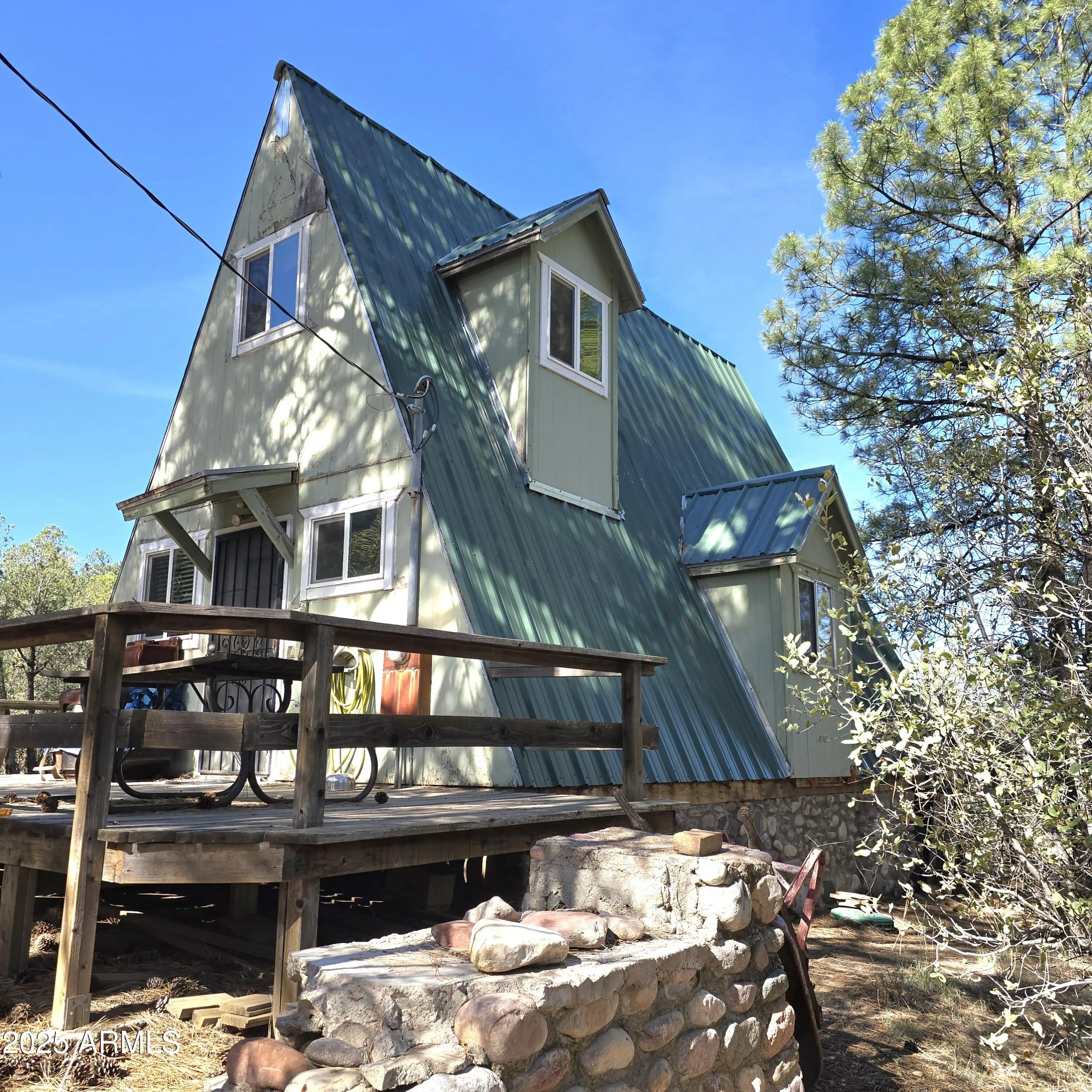 GORGEOUS 2-ACRE PARCEL with 900 feet of Forest Service boundary. Plenty of room to build a 2nd cabin or home! A-frame cabin still in family of the original owner; has sleeping loft with balcony for taking in sunsets. Enjoy your morning beverage on the back porch. Pellet stove to keep you toasty warm over winter holiday getaways or hunting outings. Wraparound deck has bench seating; picnic table included. Privately-owned well has no restrictions on volume of water owner can use. Detached storage shed with double door entrance is included, but not anchored to a permanent foundation. Recently surveyed with corner pins flagged. Walk or buggy ride out to trout-stocked, spring-fed Haigler Creek!! This area is popular with avid hunters.