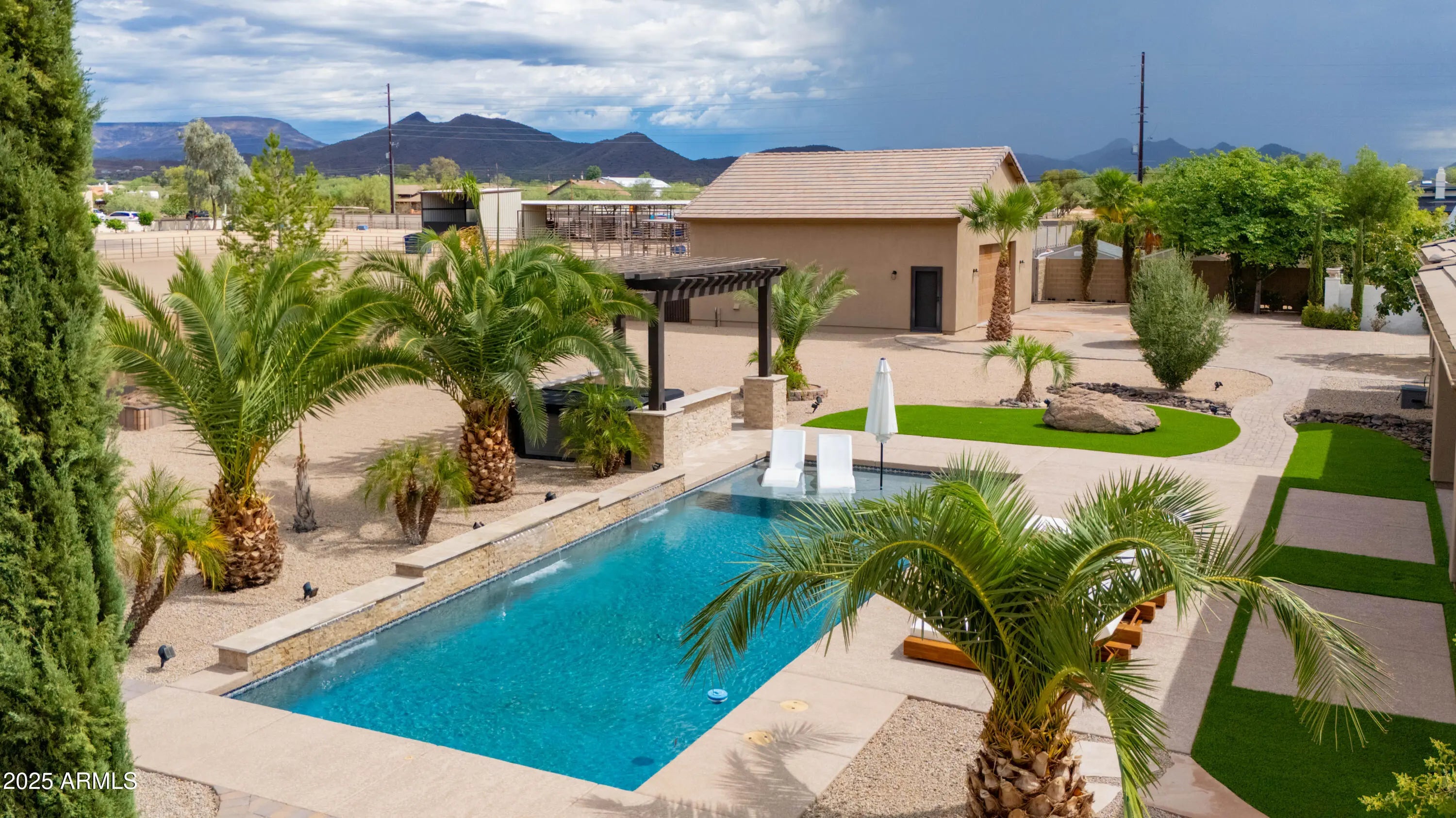 Luxury and freedom meet at this 2016 single-level estate on a full acre in Desert Hills.NO HOA,8-car parking,pool,RV access, and horse privileges. Set on a private paved road, this custom Ranch delivers serious space for toys with an attached 4-car garage plus a detrached 4-car shop. Double RV gates and long level drives make trailering effortless. A split guest wing offer (3) ensuite bedrooms: a flexible fifth bedroom/office adds options. The Primary suite flows to the patio and pebble-finish pool with covered BBQ bar. Corral, storage, workshop, endless potential. Minutes to I-17, TSMC corridor, and North Valley trails. NO HOA. Horses, RV's, and projects welcome.