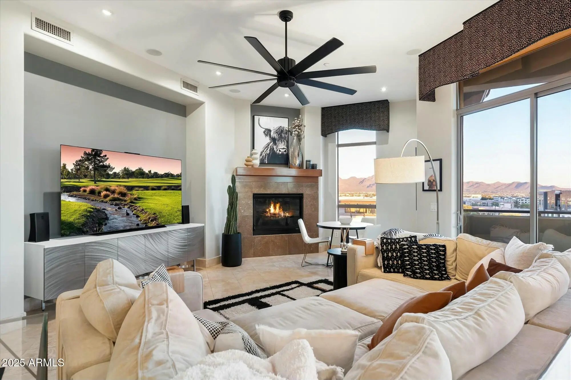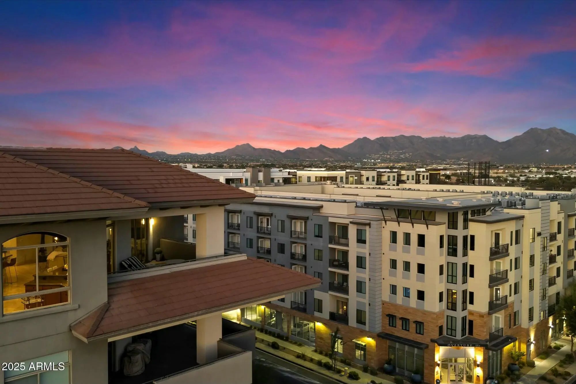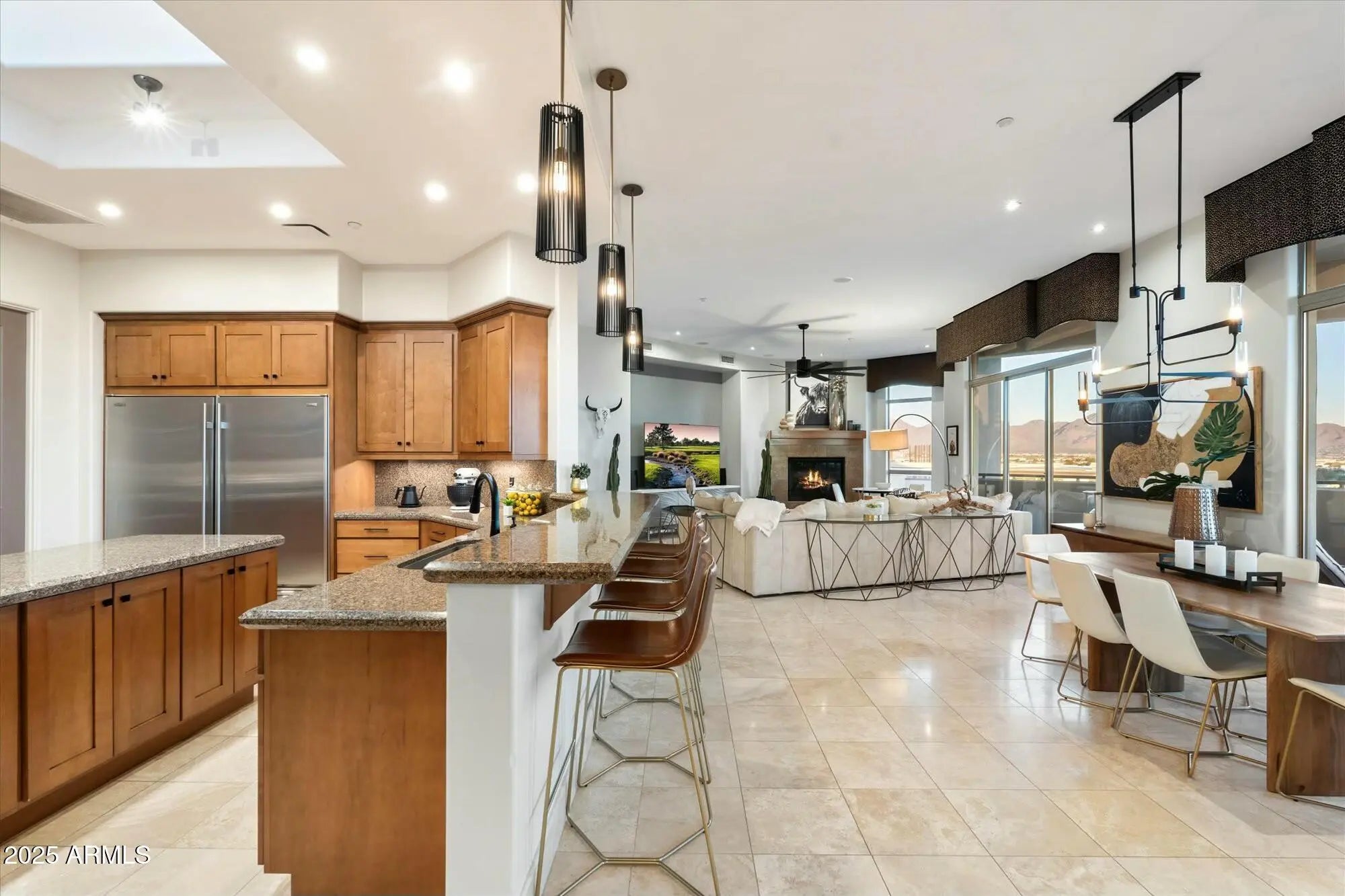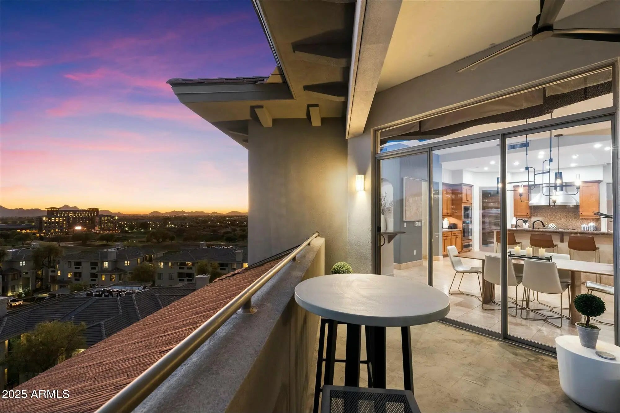 Experience luxury living at its finest in this 3 Bedroom, 2.5 bath, 3000+ SqFt Penthouse in 'The Landmark at Kierland'! This light-filled, open-concept home features breathtaking panoramic views, soaring 11' ceilings, skylights, stone floors, a gas fireplace, a spacious wet bar, and a massive private patio. Freshly painted and impeccably maintained, it's truly move-in ready! The open chef-inspired kitchen offers rich hardwood cabinetry, premium appliances, granite countertops, and a generous pantry. Retreat to the primary suite, where you'll wake up to stunning McDowell Mountain views. The spa-like primary bath features dual vanities, a walk-in shower, a soaking tub, and an enviable custom closet designed for ultimate organization. Rare Bonus: This penthouse includes