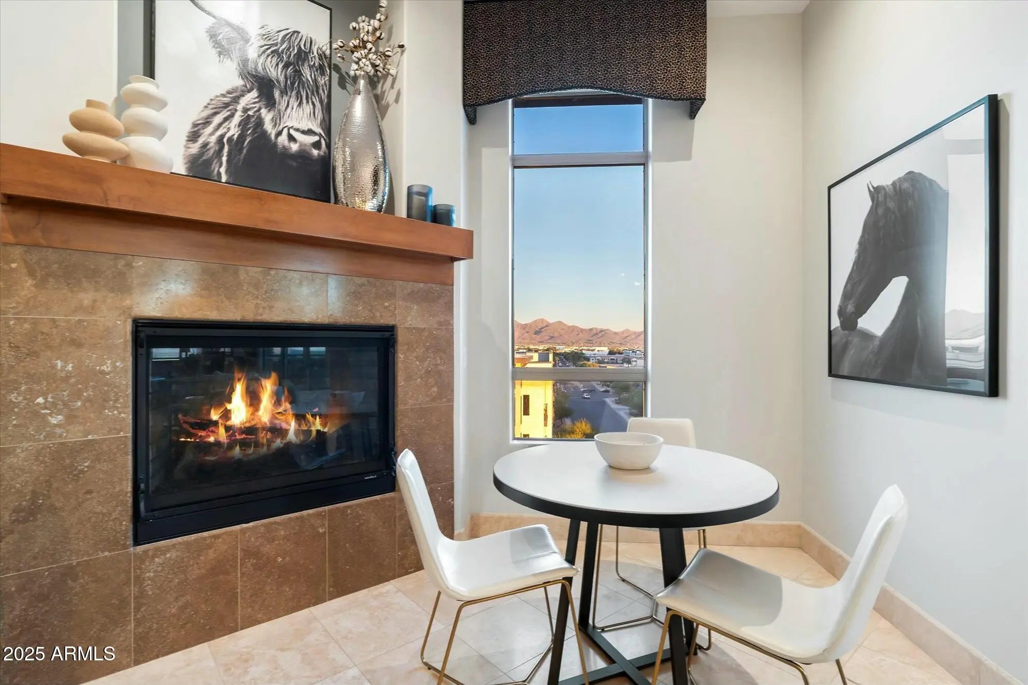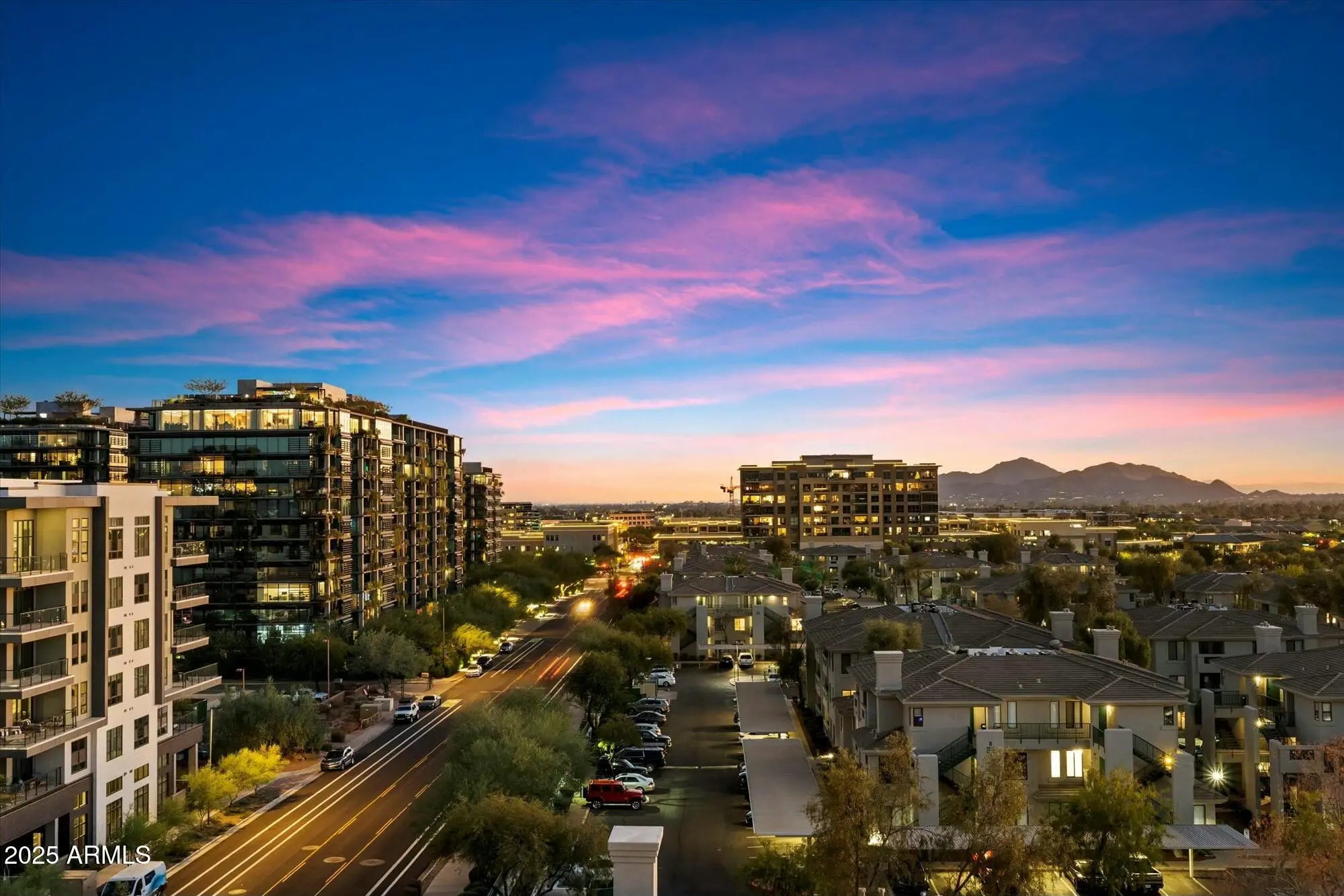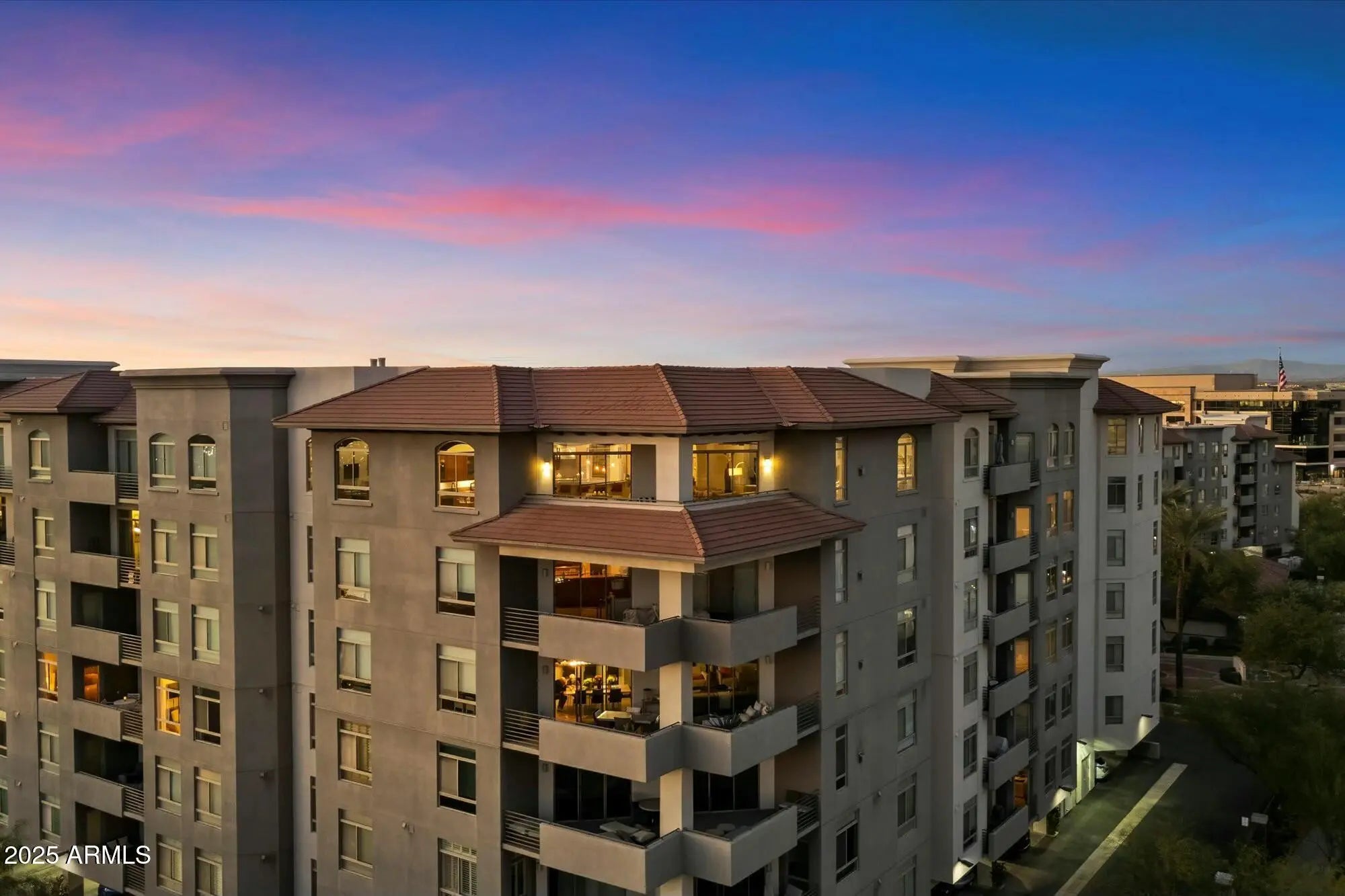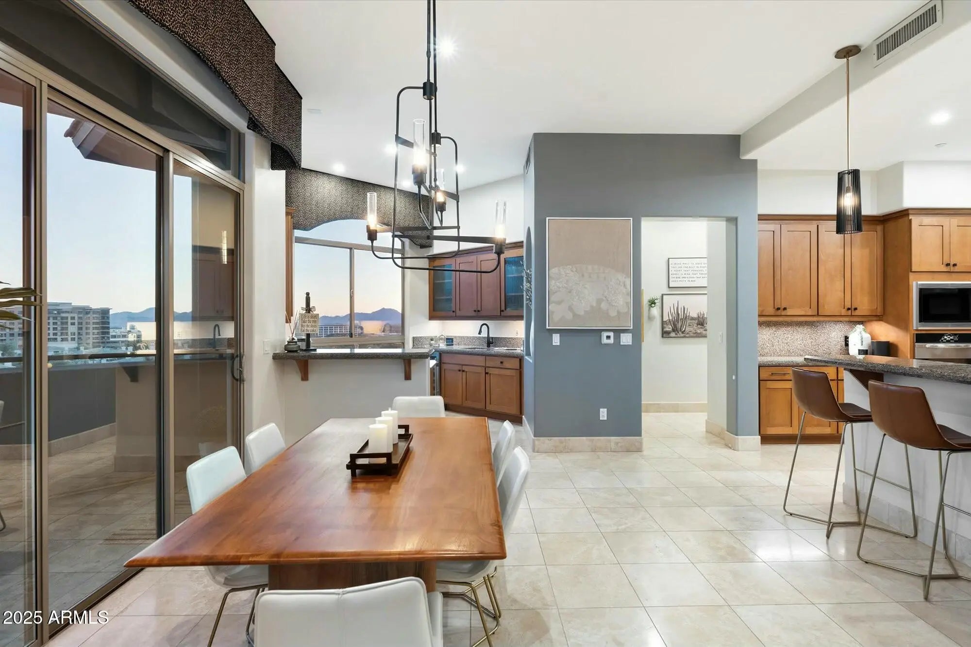 Experience luxury living at its finest in this 3 Bedroom, 2.5 bath, 3000+ SqFt Penthouse in 'The Landmark at Kierland'! This light-filled, open-concept home features breathtaking panoramic views, soaring 11' ceilings, skylights, stone floors, a gas fireplace, a spacious wet bar, and a massive private patio. Freshly painted and impeccably maintained, it's truly move-in ready! The open chef-inspired kitchen offers rich hardwood cabinetry, premium appliances, granite countertops, and a generous pantry. Retreat to the primary suite, where you'll wake up to stunning McDowell Mountain views. The spa-like primary bath features dual vanities, a walk-in shower, a soaking tub, and an enviable custom closet designed for ultimate organization. Rare Bonus: This penthouse includes