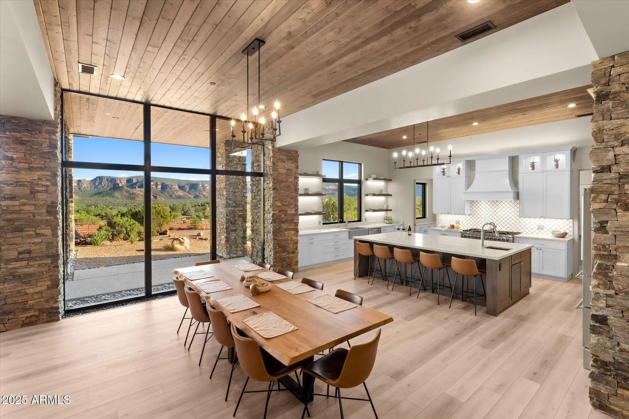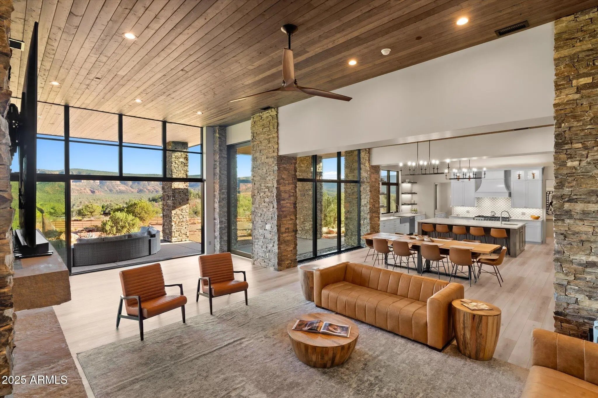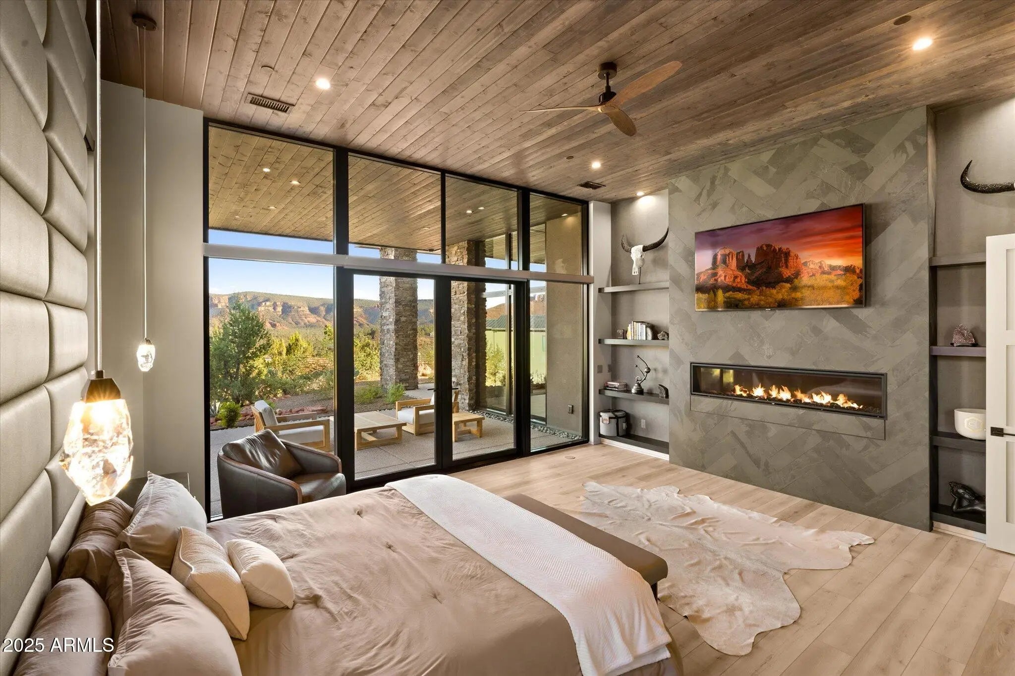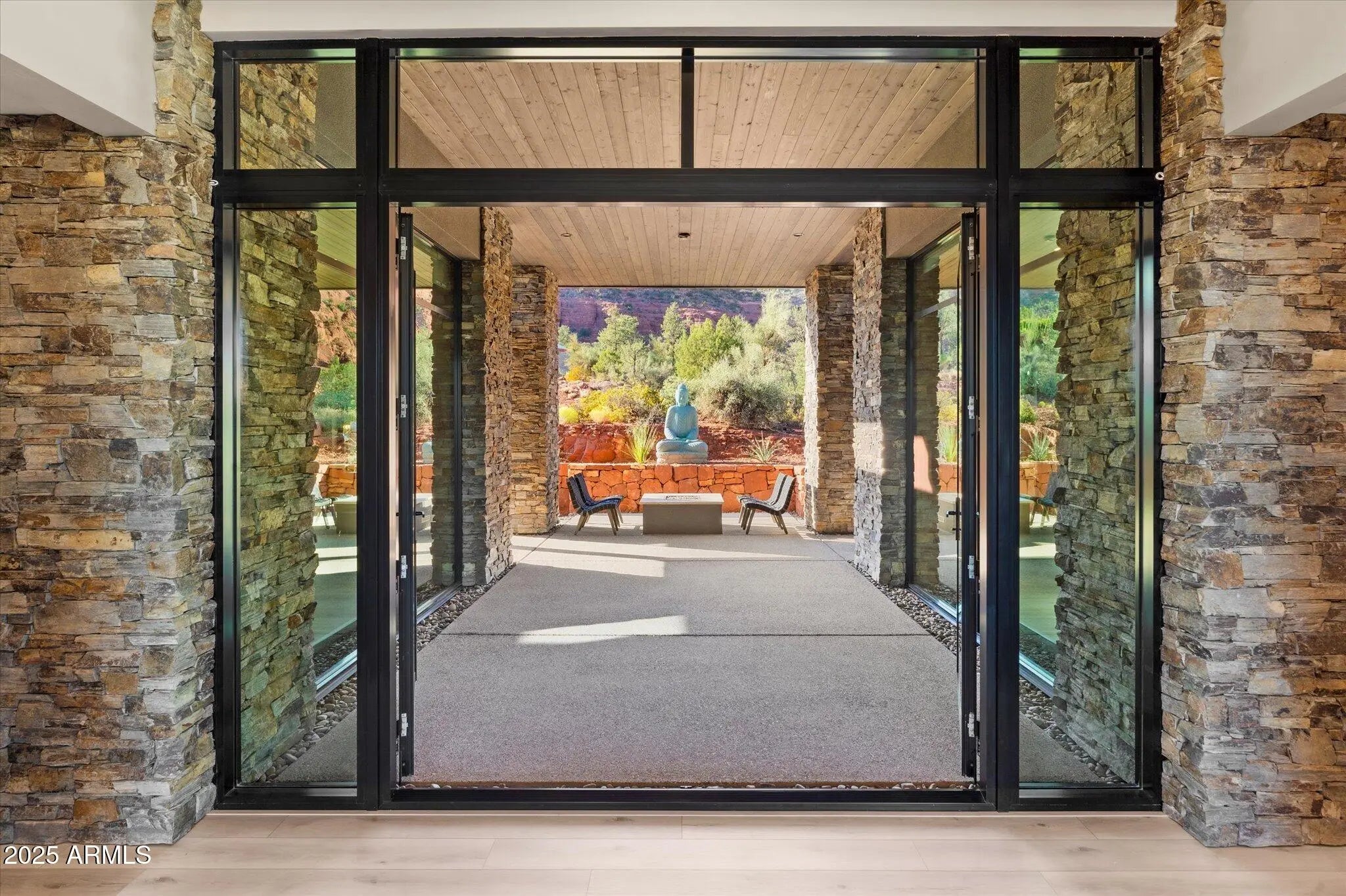 Experience the extraordinary—a NEW construction 4,446 sq. ft. estate on 1.76 acres with epic 360-degree views of Sedona's iconic Red Rocks, surrounded by National Forest land, and no HOA. Offered fully furnished - move right in or begin earning vacation rental revenue on Day One & ENJOY the peace of mind that comes with a NEW HOME! Welcome to 305 Sacred Eagle—a brilliant masterpiece of desert-modern architecture, tucked away on a private drive off Sedona's famed Red Rock Loop. Where floor-to-ceiling 14-foot walls of glass provide a seamless Sunrise-to-Starlight connection to Sedona's awe-inspiring vistas. Where the best open-concept design trends are perfectly executed. Where bespoke finishes exude sophistication, and curated details envelop you in quiet luxury. Every aspect of this estate has been thoughtfully planned & flawlessly executed to provide the ultimate, exclusive Sedona retreat. Walk through the 12-foot-tall pivot glass entry door and into the flow of outstanding modern design. Relax in the gorgeous great room featuring a stacked stone gas fireplace, 85-inch 4K TV, and multi-slide glass walls that merge indoor luxury with outdoor beauty. Create lifelong memories around the 10-foot dining table with abundant entertaining space and sweeping red-rock views. Experience the ultimate kitchen flexa space that can accommodate large groups while maintaining an efficient work triangle for seamless meal prep. Bonus points for the separate pantry, computer nook with TWO custom desk spaces, and extraordinary 10' × 6' superslab honed quartz island! The grand hallway stretches more than 70 feet as you walk past dramatic stacked stone columns and illuminated art niches on the way to four luxurious bedrooms and a spacious media/game room. EVERY bedroom features bedside crystal pendant lighting, an integrated, custom headboard, and a spacious walk-in closet with built-in cabinetry that includes drawers and separate hamper space. All three full bathrooms feature a private water closet, quartz counters, wall-mounted faucets, LED backlit mirrors and a glass-enclosed walk-in shower with dramatic porcelain-tiled walls and pebbled shower floors. An additional half-bath features a live-edge Juniper countertop and custom stone sink bowl. The Primary Suite is a retreat unto itself. Spend cozy evenings enjoying the 72-inch gas fireplace flanked by artful floating shelves. Catch your favorite show on the 4K LED TV above. Gaze out through 12-foot-high walls of glass and walk through double French doors onto the Primary Suite's covered patiothe perfect spot to experience Sedona's BEST sunrises. The primary ensuite combines spa-like tranquility with impeccable functionality. Unwind in the pebble-surrounded freestanding tub while soaking in red rock views through floor-to-ceiling windows. The walk-in shower boasts the same stunning views and an additional separate door to your own private OUTDOOR shower experience. Every detail has been carefully curated to enhance your daily rituals. You'll find an abundance of counter space, dual vanities, a dedicated, illuminated seated make-up table, and TWO separate walk-in custom closets. This primary ensuite sets the standard for luxury and livability. Outside, a nature lover's paradise awaits. Enjoy morning coffee on the Grand Patio with its comfortable seating area. Take off in multiple directions for endless hiking on National Forest trails, including several of Sedona's stellar standouts. Ascend the striking Cimarron Butte, where you can capture epic views of majestic Cathedral Rock, the heartbeat of Sedona. Close your exercise ring on the perfect morning loop around Pyramid Trail. Back home, stroll the meticulously landscaped grounds, where every element has been crafted to inspire tranquility and balance. Experience pure magic from your front yard as the red rocks glow in sunset light and a meditative Medicine Wheel awaits, its four cardinal directions outlined by carefully placed stones. Find your center in this tranquil space, designed for self-reflection and inner harmony. Gather fireside under the back lanai while the outdoor chef prepares dinner nearby on the built-in Napoleon gas grill. The energetic centerpiece of this special property is the dynamic outdoor bronze sculpture "I am Sacred Eagle" by acclaimed artist John Benedict. A sacred symbol in many Native American traditions, the eagle is revered for its strength, courage, wisdom, and freedom. Come experience this and more at this extraordinary property. Additional features of note include: - Sold fully furnished with all indoor and outdoor furniture, decor, artwork, televisions, sound systems, gaming tables and equipment, bedding, linens, pillows, kitchenware, tableware, and more - 4' x 12' Glass and Steel Pivot Door for Front Entry - Tongue and Groove wood ceilings in Great Room, Dining Room, Primary Bedroom, Outdoor Grand Patio, Owner's Suite Patio, Rear Promenade Patio and Fireside Patio - Natural stone columns interior and exterior - Whole house water softening system - Reverse osmosis drinking water filtration - Fire suppression system with onsite water storage tank - Two-car garage with lock-off for one car spot and epoxy flooring in both garages - Two Primary walk-in closets, one closet can be locked for owner's storage - Two walk-in closets, with one lock-off in additional guest room - Motorized blinds in Primary Bedroom - Large capacity LG Smart Washer and Dryer (electric) - Separate plumbing for gas at dryer location - Dark sky compliant outdoor lighting package
