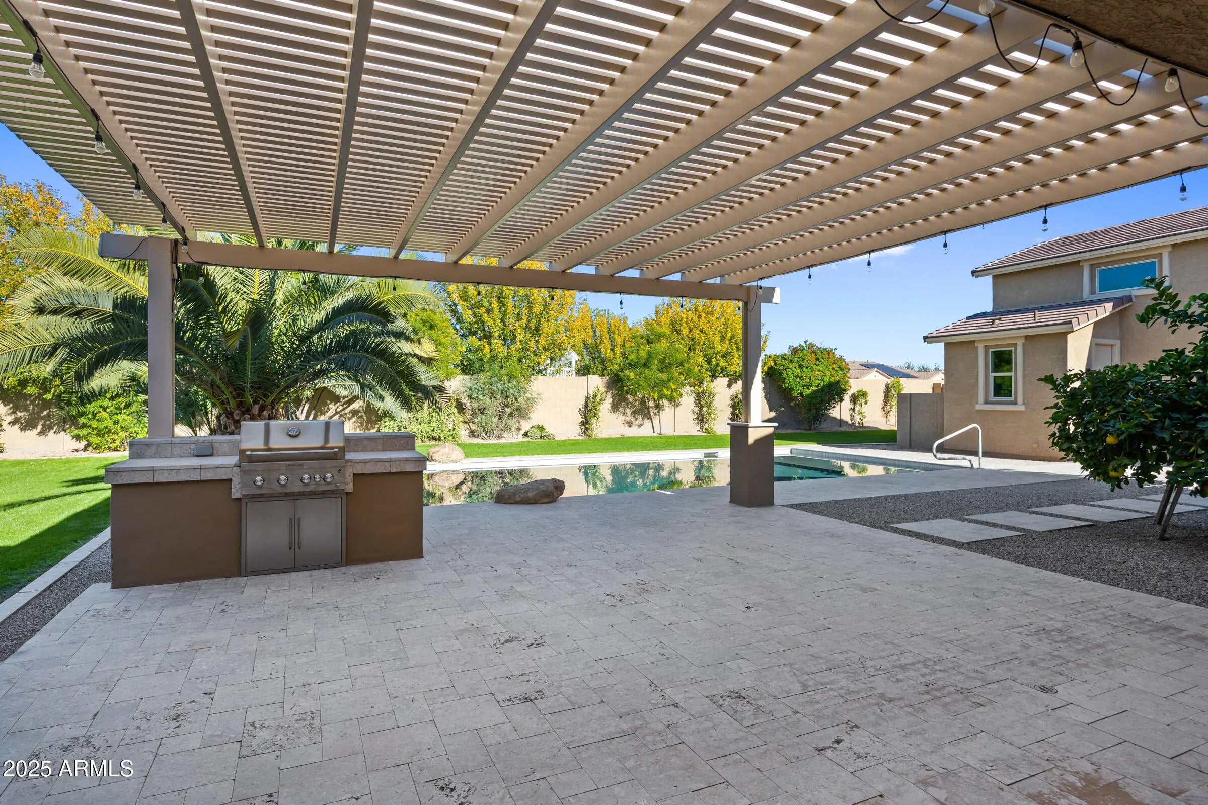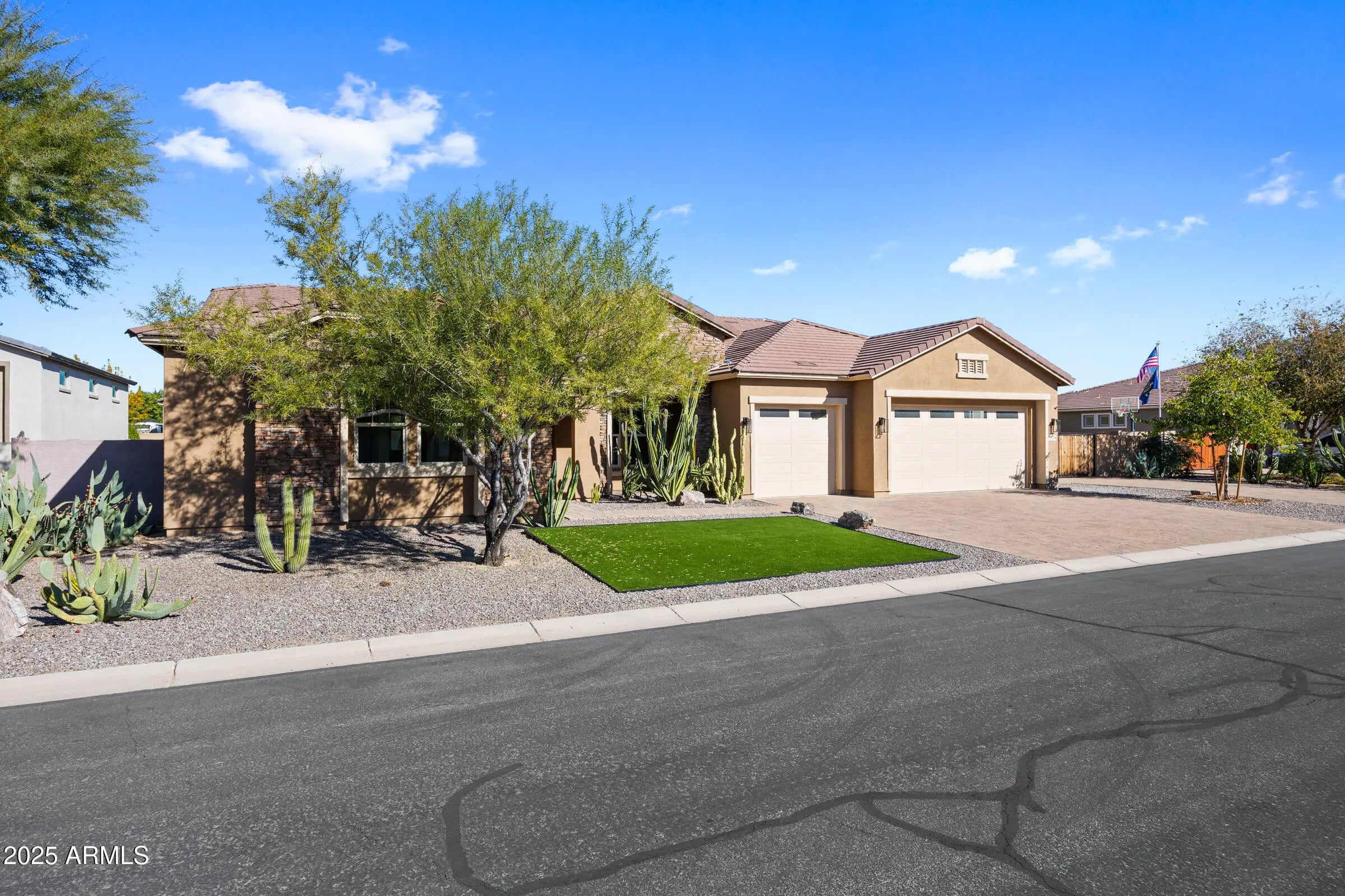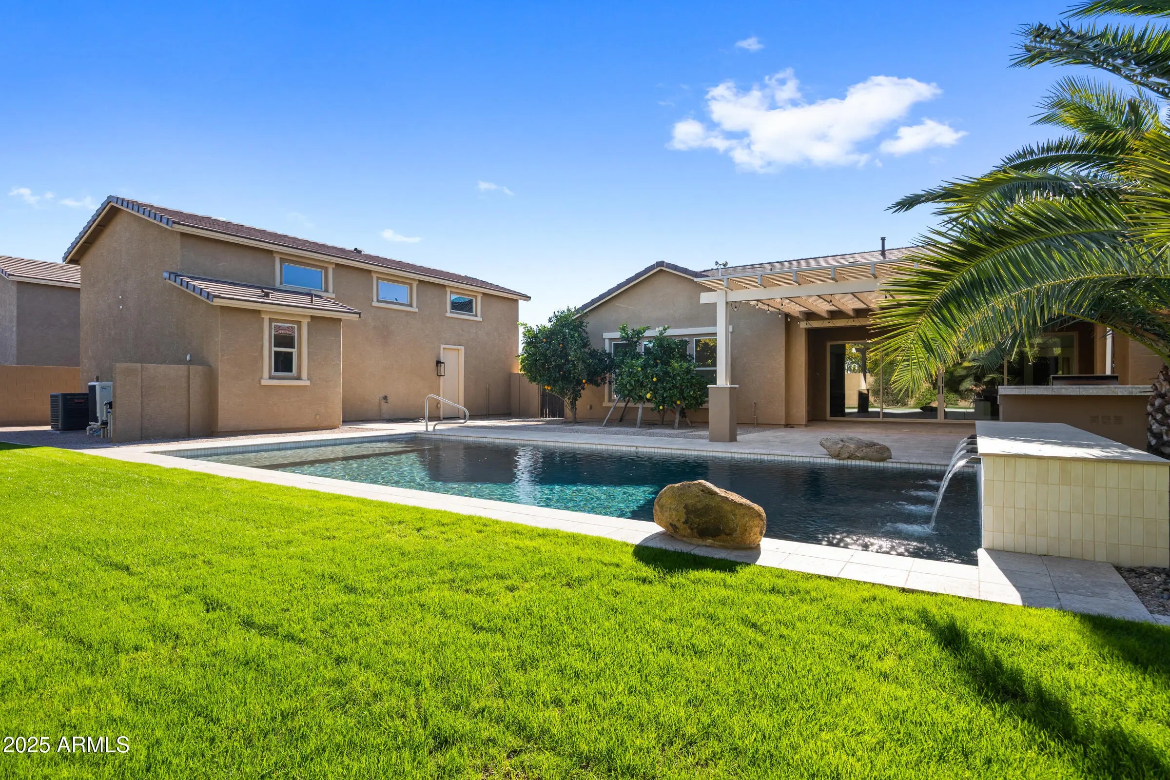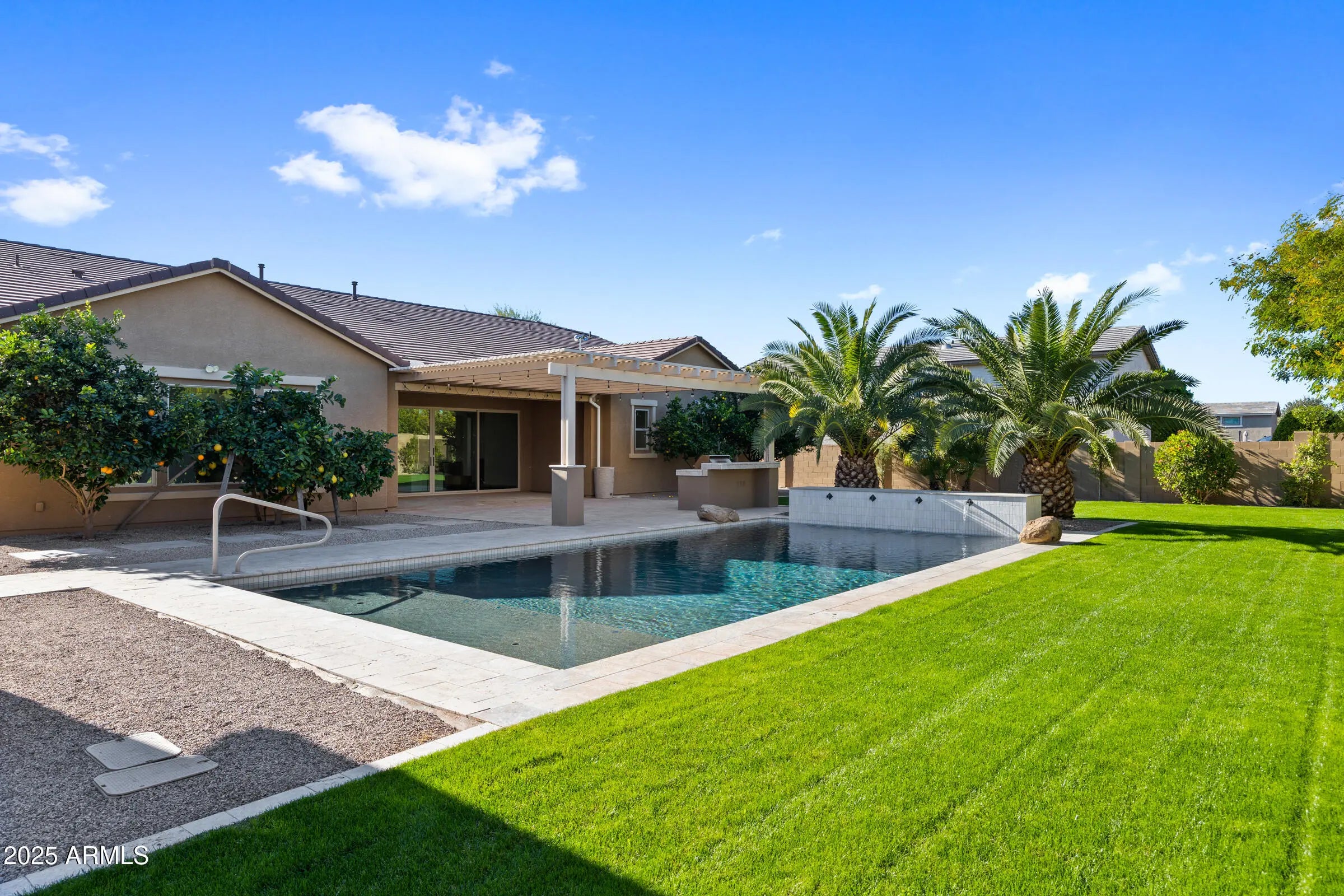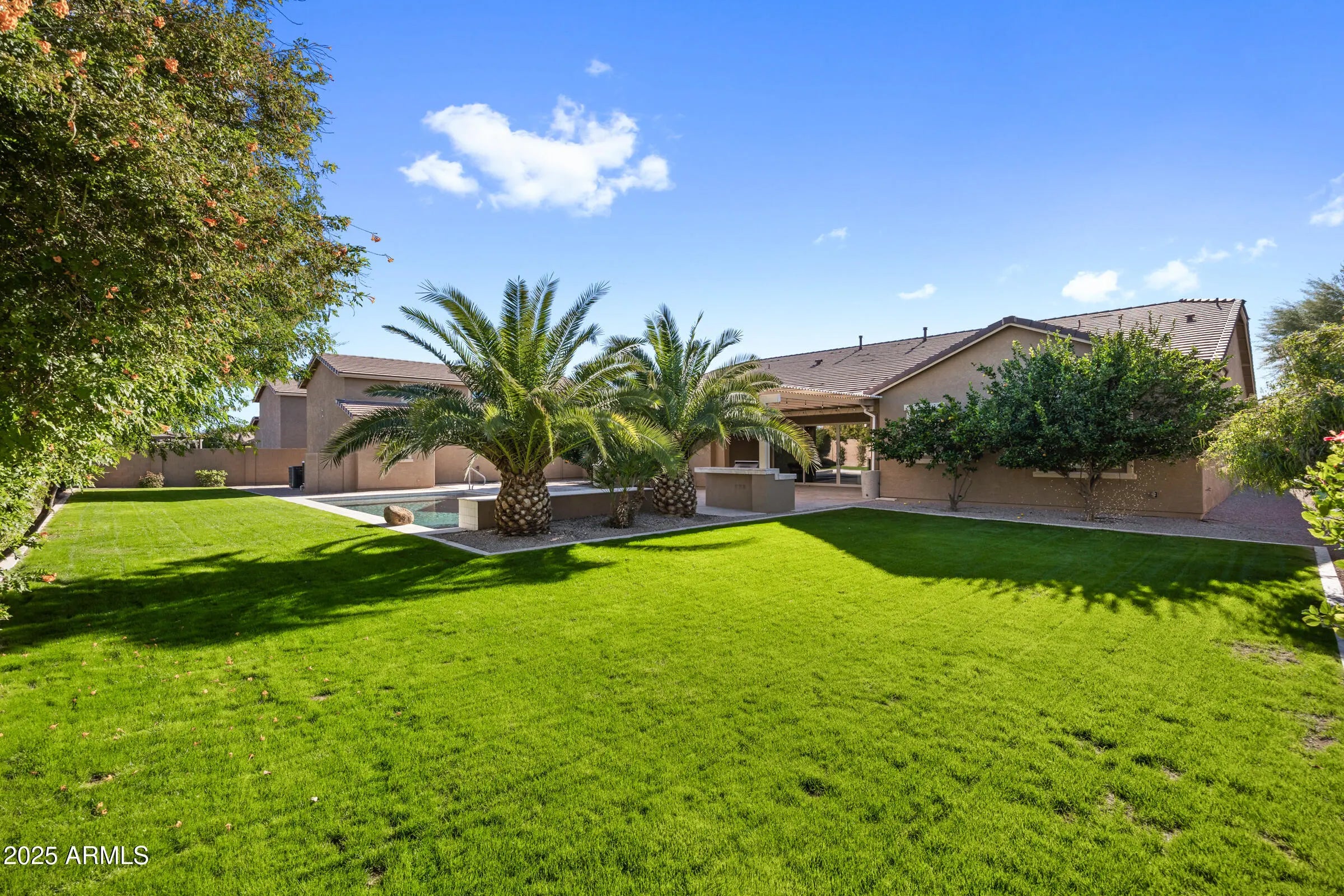 Welcome to 19778 E Poplar Dr, a newly remodeled luxury estate in the prestigious La Jara Farms community of Queen Creek. Situated on a 19,273 square foot lot, this 4,002 square foot home offers 5 bedrooms, 5.5 bathrooms, office, an attached casita with private entrance, an RV garage with a full bathroom, RV gate, and a 3-car garage designed to combine versatility, comfort, and elegance. Inside, the home showcases European white oak wide plank hardwood flooring, Taj Mahal quartzite countertops, imported stone pendant lighting, and brass cabinet hardware that elevate every detail. The chef's kitchen is the heart of the home, featuring new designer series appliances, champagne bronze plumbing packages, and a massive island perfect for entertaining. The primary suite offers a spa-inspired retreat with a massive shower, a freestanding fluted soaking tub, and dual vanities. Secondary bedrooms are finished with new loop carpet and upgraded padding, adding warmth and comfort. The attached casita provides a private living option ideal for guests or multigenerational living. The backyard is a true oasis with a sparkling pool and water features, lush lawn, and a covered patio complete with a built-in BBQ, perfect for Arizona's indoor-outdoor lifestyle. With its prime location in La Jara Farms, this property blends neighborhood charm with estate level privacy, all while being just minutes from top-rated schools, shopping, and dining.