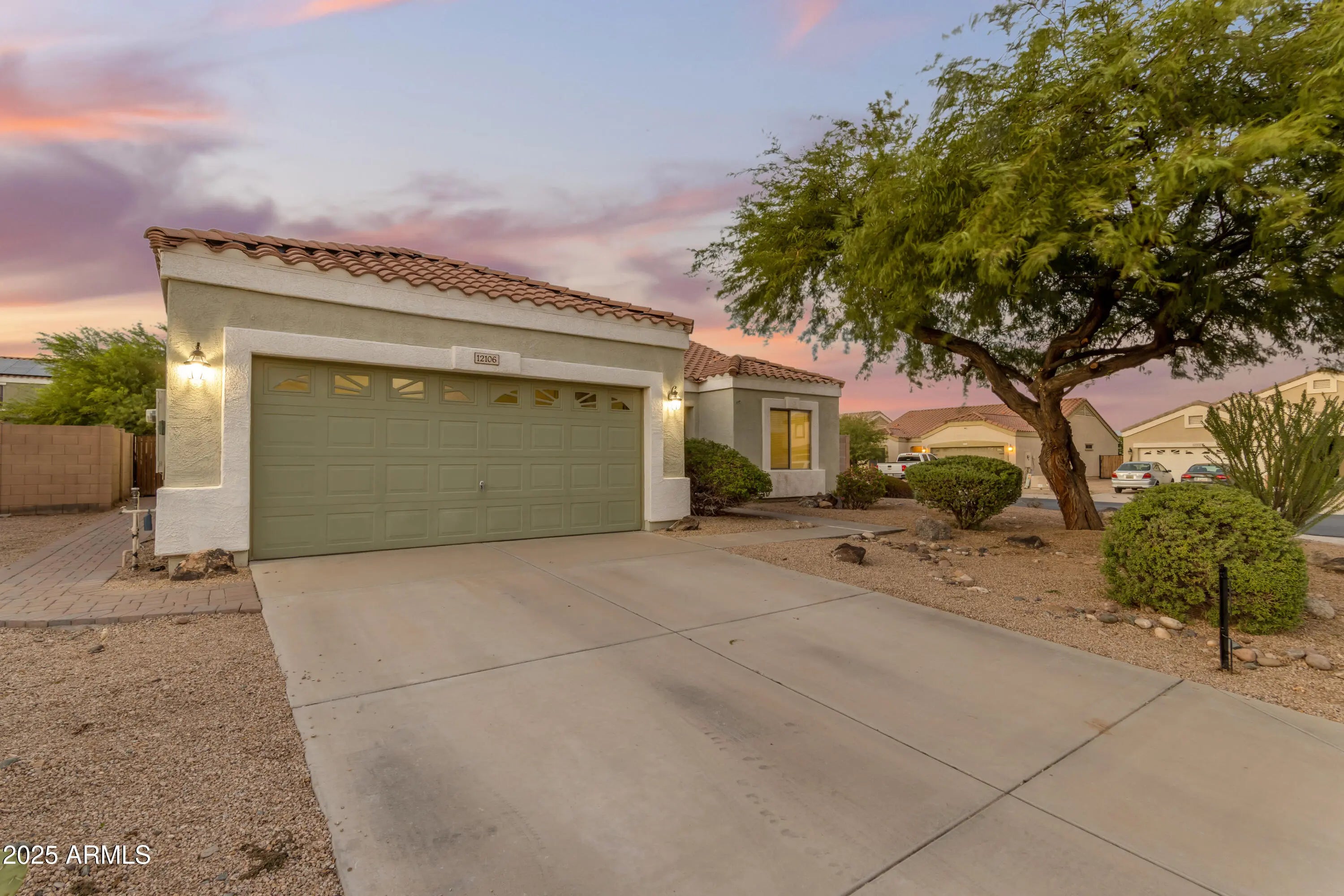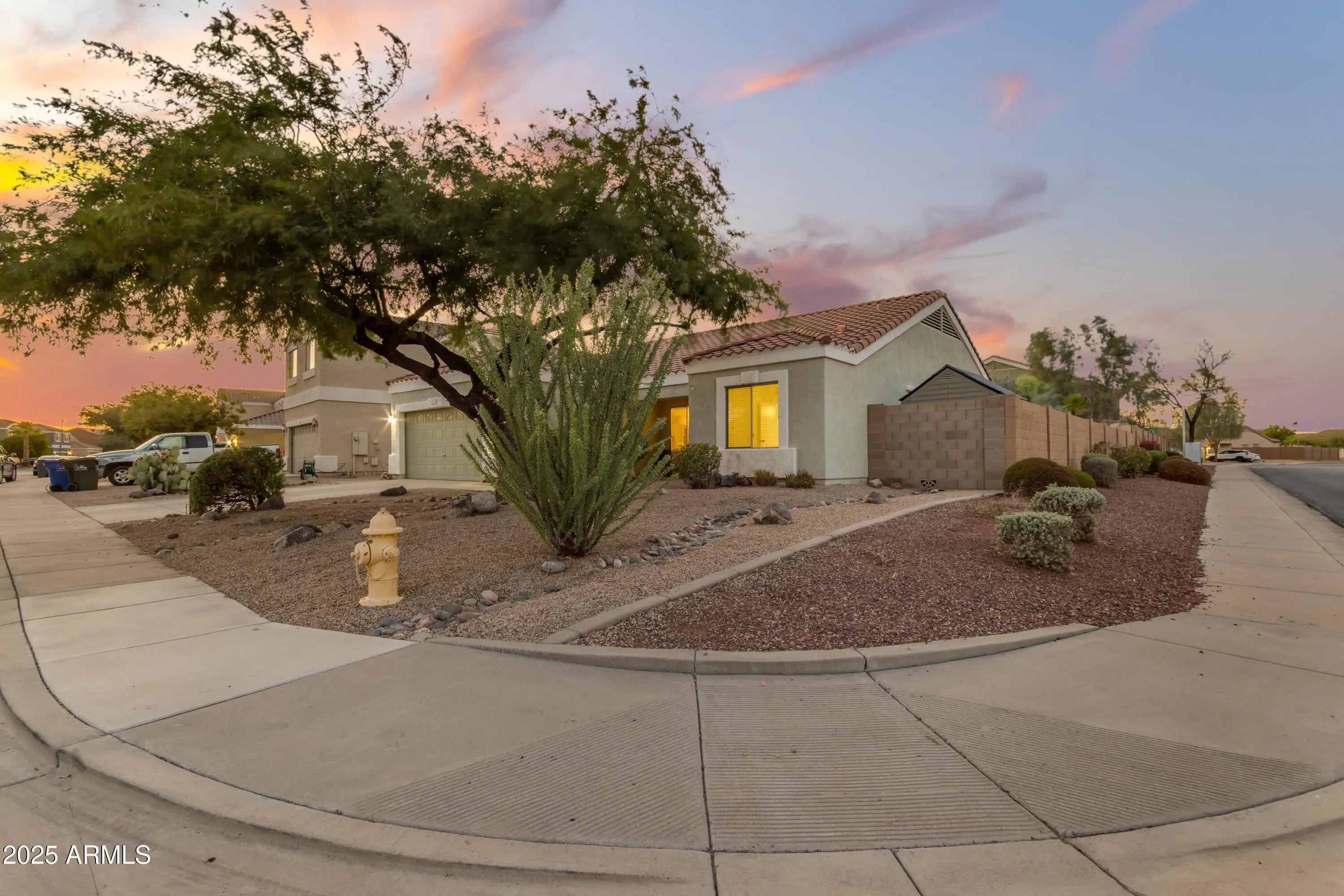Beautiful Santa Barbara/Tuscan-style home on a corner lot with desirable north/south exposure. This residence offers 2-car garage plus additional slab parking. Interior highlights include 9+ flat ceilings, no interior steps, solar screens, and an owned water softener. The open kitchen features range/oven, built-in microwave, refrigerator, pantry, and walk-in pantry. Split master suite offers a walk-in closet, dual vanities, separate tub/shower, and private toilet room. Relax in your private play pool or on the covered patio overlooking a backyard with grass, desert landscaping, mature Orange & Lemon Trees and auto-timed irrigation. Additional features include block fencing, central air, ceiling fans, and tile roof. Conveniently located near shopping, dining, and freeways. GREAT DEAL! best Price PPSQFT in 85335 with a pool = instant equity!