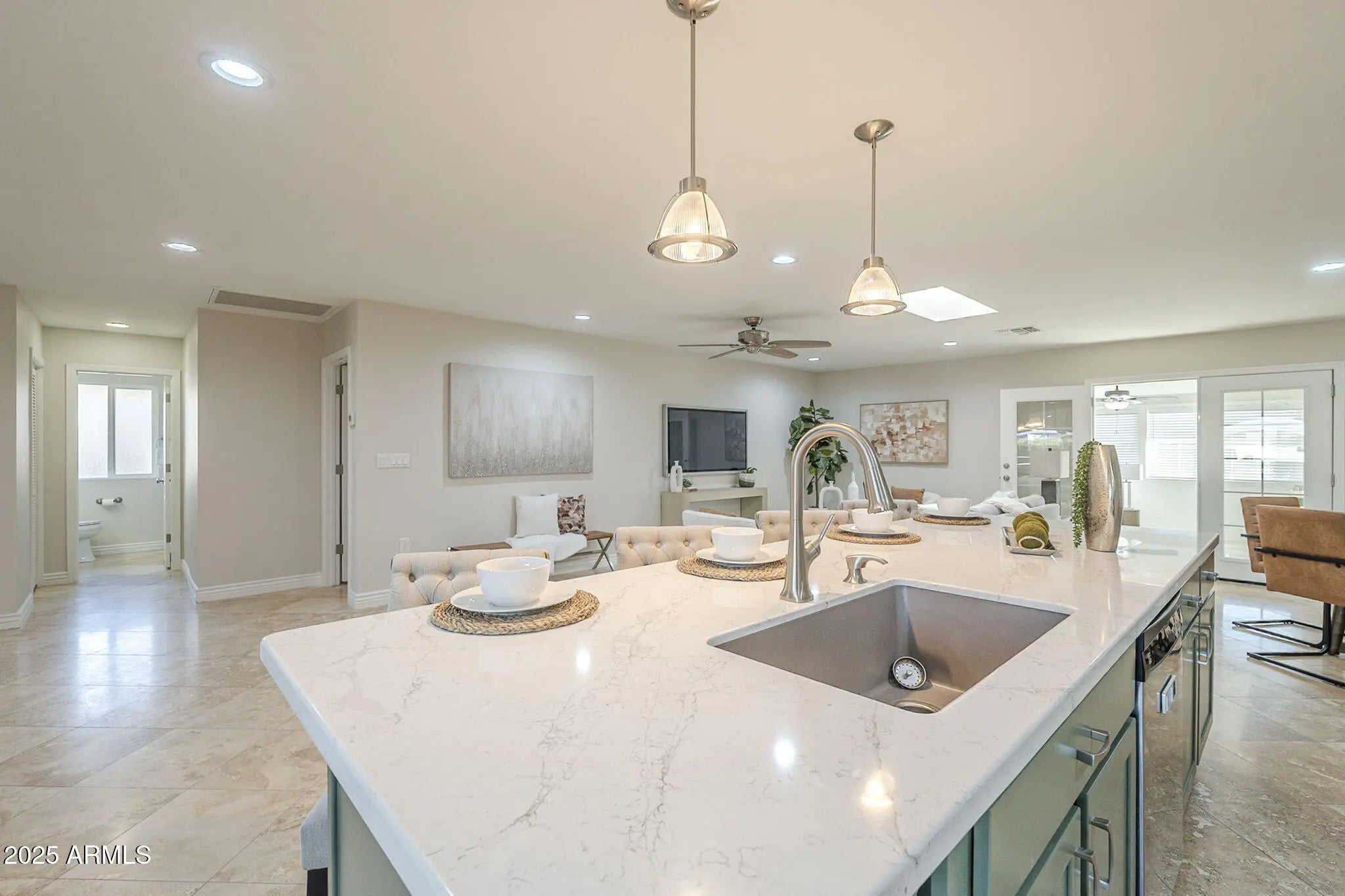 This three-bedroom, two-bathroom home offers approximately 1,909 square feet of living space. The property features polished travertine flooring throughout, creating a sophisticated and elegant atmosphere. The spacious floorplan boasts an open concept design, ideal for entertaining guests and everyday living. The home's newly remodeled kitchen is a true standout, with stainless steel appliances and ample counter space for the most discerning chef. The large, enclosed backyard provides a private and tranquil outing, perfect for relaxation or outdoor activities. The primary bedroom is a serene retreat, offering a peaceful space with attached bath. The additional two bedrooms and den/office provide versatile options for accommodating guests or creating a dedicated workspace. Solar owned.