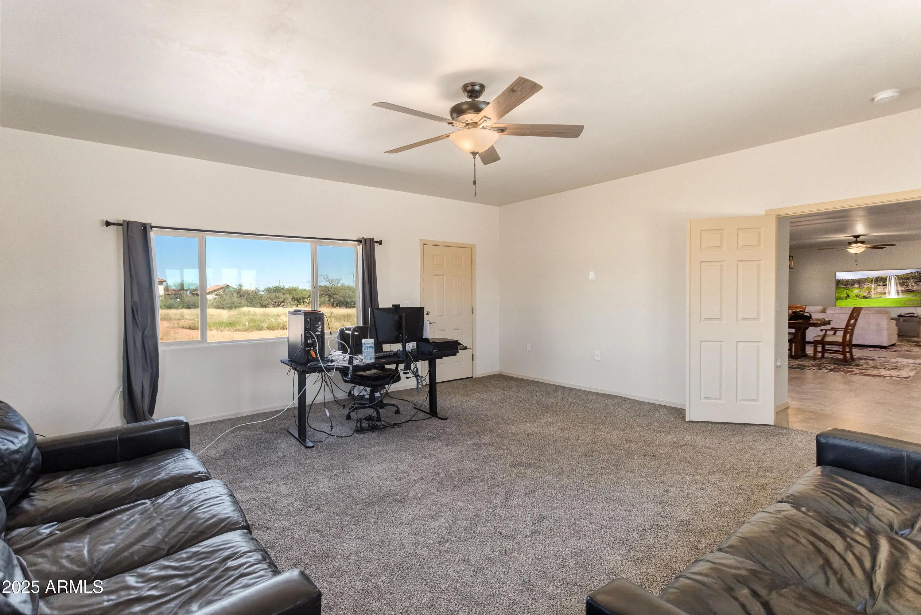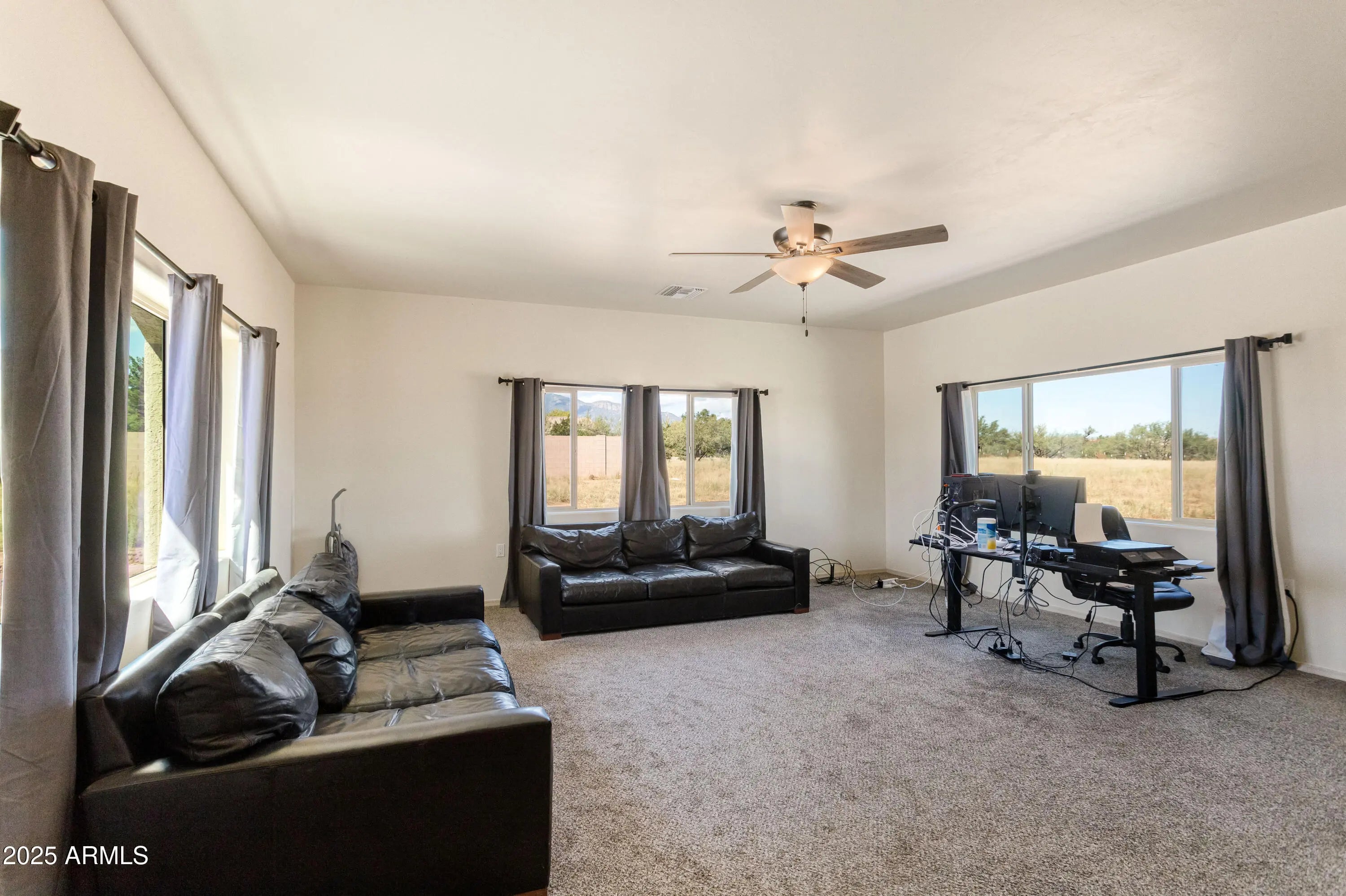 Gorgeous custom built sitting on over 3 acres with amazing views that you can enjoy on a huge patio. Step inside the 3 bedroom and 2 bathroom home with the open concept living, dining and kitchen space. Bonus with a separate GREAT ROOM and furnished! Tile floors throughout the living areas and carpet in the bedrooms. Spacious laundry room inside. 3 garage space allows for all the covered and protected parking and storage you need.