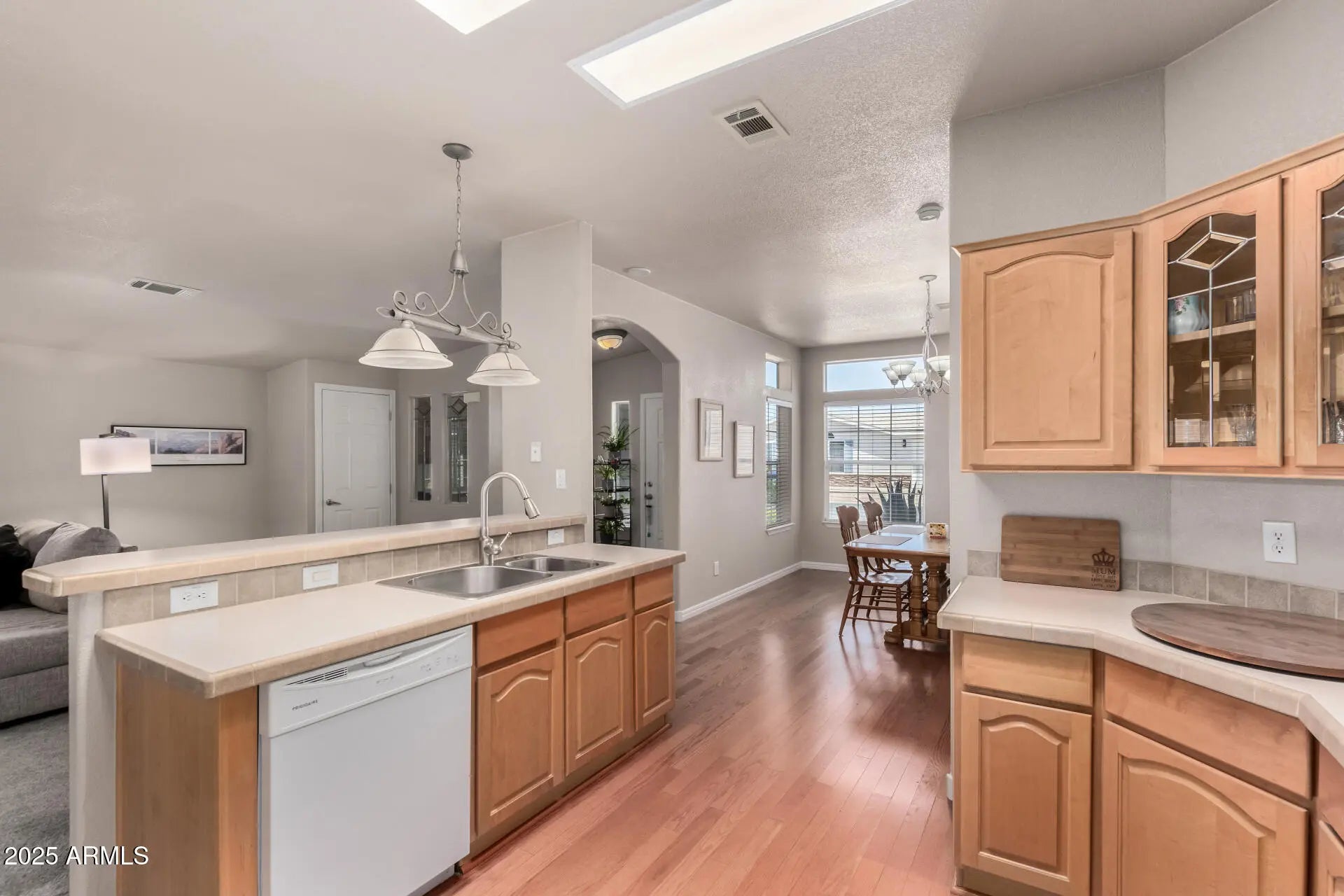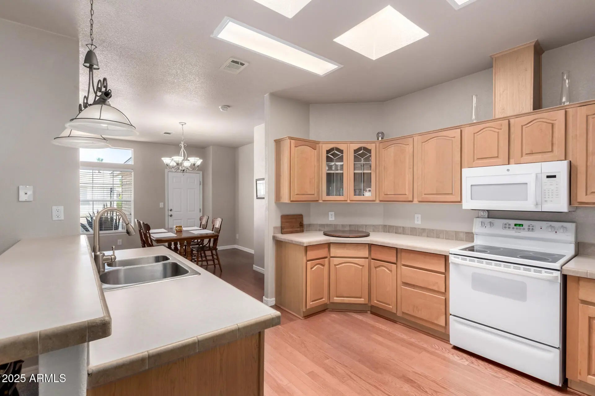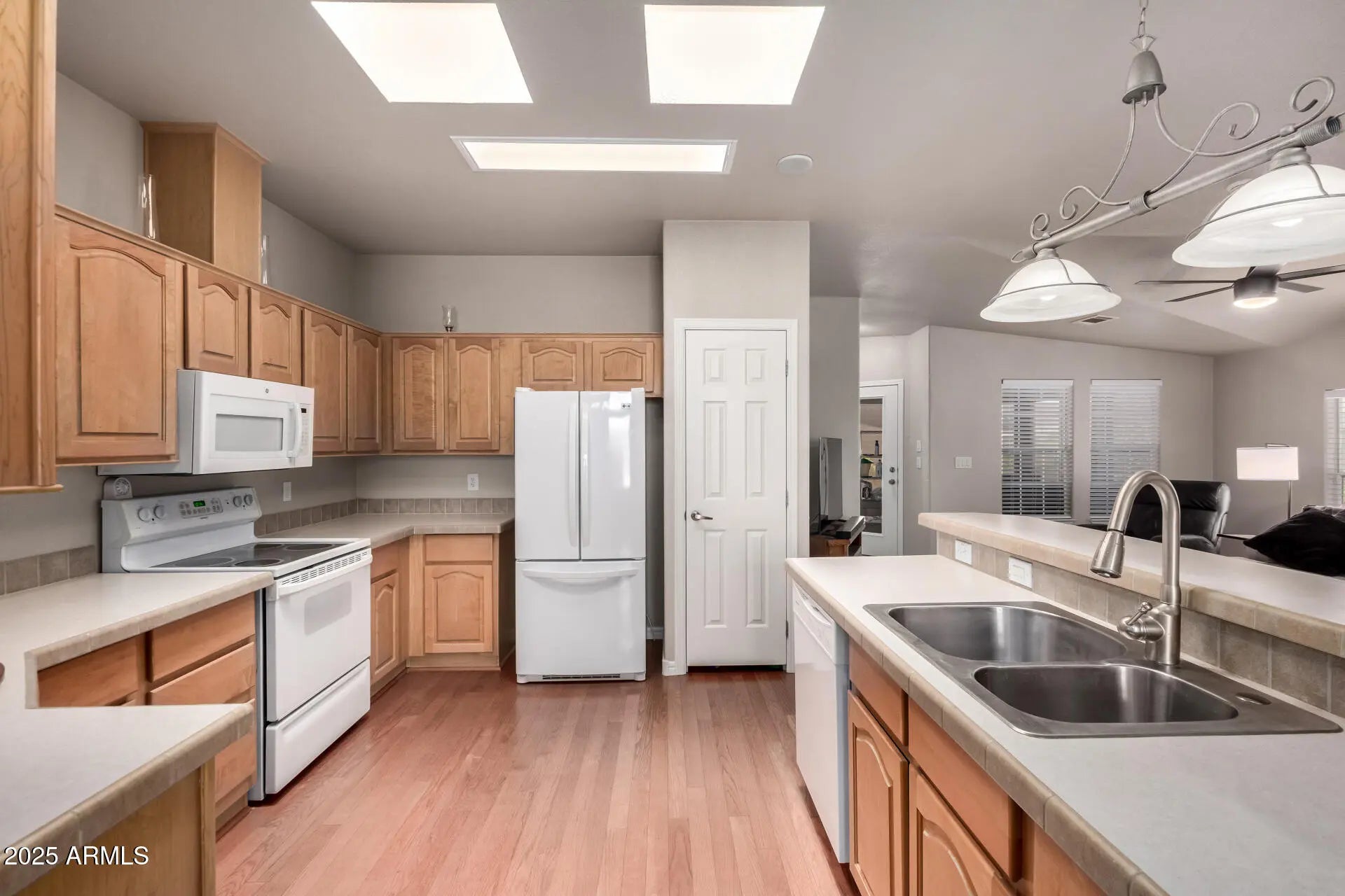 Beautiful move-in ready 2 bed, 2 bath + office in a vibrant community! This open concept home features a spacious family room with natural light, formal dining, and a large kitchen with dual skylights. The huge primary suite offers dual vanities and walk-in closet. Fresh paint, new carpet, and wood blinds throughout. Best of all, the extended 2-car garage fits a large truck--a rare find! Enjoy a cozy Arizona room, brand-new washer/dryer, and bonus golf cart with the right offer. Conveniently located near the clubhouse and front entrance.