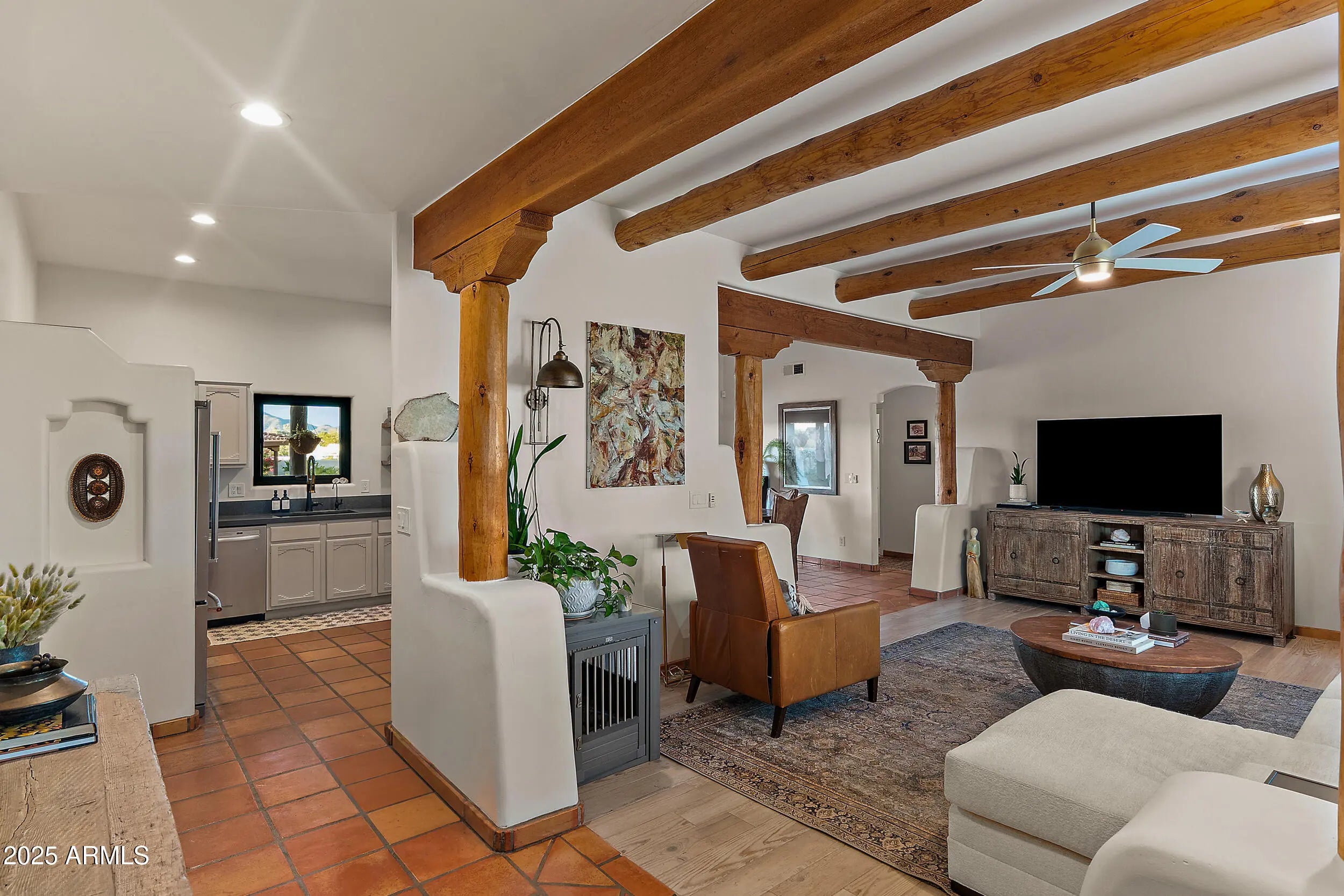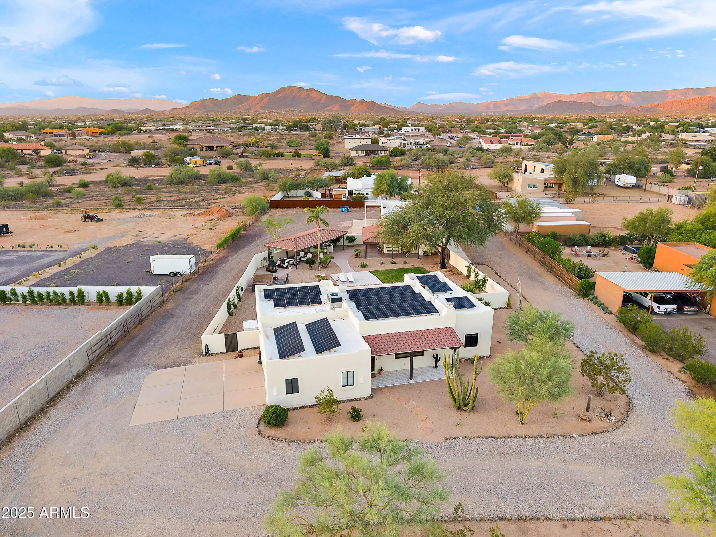 Welcome to your Southwestern adobe oasis! This stunning 3 bed, 2 bath updated home features authentic vigas & Kiva fireplace. Main home is 1818 sqft & guest home is 1000 sqft. On a private 1.17 acre lot, this home offers an RV carport w/hookups, & a large 4 car shop —perfect for all your storage or workshop needs. The spacious guest house includes separate living room, bedroom, 3/4 bath & interior laundry—ideal for family, guests or extra income. Step outside onto the large covered patio & enjoy your saltwater pool with new sparkling PebbleSheen finish & equipment, as well as a large 20x60 covered pavilion with sink, BBQ & ample space for all your outdoor entertainment needs. New solar-new AC units.This home truly has it all. Come see it and fall in love! Seller is a licensed AZ agent