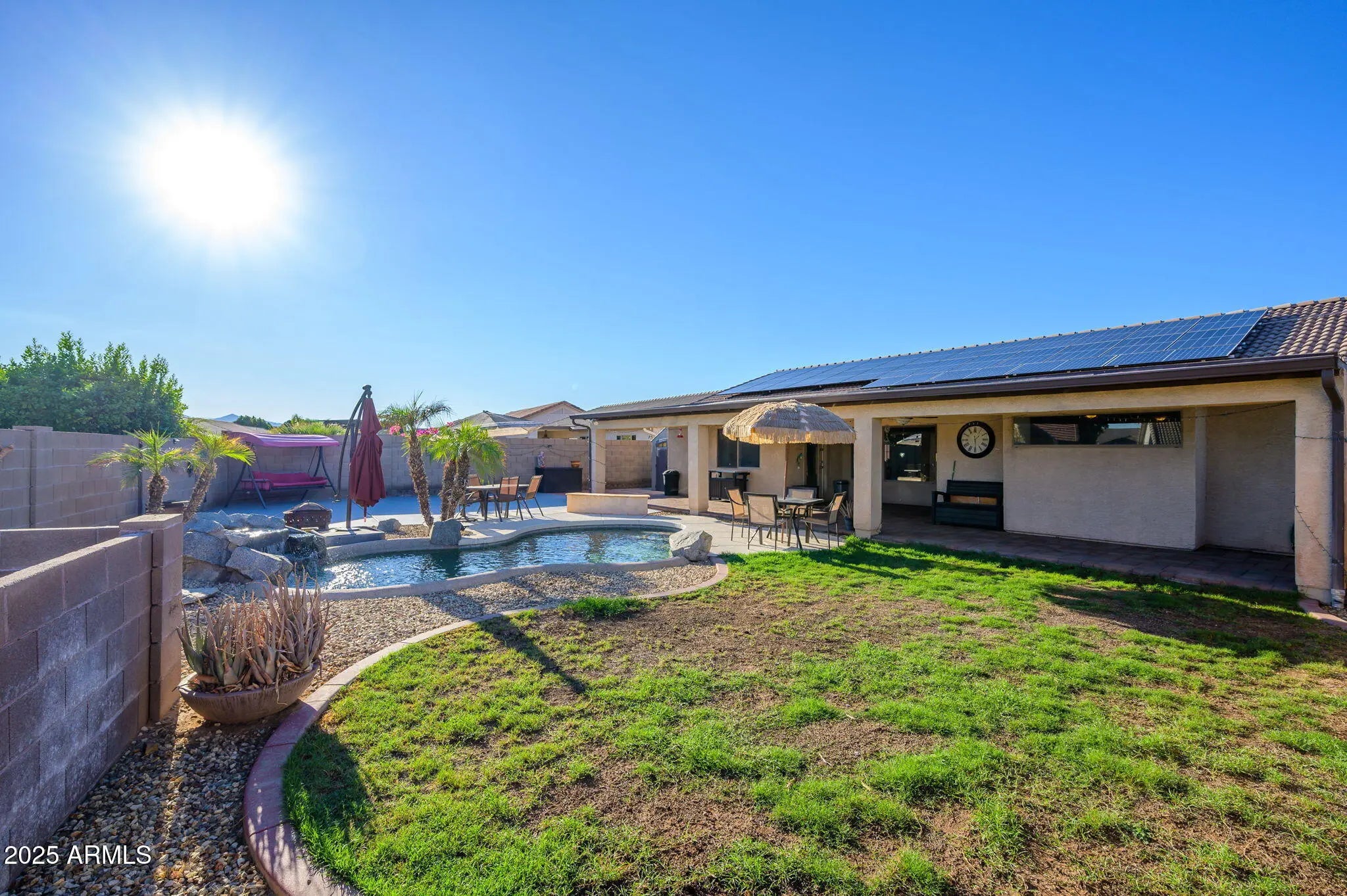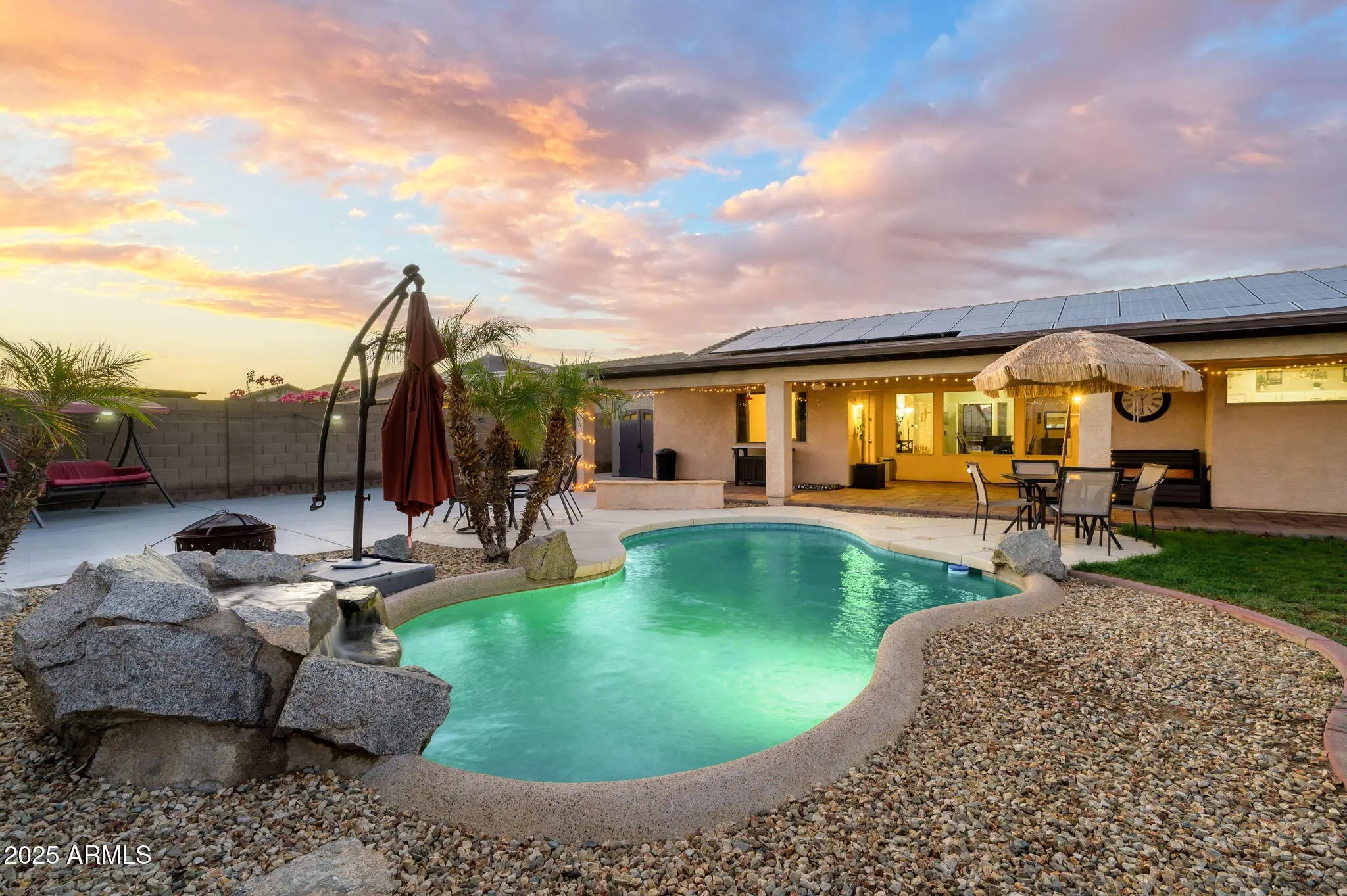 Perfect Move in Ready, 1 level, 4 bedroom home PLUS pool in Surprise!! Spacious great room with fireplace, vaulted ceilings open to a HUGE kitchen with island, stainless appliances plus dining room or office. Your master bedroom suite is split from the other 3 bedrooms and features vaulted ceilings, a dual sink vanity, separate tub and shower, a private toilet room and a huge walk-in closet. The resort-style rear yard is an entertainer's dream!!! Featuring a full rear patio with beautiful pavers, ceiling fans, a huge paved rear area for anything your heart desires PLUS a large side area and RV Gate (NO RV storage allowed). This wonderful corner lot is perfect for enjoying the beautiful AZ eves. HVAC 2025. Solar efficient! Seller offering 5K solar loan paydown or towards closing costs!