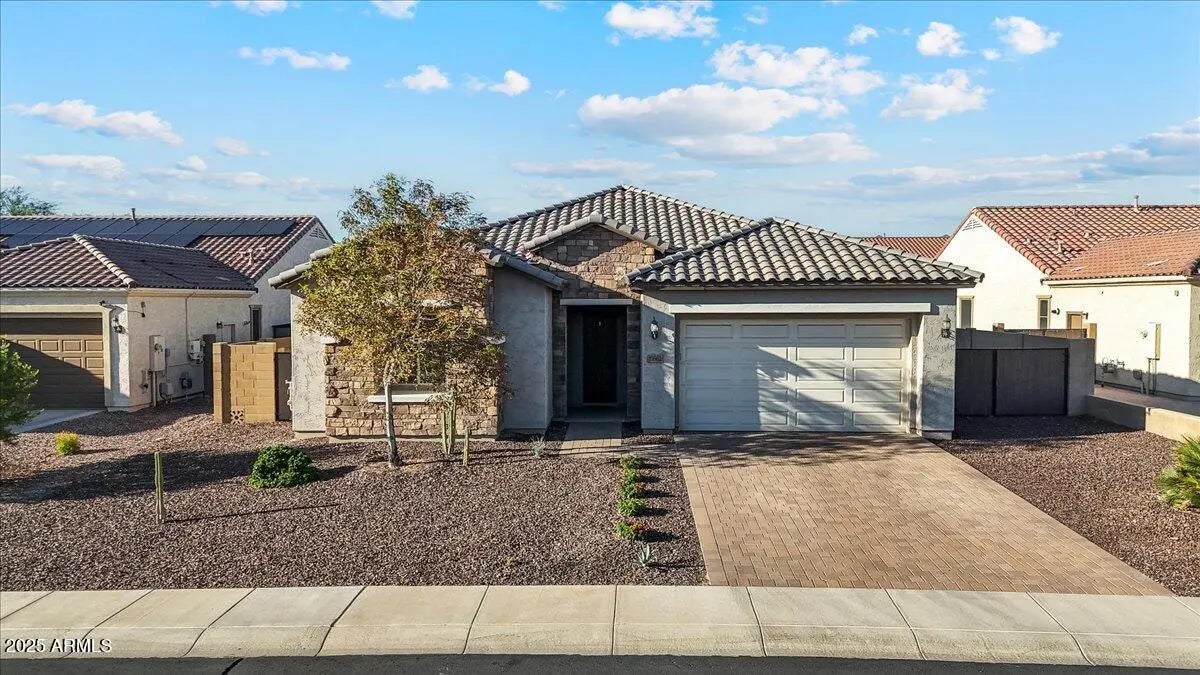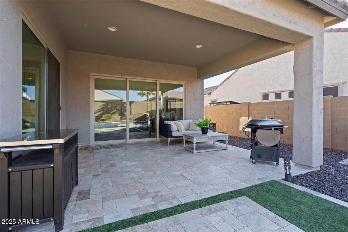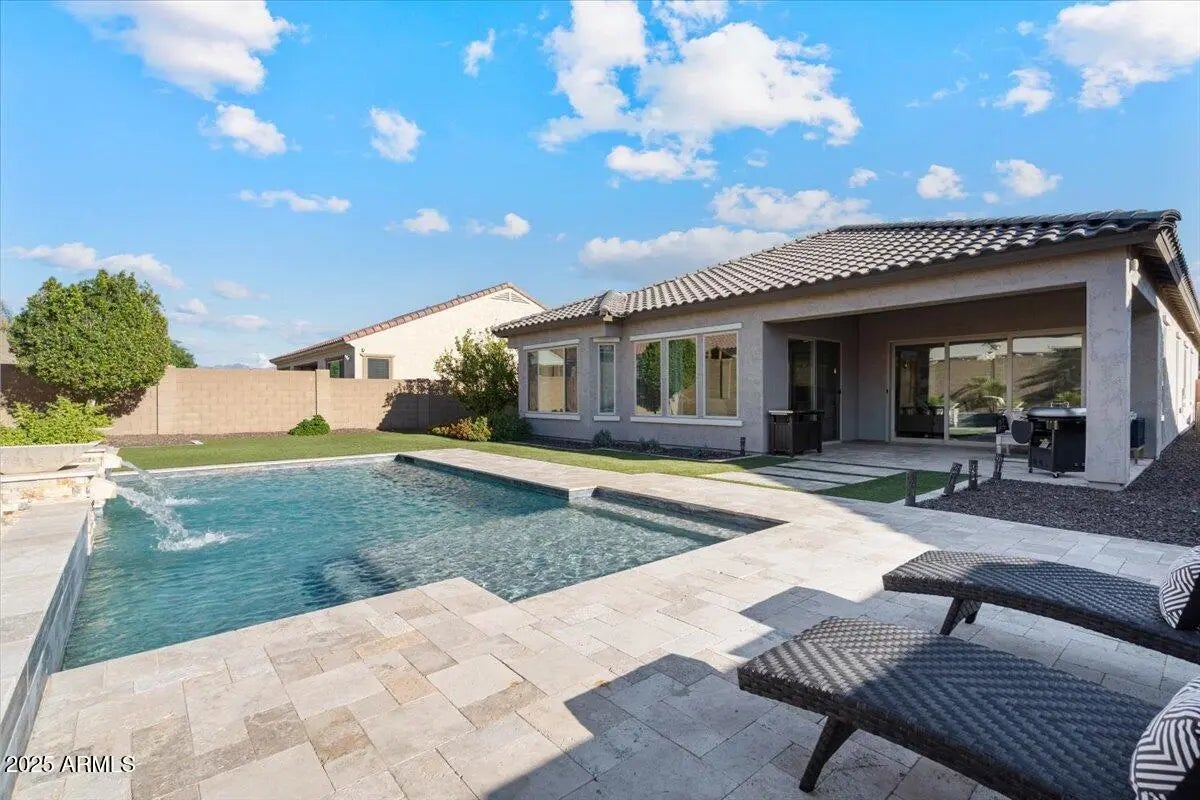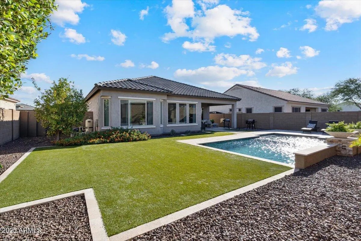 Experience refined Arizona living in this impeccably maintained luxury home. The expansive great room connects to the outdoors through a dramatic sliding glass wall, creating the perfect setting for entertaining or everyday living. The chef's kitchen impresses with an island, quartz countertops, S/S appliances, gas cooktop, wall ovens, & white cabinetry with glass accents. The split floor plan features two bedrooms & a full bath, while the primary retreat offers luxurious bath with dual sinks, quartz counters, & a walk-in closet. The den with Murphy bed provides the perfect flex space. Step outside to your personal oasis with a sparkling play pool, artificial turf, dog run, & RV gate. Soaring 10' ceilings, stylish finishes, & upgrades throughout complete this exceptional residence.