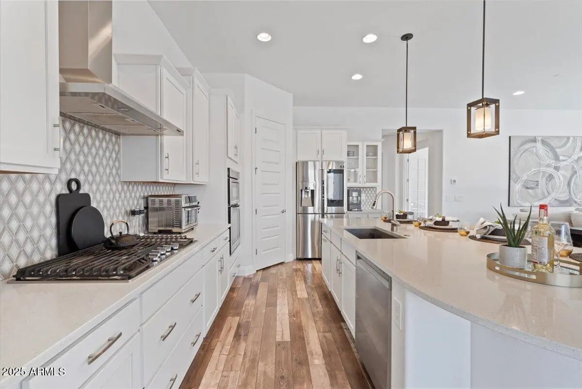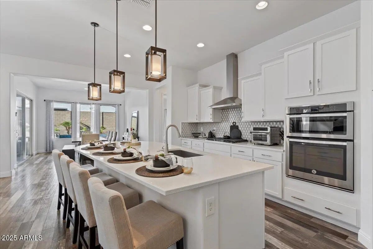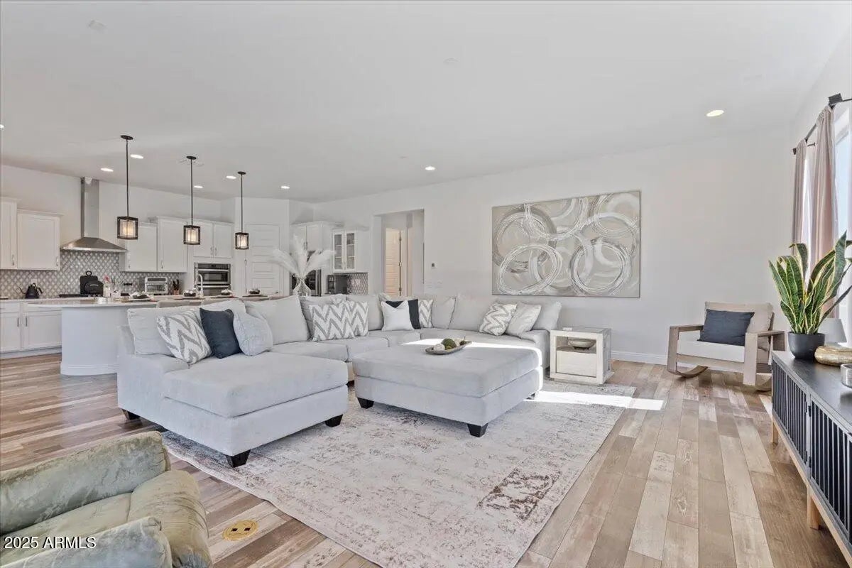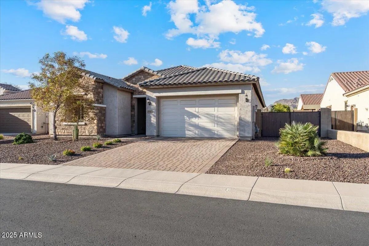 Experience refined Arizona living in this impeccably maintained luxury home. The expansive great room connects to the outdoors through a dramatic sliding glass wall, creating the perfect setting for entertaining or everyday living. The chef's kitchen impresses with an island, quartz countertops, S/S appliances, gas cooktop, wall ovens, & white cabinetry with glass accents. The split floor plan features two bedrooms & a full bath, while the primary retreat offers luxurious bath with dual sinks, quartz counters, & a walk-in closet. The den with Murphy bed provides the perfect flex space. Step outside to your personal oasis with a sparkling play pool, artificial turf, dog run, & RV gate. Soaring 10' ceilings, stylish finishes, & upgrades throughout complete this exceptional residence.