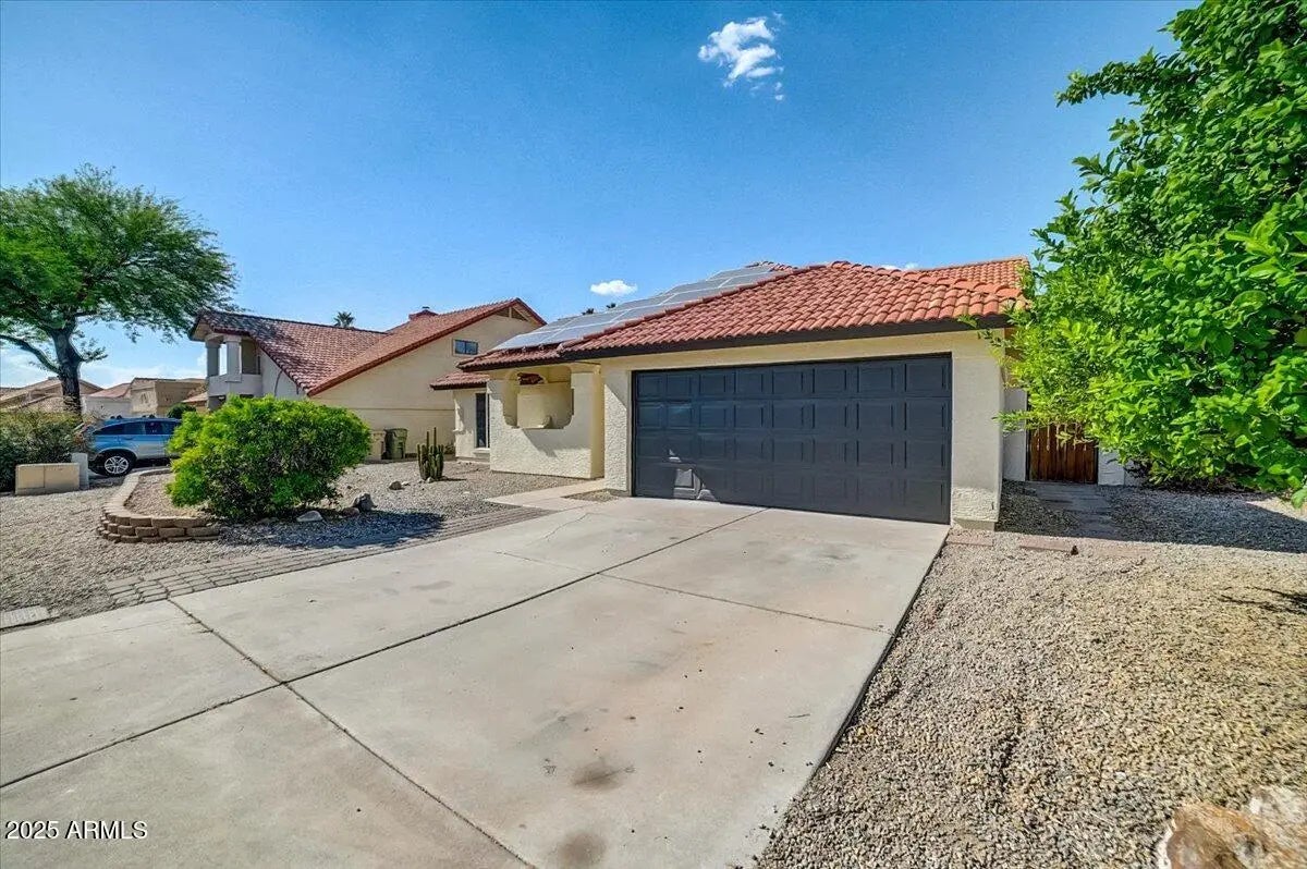 Nestled on a corner lot, this remarkable, fully-owned solar home offers 3 bedrooms and 2 bathrooms. The backyard is an absolute retreat, featuring a refreshing pool/spa combination, a covered patio, and a variety of mature fruit trees, creating a private, park-like atmosphere. Low-maintenance desert landscaping surrounds the charming curb appeal, and a spacious two-car garage adds convenience. Inside, the home welcomes you with soaring vaulted ceilings, a cozy fireplace, and neutral tones throughout. The chef-inspired kitchen includes walnut cabinetry with crown molding, granite countertops, a tile backsplash, a pantry, and stainless steel appliances. The large master bedroom boasts a walk-in closet and a beautiful en-suite bathroom with dual sinks, a separate tub, and a shower.