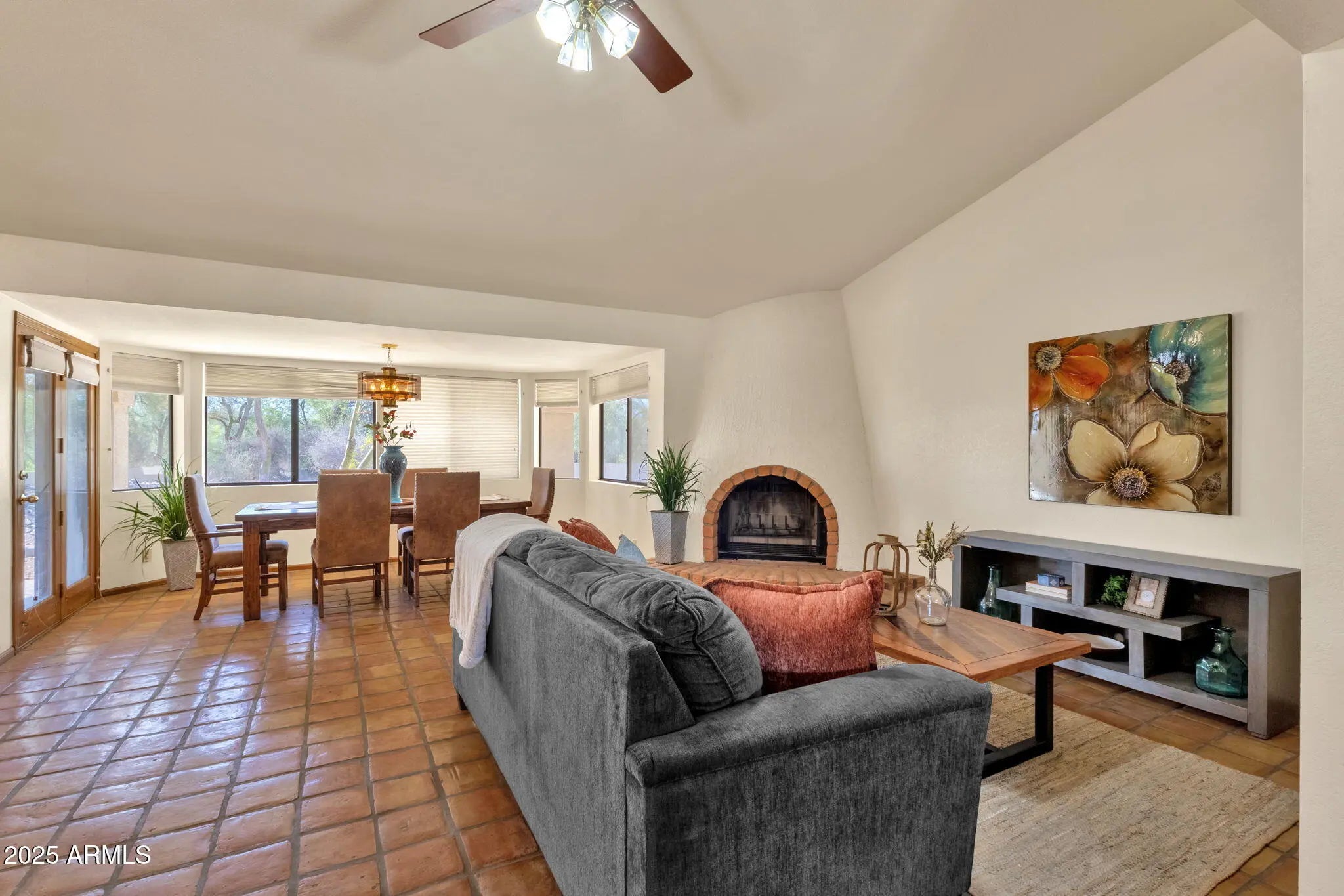 Welcome to this inviting 3 bedroom, 2 bathroom home offering both charm and functionality. As you enter through the private front courtyard you'll find a spacious floor plan that is enhanced by Saltillo tile throughout most of the home and a warm beehive fireplace in the family room. The kitchen is designed for both style and functionality with entertaining being the focal point - including black granite countertops, stained cabinetry, a large center island with sink, stainless steel appliances, eat-in dining area as well as a separate formal dining room! Don't miss the Arizona Room opening to the large, fenced backyard featuring a sparkling pool and spa, all backing to a natural wash for added privacy. This home features a split bedroom plan with exterior exit from secondary bedroom. Additional highlights include an RV gate with parking pad, a 3-car extended garage, water softener and no HOA! Located close to Fountain Hills High School as well as local shops and restaurants, this home is ready for its next owner's personal touch!