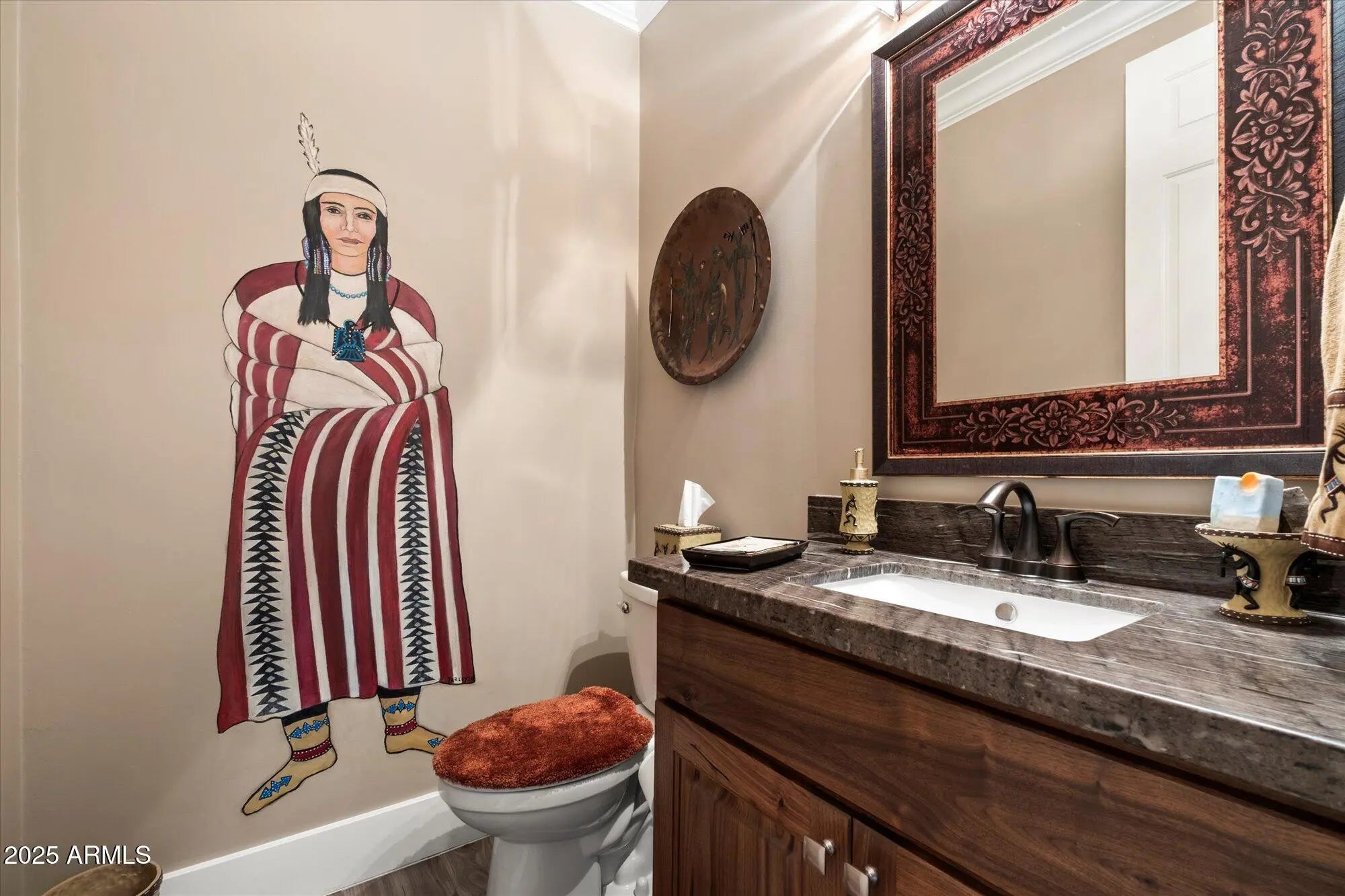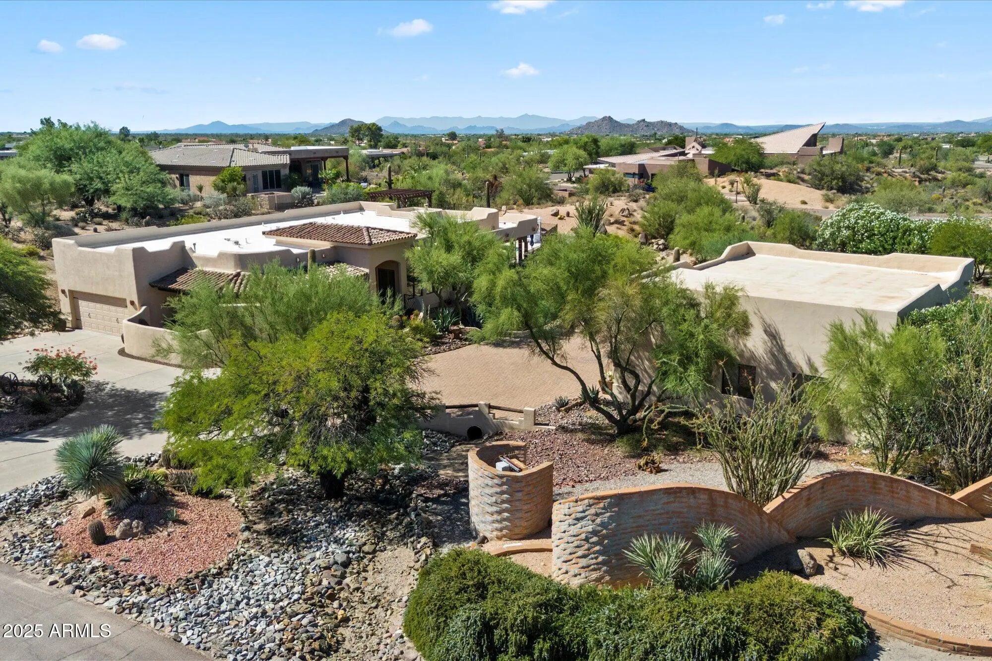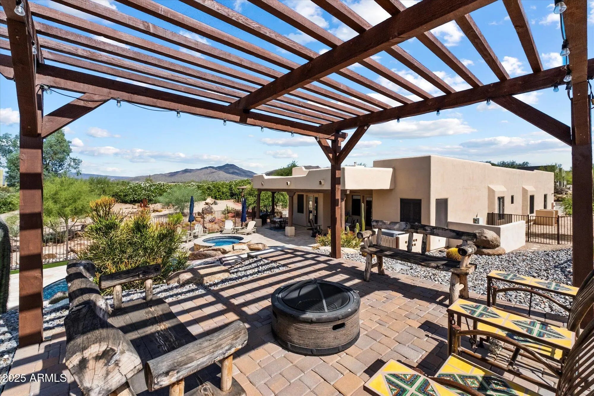Seeking garage space for an RV, workshop, or toys? A luxurious pool and spa? A beautifully updated Santa Fe-style custom home on an acre with mountain views? This Carefree gem checks every box. Located in the town of Carefree, this home blends Southwestern charm, modern comfort, and exceptional functionality with unforgettable sunsets. Step inside to a wonderfully updated 3 bedroom, 2 1/2 bath home with an attached 2 car garage and a detached 1,280 sq ft RV garage. New wood-look tile floors, 8'' base boards, crown molding, custom paint, plantation shutters add warmth and character. The spacious family room with a cozy fireplace and the inviting living room with a wet bar provide ideal spaces for relaxing or entertaining. At the center is a chef's kitchen, highlighted by rare knotty walnut cabinetry, dramatic granite counters, tile accents, a breakfast bar and an open dining area with custom glass chandelier. The primary suite opens directly to your private backyard oasis and includes a generous walk-in closet and updated bathroom. Two additional bedrooms share a Jack-and-Jill bathroom with a masterfully tiled walk-in shower. One room has a Murphy bed allowing office/guest flexibility. A charming powder bath boasts a custom Native American mural, and the granite-topped laundry room with utility sink adds everyday convenience. The outdoors has been artfully and professionally updated as well. The private courtyard welcomes guests, while the backyard is a true retreat with a pristine saltwater pebble-sheen pool featuring sea turtle mosaics, a slide, waterfall, and heated spa. Multiple patios and gazebos are perfectly placed for entertaining and taking in the desert garden, mountain views and sunsets. A smart surround-sound system extends entertainment inside and out. Car enthusiasts and hobbyists will love the massive detached 1,280 sq ft (40'x 32')RV garage built of block with a 12' RV and 10' double doors, water and 220v service. It also has an enclosed workshop with a separate entrance, covered patio, and heat pump. With easy access and plenty of room, the detached garage can house a full-size RV and multiple trucks or converted into a casita with RV garage (renderings available). The entire house was updated in 2020 and more recently the roof (2024), exterior painting (2025), pool and spa (2022), landscaping (2024). All this, located minutes from world-class golf, hiking and biking trails, Bartlett Lake, Tonto National Forest, and Carefree and Cave Creek's renowned dining, shopping and art festivals. Low taxes: $1,875 yr & Low HOA fees: $60 year. This home has it all: luxury, function, and the space to live the Carefree lifestyle to the fullest. Check out the the matterport tour of the home under pictures as well as the video website.