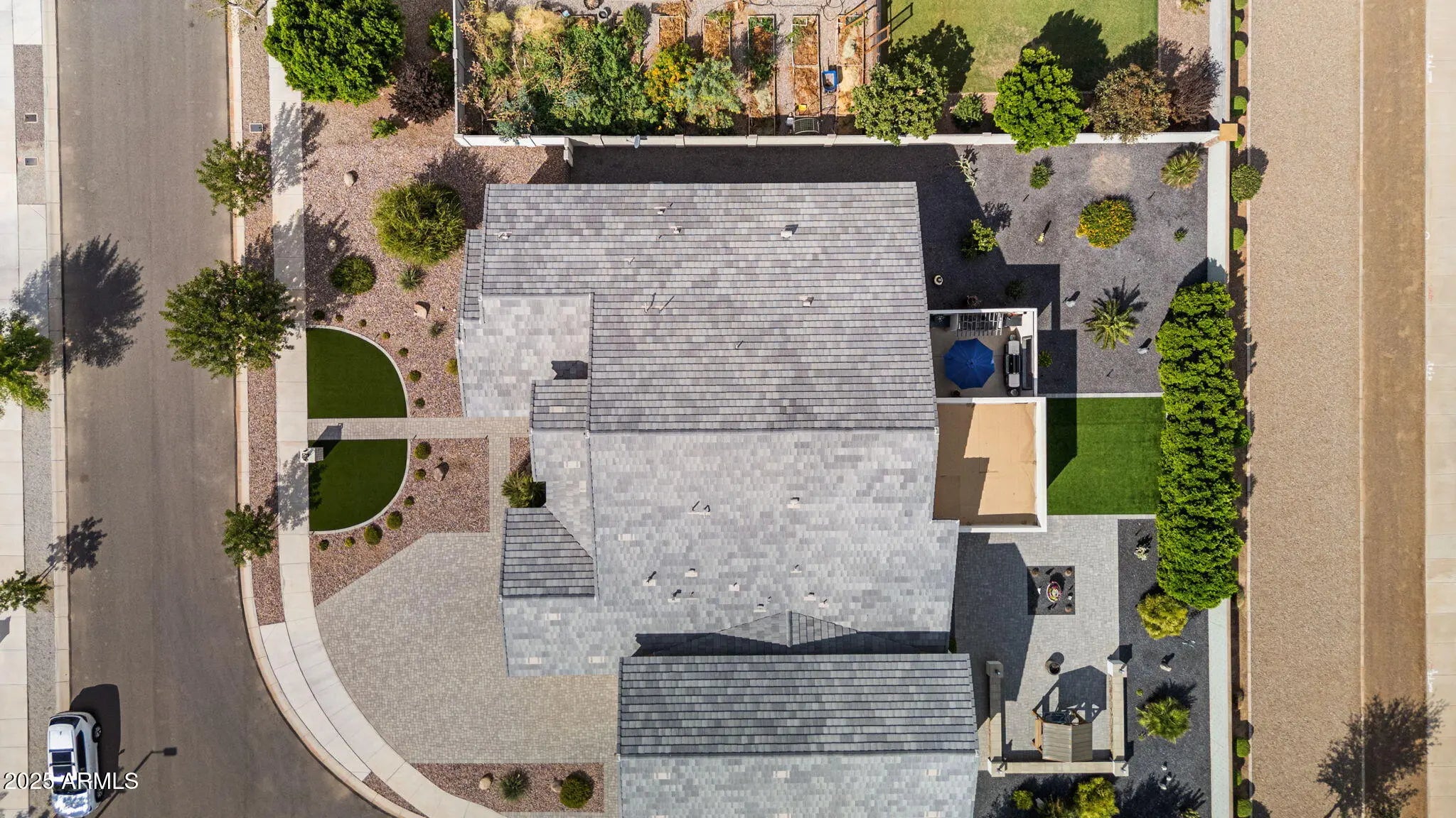 This incredible 5 Bedroom plus office, 3 1/2 bath home is located in Paseo de Pecans and offers one of very few homes in Queen Creek with a 22' x 50' RV Garage (that can hold 4 cars) plus additional 2 car garage and has an RV gate and is situated on a fantastic corner lot at the end of a cul-de-sac. The heart of the home showcases a gourmet kitchen with a generous island, beautiful Schrock cabinets, granite countertops and elegant tile backsplash. Quality appliances include a built-in refrigerator, gas range, and double oven configuration. You'll appreciate both formal dining and casual eat-in kitchen options, complemented by a butler's pantry and spacious walk-in pantry for effortless organization. Throughout the home, discover eight-foot interior doors, sophisticated two-tone paint, feature walls and carefully selected upgraded fixtures. The primary suite offers a serene retreat with a luxurious soaking tub, walk-in glass shower, separated vanities with abundant storage and a generous custom walk-in closet. This home offers a split floor plan with the other four additional bedrooms, all with walk in closets, located on the other side of the home from the Primary suite. The first bedroom offers an ensuite, two additional bedrooms share a jack and jill bathroom and the fourth bedroomm, currently being used as a theatre room as it is an oversized bedroom, has a half bath just down the hall from it. There is also an office that could easily be used as a sixth bedroom. A stunning sixteen-foot glass pocket door spans the back of the home, creating seamless flow between indoor and outdoor living spaces. The backyard beckons with an extended covered patio, pavers leading out to a relaxing seating area and extra space perfect for entertaining with mature ficus trees providing great privacy. This 17,000 square foot lot has plenty of room to add a pool or customize it to make it your own. Do not miss this fantastic Queen Creek home!